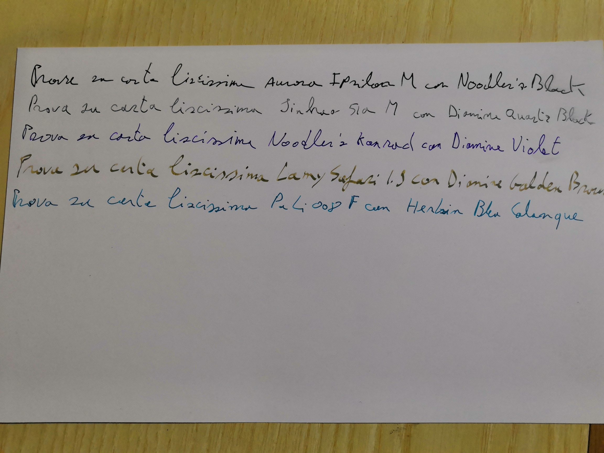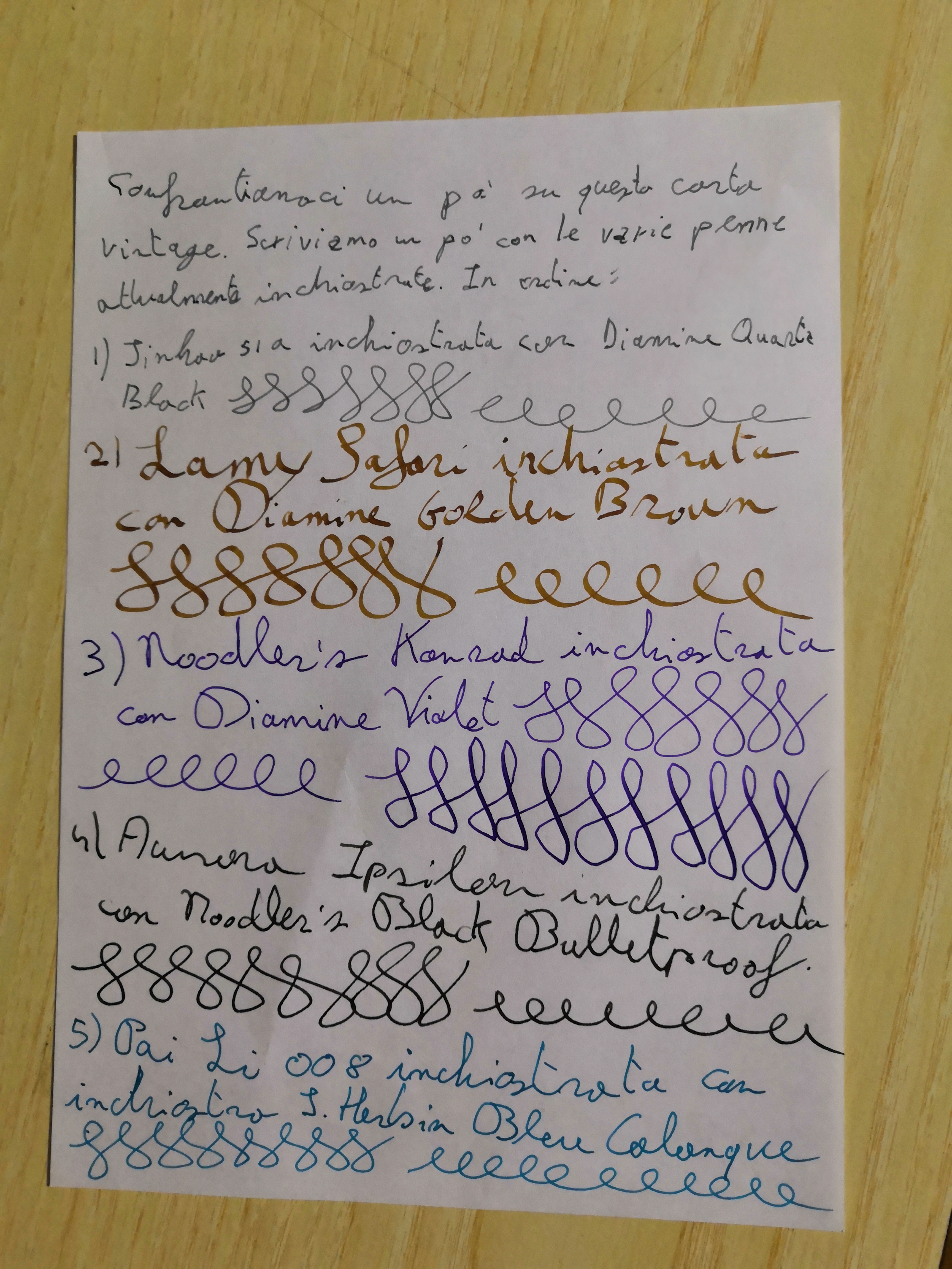 Salve a tutti. Ho trovato per caso per casa, da cui il titolo, queste carte su cui mi sono divertito un po' a scrivere con le stilografiche che ho inchiostrate attualmente. La prima è semplicemente il retro del foglio di accompagnamento di una scatola portaorologi. La carta, a dir la verità quasi plastica per quanto è spessa e liscia, è fantastica per dar vita alle sfumature di colore intrinseche degli inchiostri. Unico neo, ci mettono una vita ad asciugarsi, l'inchiostro rimane in superfice, la carta ha quasi uno strato lucido, come si può notare, nemmeno l'inchiostro Noodler's Black è esente da sbavamento, neanche giorni dopo esservi stato posato.