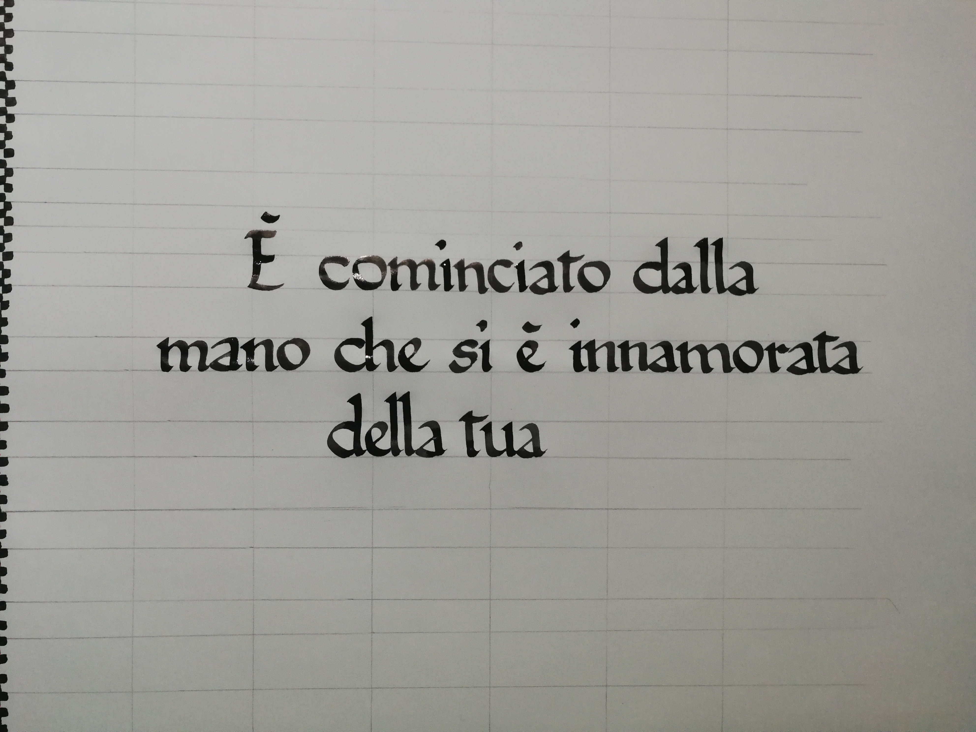 Non entro nel merito dello stile (mi sembra un foundational con delle varianti, ma è uno stile che non pratico). Piuttosto segnalerei di fare attenzione alla spaziatura fra le lettere che, mi sembra, sia migliorabile; per esempio: la doppi "l" di "dalla" (un po' troppo ravvicinate) è comunque meglio della doppia di "della"; nelle "in" la "i" è troppo vicina alla "n". In generale nell'incontro fra due linee curve lo spazio è minore che fra una curva e una dritta, che a sua volta è minore che fra due dritte.