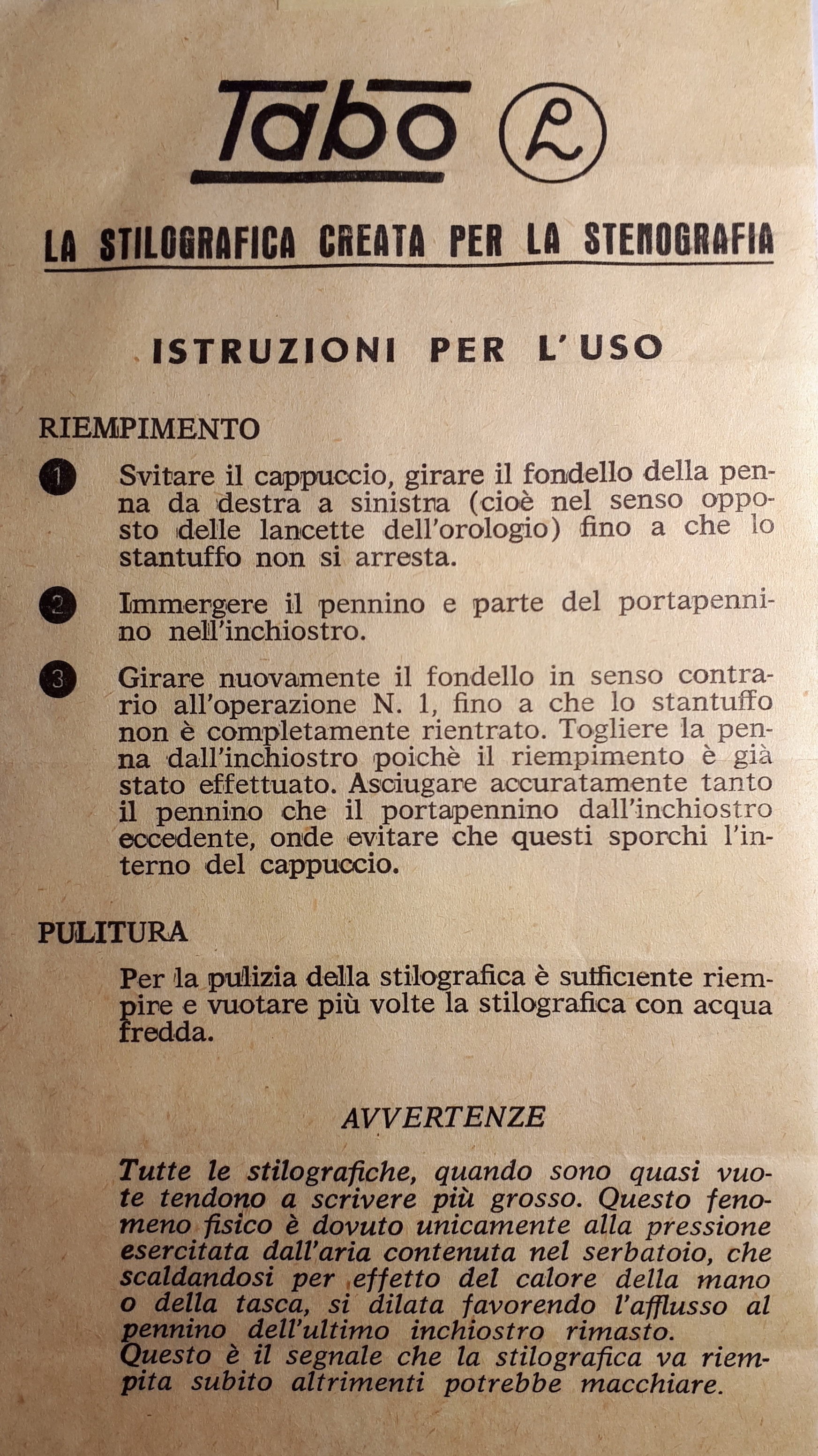 al recente Pen Show di Bologna avevo portato con me una Tabo per stenografia (desideravo porla all'attenzione dei Maestri), la stessa mostrava poca fluidità nel movimento del pistone e perdita dal fondello. Dispone di un pennino flessibile, credo EF, difficile (per me) la sua gestione. Credo mai utilizzata, ritenevo meritasse un ripristino.