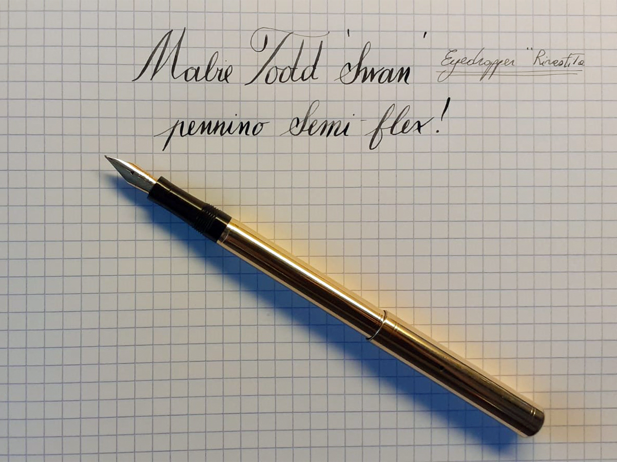 Made in England, ma come per molte penne Mabie Todd è equipaggiata con un pennino in oro 14Ct N.Y. No.2 di produzione americana molto flessibile, tratto di partenza extrafine ma estremamente scorrevole, complice il flusso abbondante che una qualsiasi vintage eyedropper può avere. Tuttavia ho buona ragione di credere che il pennino originale sia stato sostituito perchè sul fondello (difficilmente fotografabile) si riesce a leggere bene la scritta "M. BRD", che secondo le pubblicità dell'epoca corrispondeva ovviamente alla gradazione medio-broad che la Mabie Todd produceva. In questo momento è a riposo nella rotazione ma è stata carica fino alla fine delle festività natalizie e l'ho adoperata per scrivere alcuni biglietti di auguri.