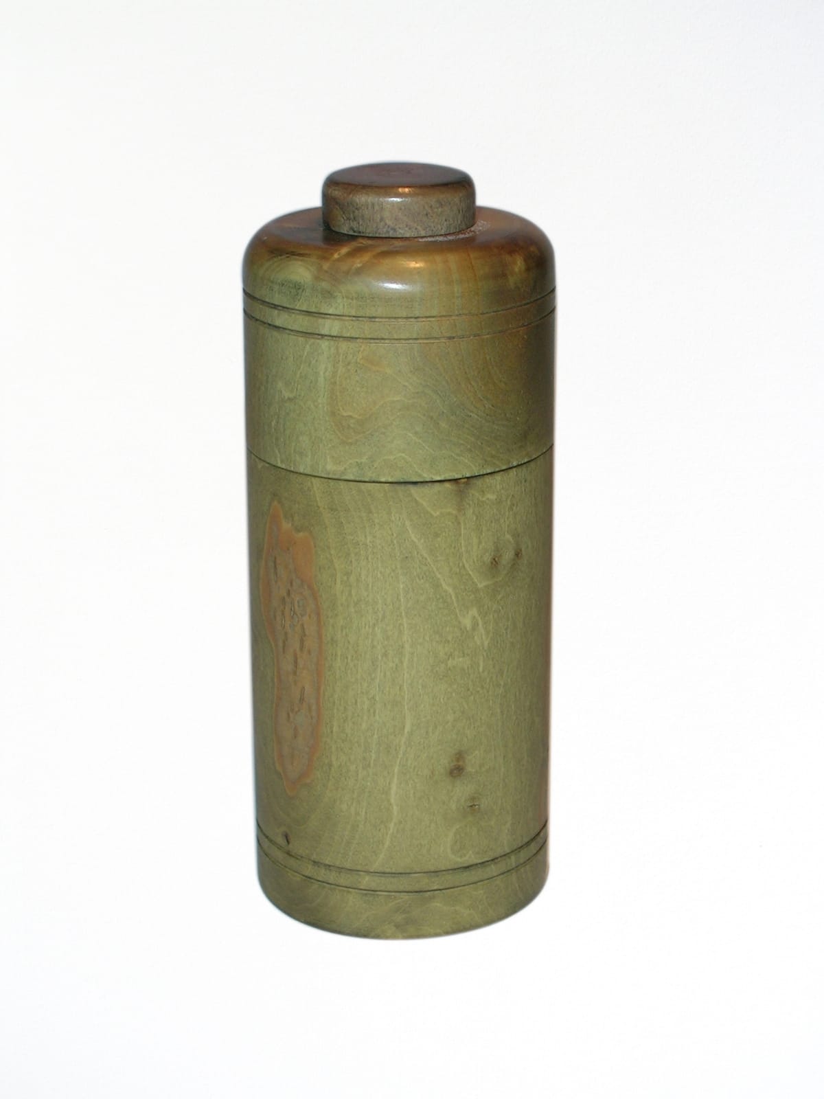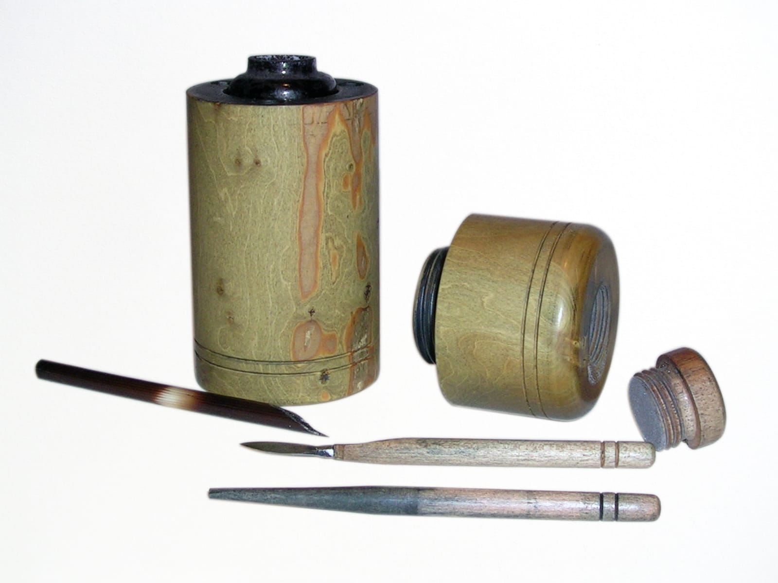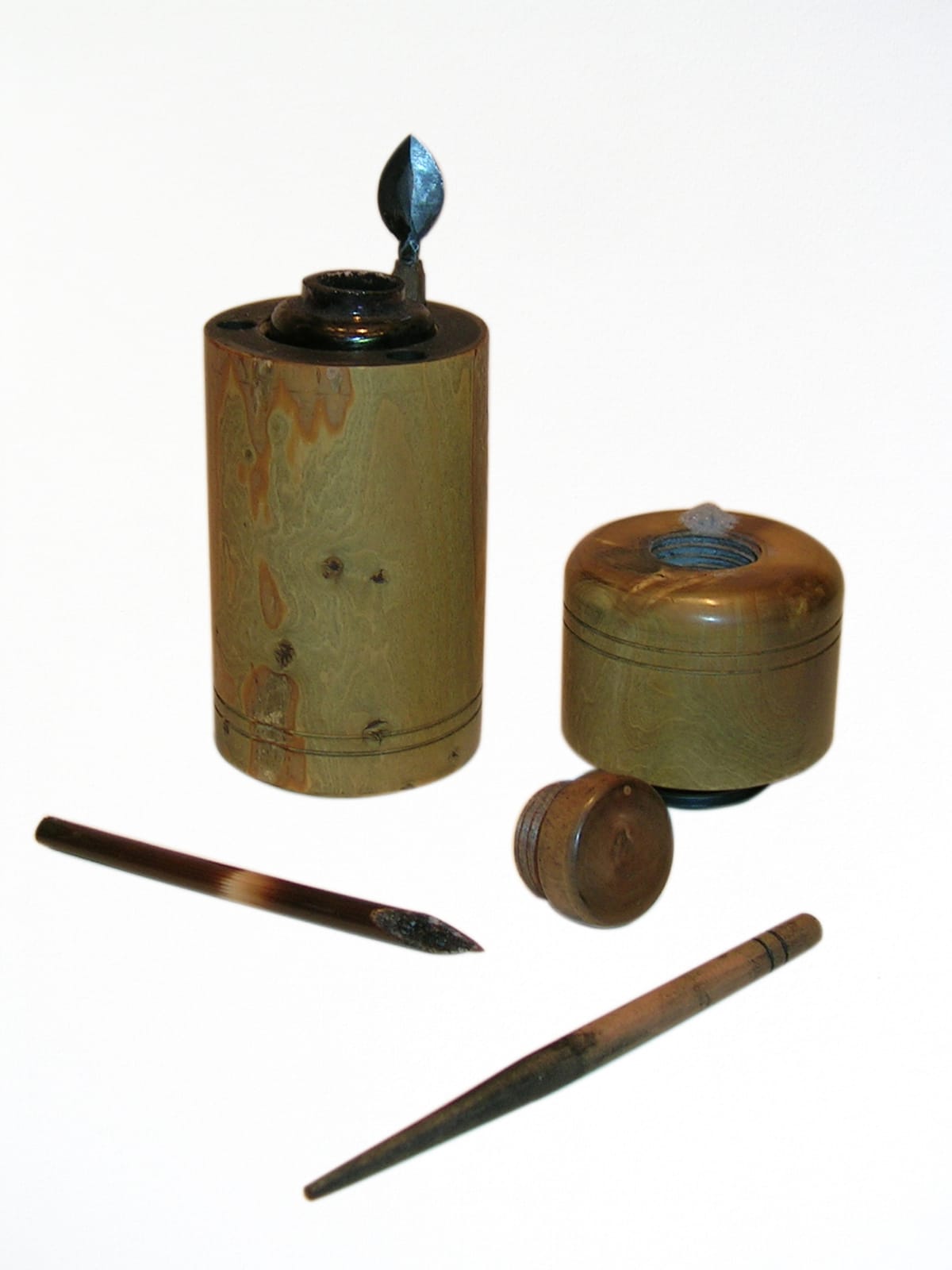 Penner in bosso con calamaio in vetro, porta pennino e taglierino dello stesso legno. E sandracchiera nel cappuccio.