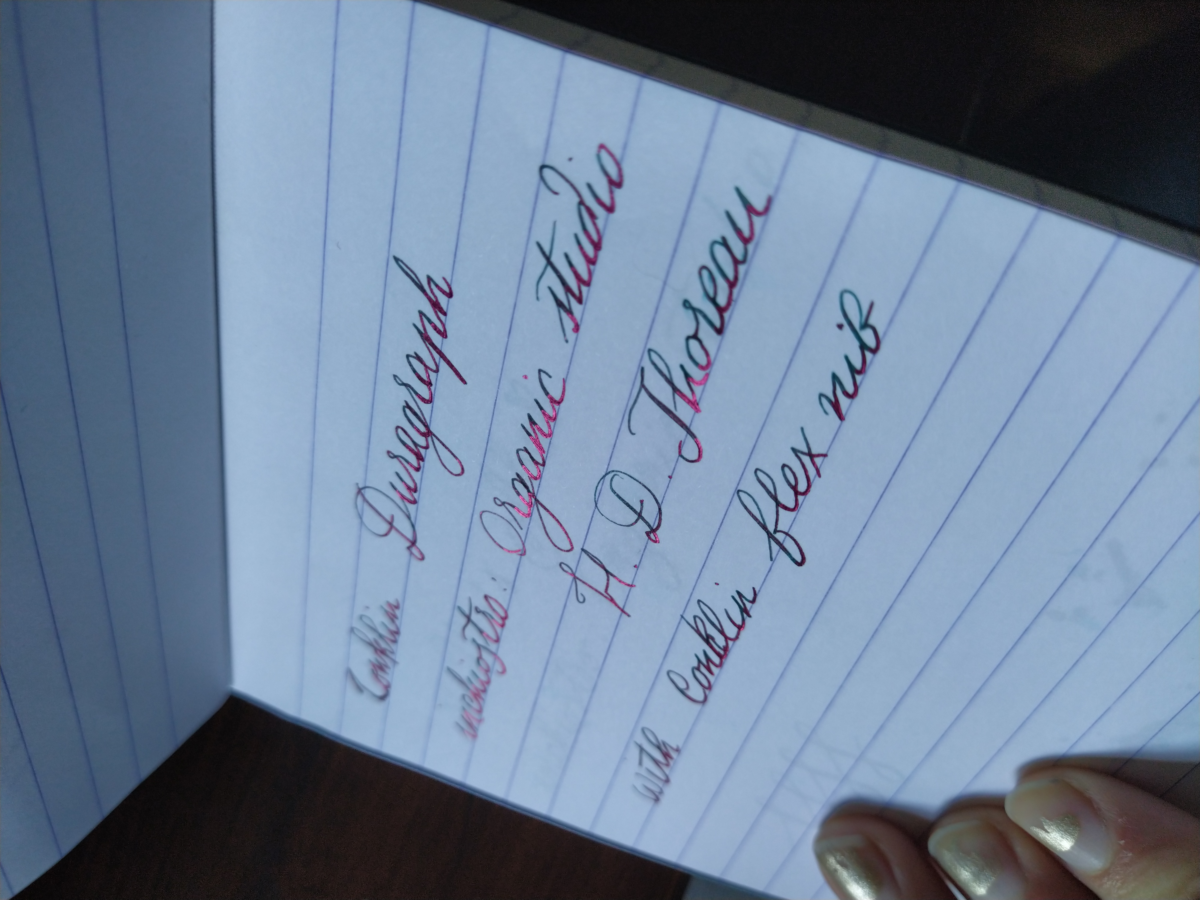 Ti allego una prova del Thoreau su carta Rhodia! Tende a lasciare i binari, ogni tanto, il pennino flex della Conklin non è un granché ed è piuttosto duro. Ma va bene per giocarci! ✨ L'inchiostro, come pure il Waldwn, è magnifico. Peccato però che sfuma molto facilmente: su un taccuino Rhodia ho notato che basta una ditata anche su inchiostro più che asciutto Perù lasciare strisciate verdi!