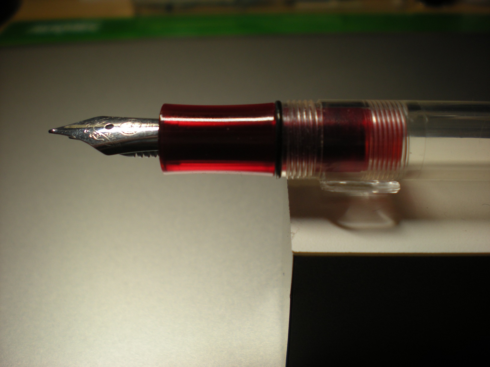 come potete vedere nella seconda foto il diametro dell'anello è maggiore di quello della filettatura del corpo penna per cui si deve forzare un po' per avvitare il cappuccio. Il problema si presenta quando si svita il cappuccio dal momento che l'anello fa' atrito e non permette alla sezione di ruotare,praticamente si svita solo il corpo con l'inevitabile fuoriuscita dell'inchiostro.E' meglio il grasso di silicone e/o sostanza similare oppure quelche giro di teflon senza esagerare. Rimane solo il problema estetico se uno usa la trasparente.