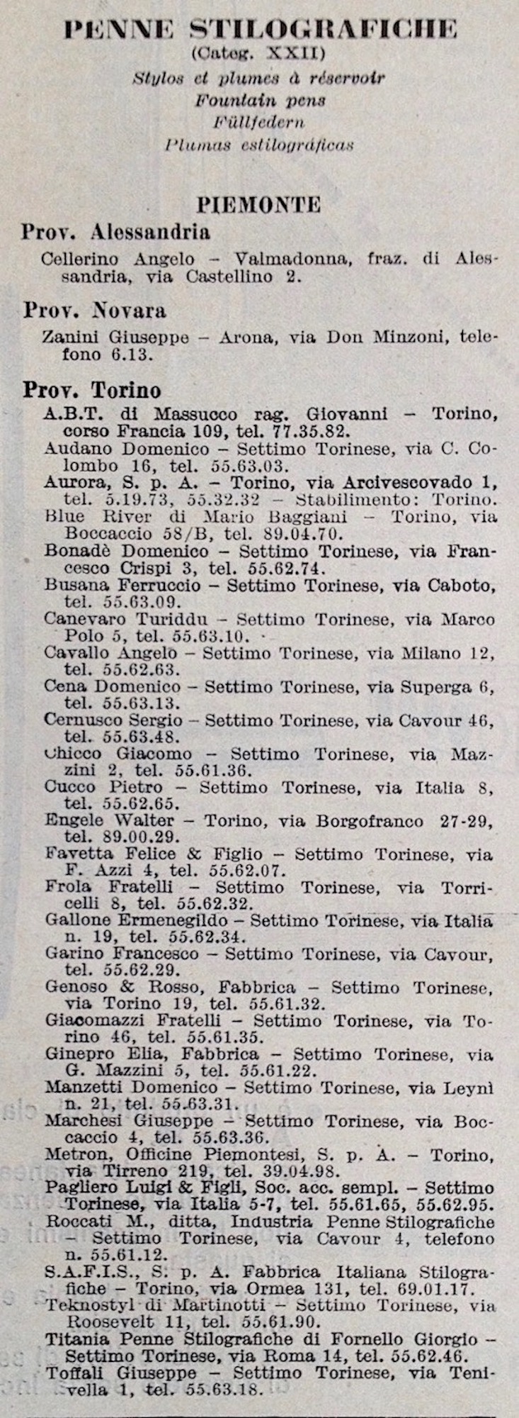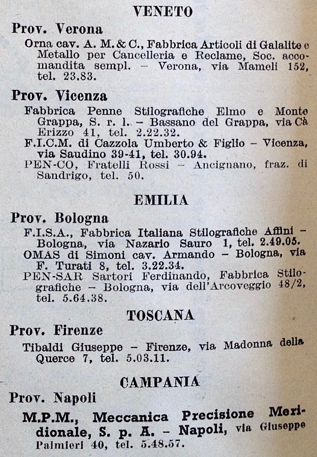 Una prima risultanza interessante della lista è che la F.I.S.A., che dovrebbe essere la ditta da cui nasce la Stiassi e Tantini, che era propriertaria del marchio Tabo, è quella che compare come produttore di stilografiche a Bologna.