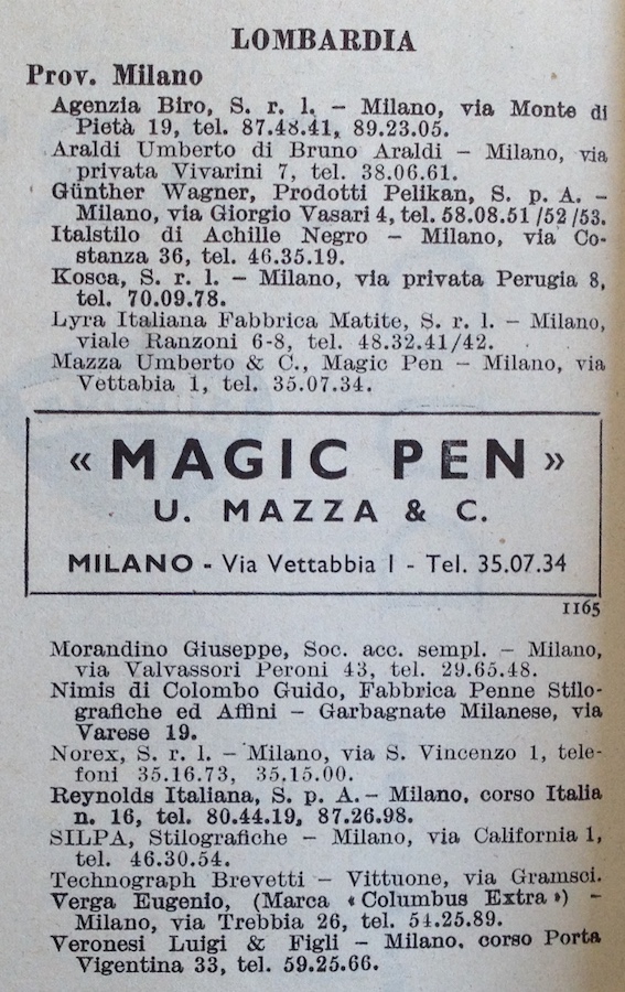 Quello che dal punto di vista storico mi ha subito colpito è la nota intraprendenza dei milanesi, Il Mazza è l'unico produttore ad aver pagato per avere un rettangolo in evidenza, e l'ultimo acronimo della lista : M.P.M. Ignoro totalmente cosa queste meccaniche di precisione abbiano mai prodotto.![]()