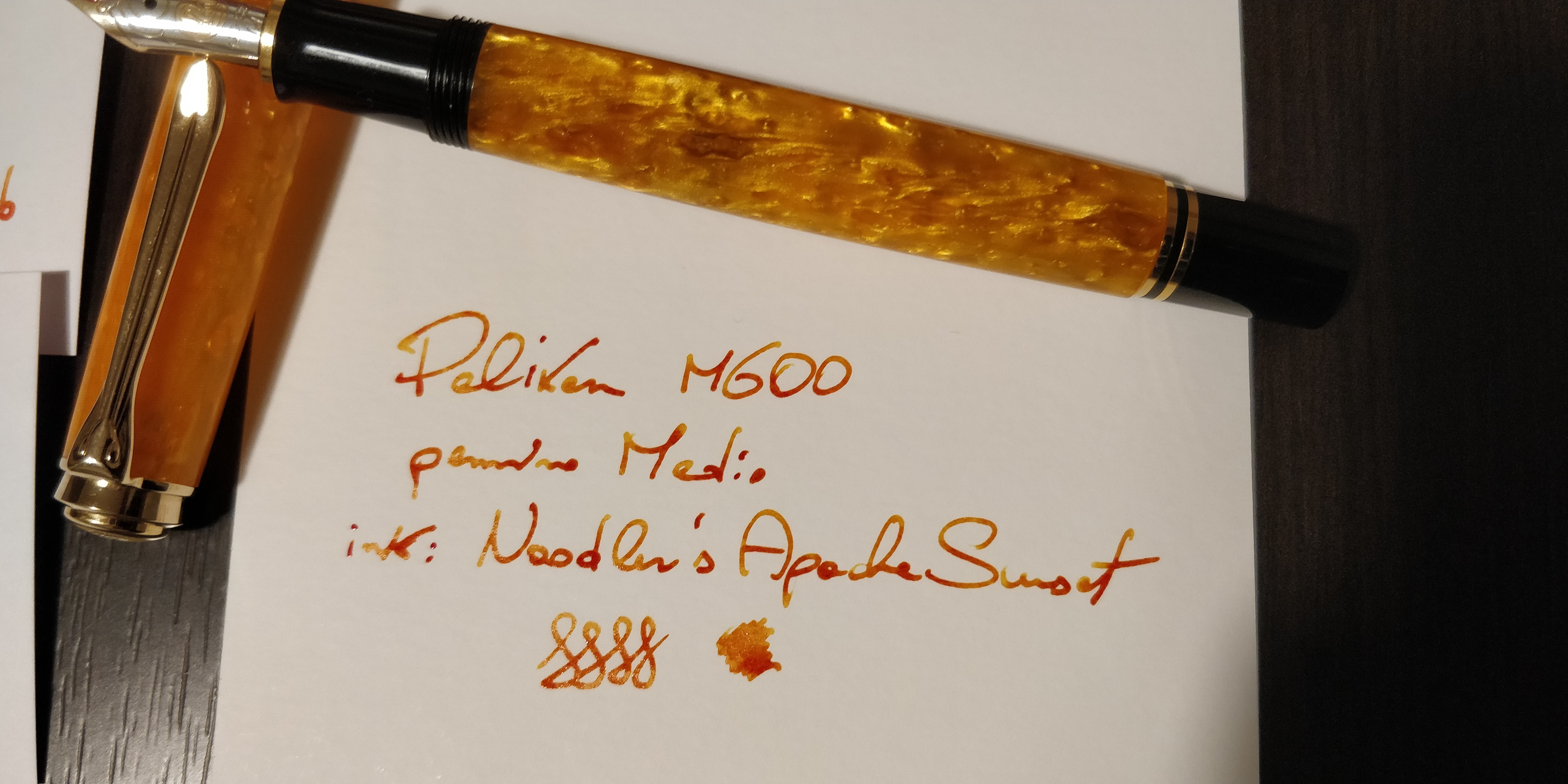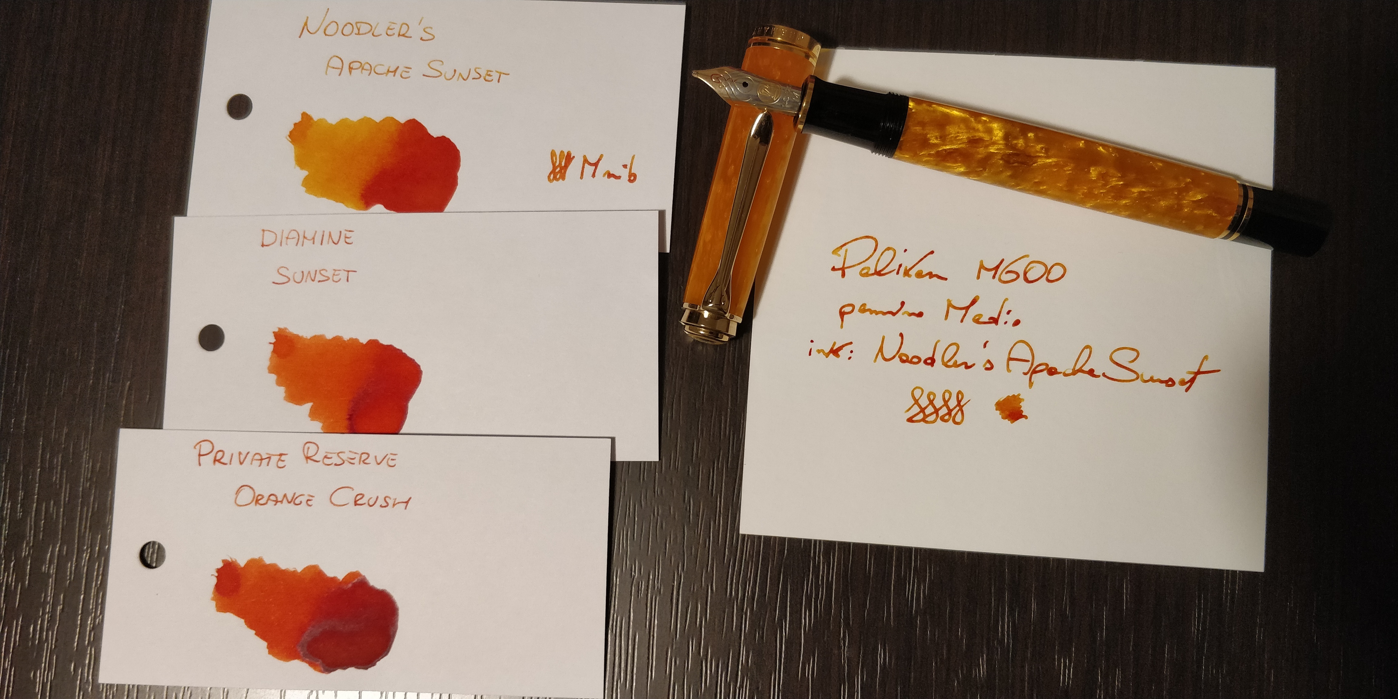 Nel frattempo, ecco una foto velocissima per vedere come si presenta con il Noodler's Apache Sunset. E poi qualche altro arancione a confronto.