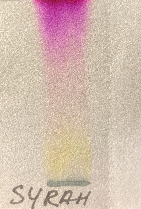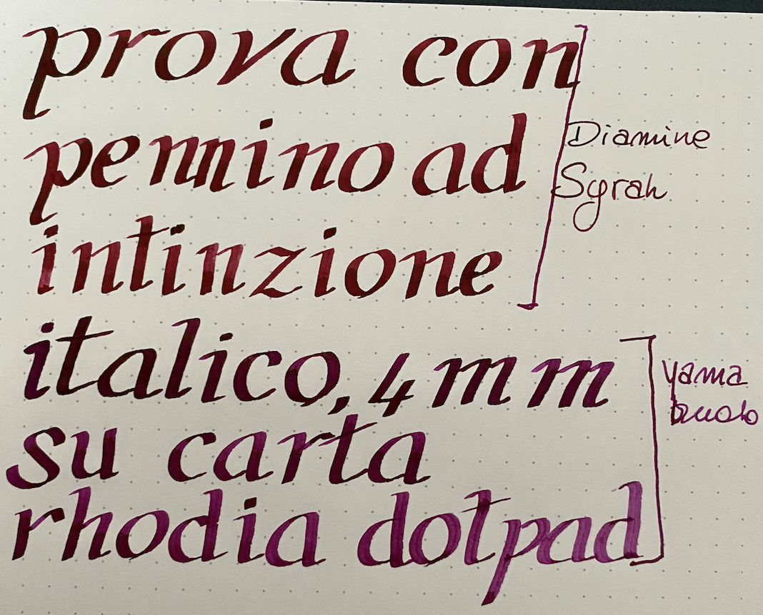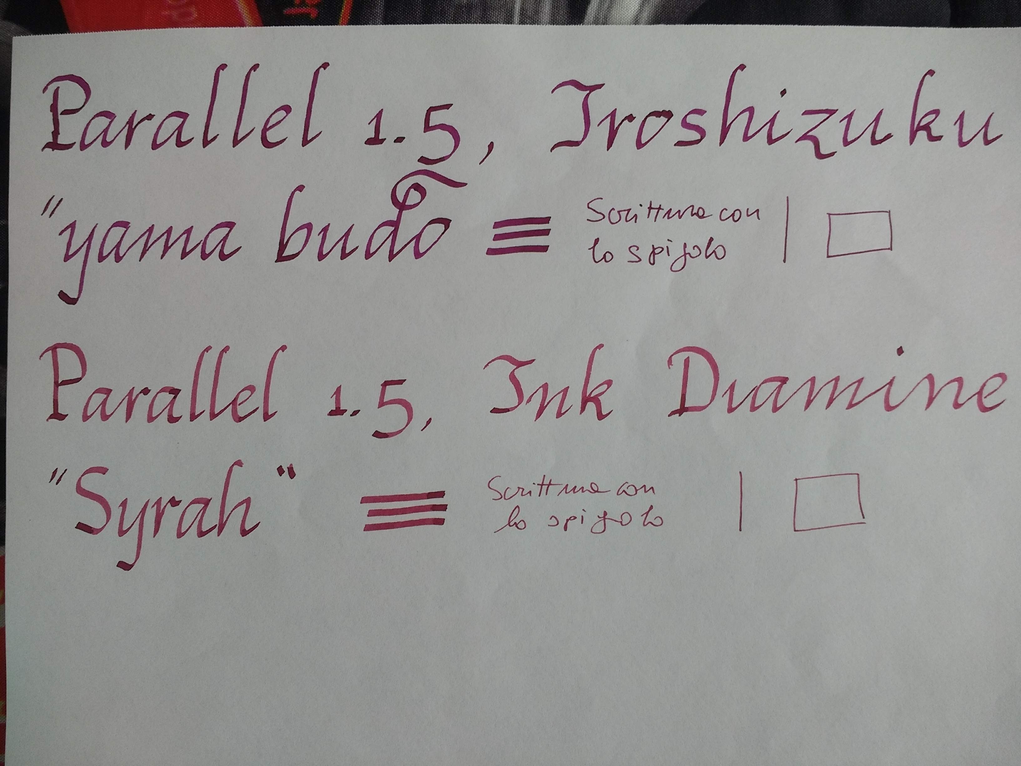 Grazie della recensione, su un tema che mi interessa moltissimo. Io ho due inchiostri sul magenta e come modesto contributo allego la mia foto comparativa, fatta con il cellulare alla buona. Non so cosa trasmetta la foto, ma alla vista il Syrah (che avevo comperato come sostituto dell'ormai terminato Yama Budo) è un pochino piú sbiaditello. Carta Rhodia #18 e la solita parallel 1.5