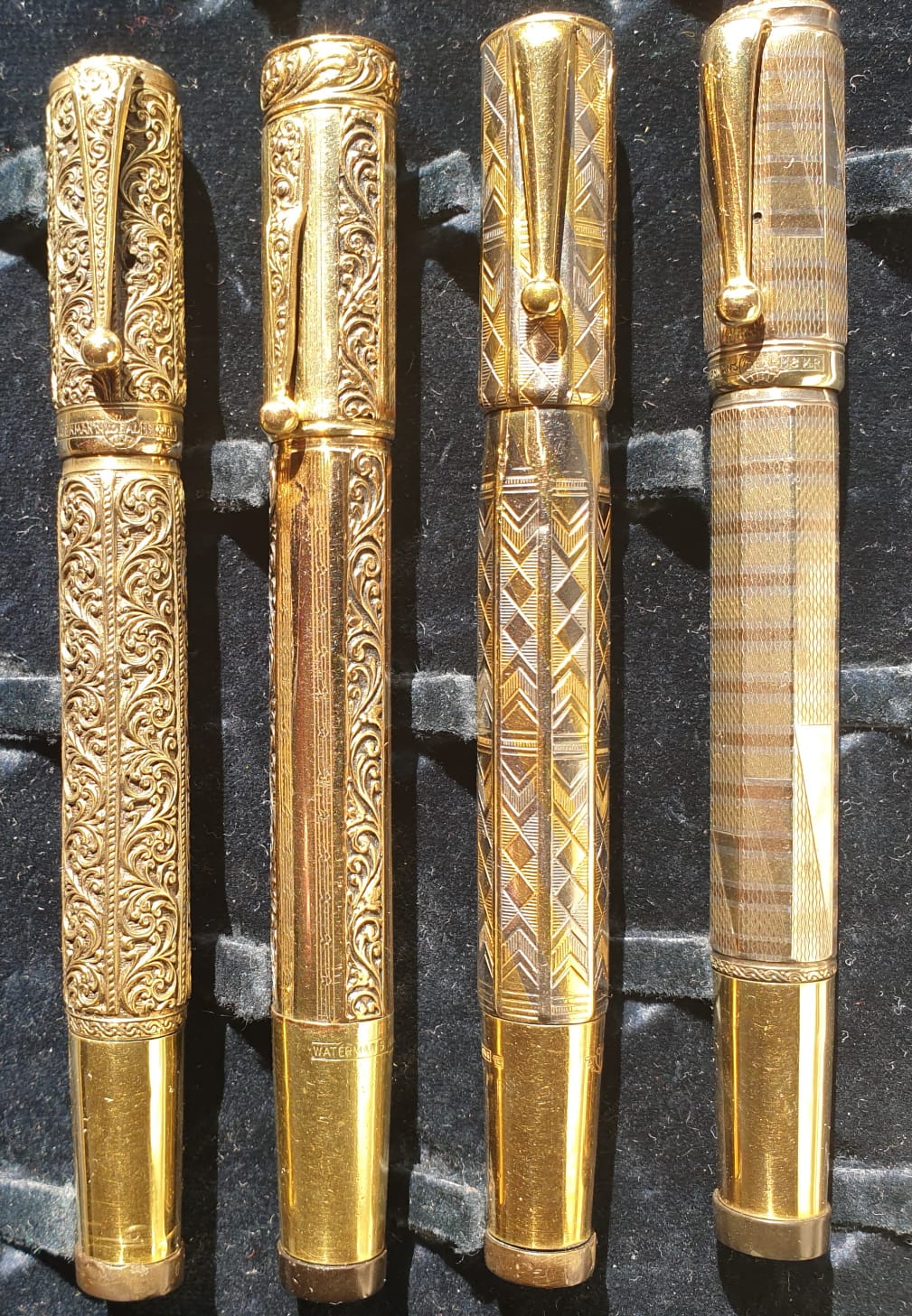 Quattro classiche, splendide rientranti Waterman's 42 laminate, anni ‘20/‘30 del secolo scorso. Le due a destra in oro giallo, bianco e rosa.