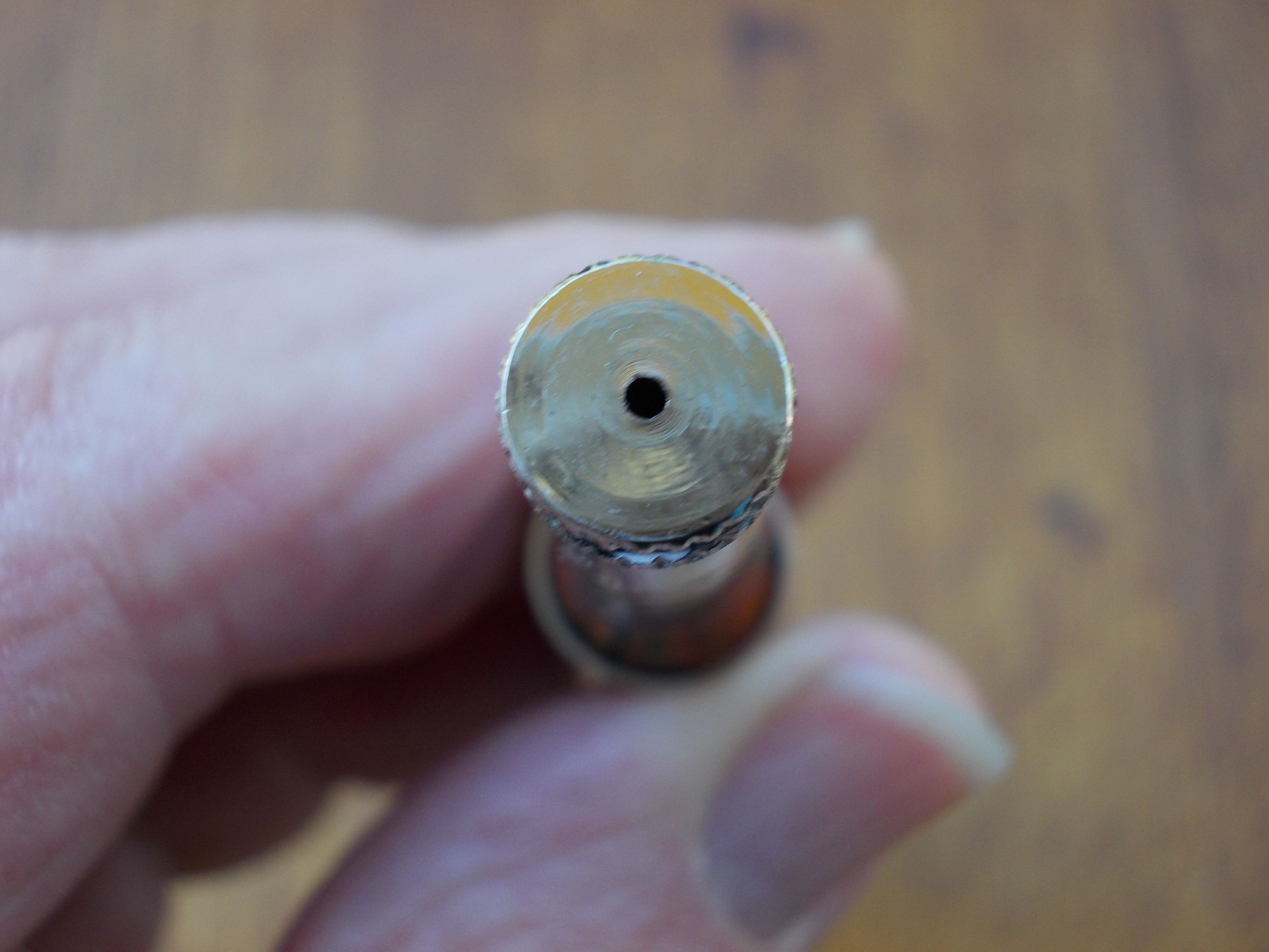 6. Infine per chiudere la penna, dopo qualche frazione di secondo, si riabbassa lo stantuffo con il foro di sfiato ben aperto. E' consigliabile fare quest'ultima manovra con la penna sollevata sul calamaio aperto, a scanso di sgocciolamenti (non mi è mai successo).