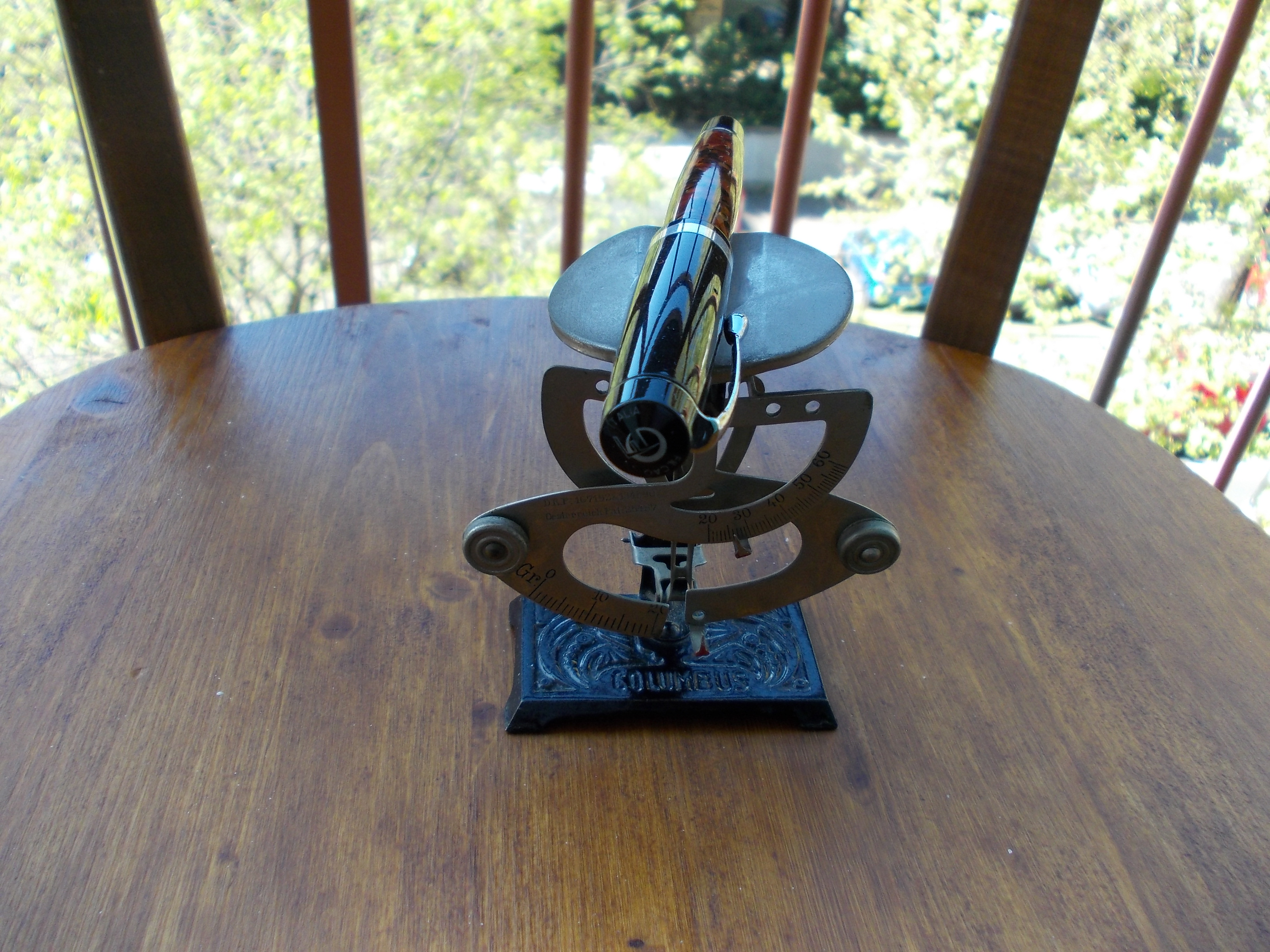 E' una penna dalla linea classica, elegante e ben equilibrata. Il pennino, probabilmente Jowo, avvitato al puntale con un conduttore, è un medio-fine che scorre bene su qualsiasi carta. Nessuna falsa partenza nè interruzione di tratto. Facendo l'abitudine al sistema di caricamento è una penna da usare tutti i giorni.