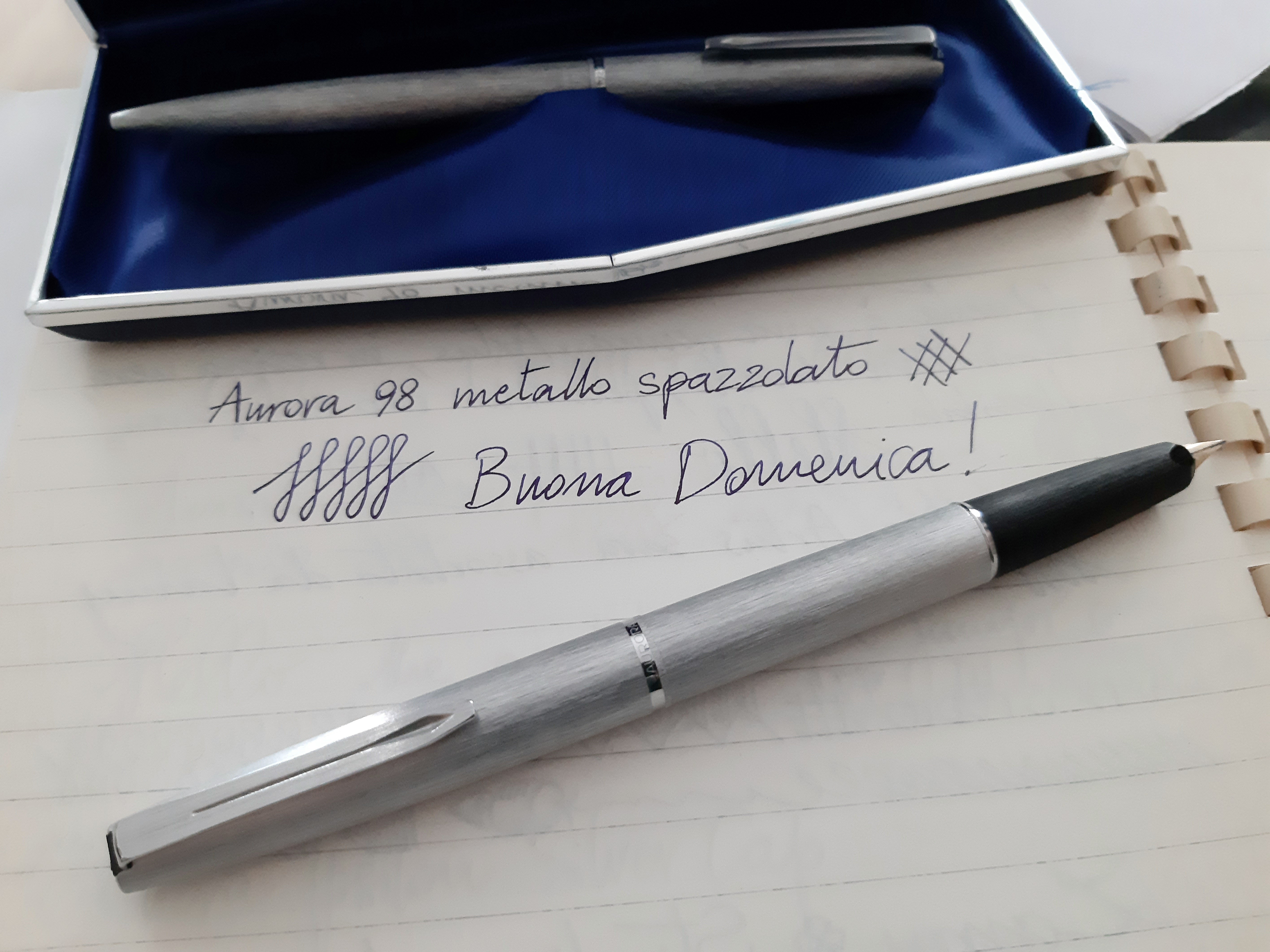 Aurora 98, parure metallo spazzolato, caricamento cartuccia/converter. Pennino fine, scorrevole e preciso, nella migliore tradizione Aurora.