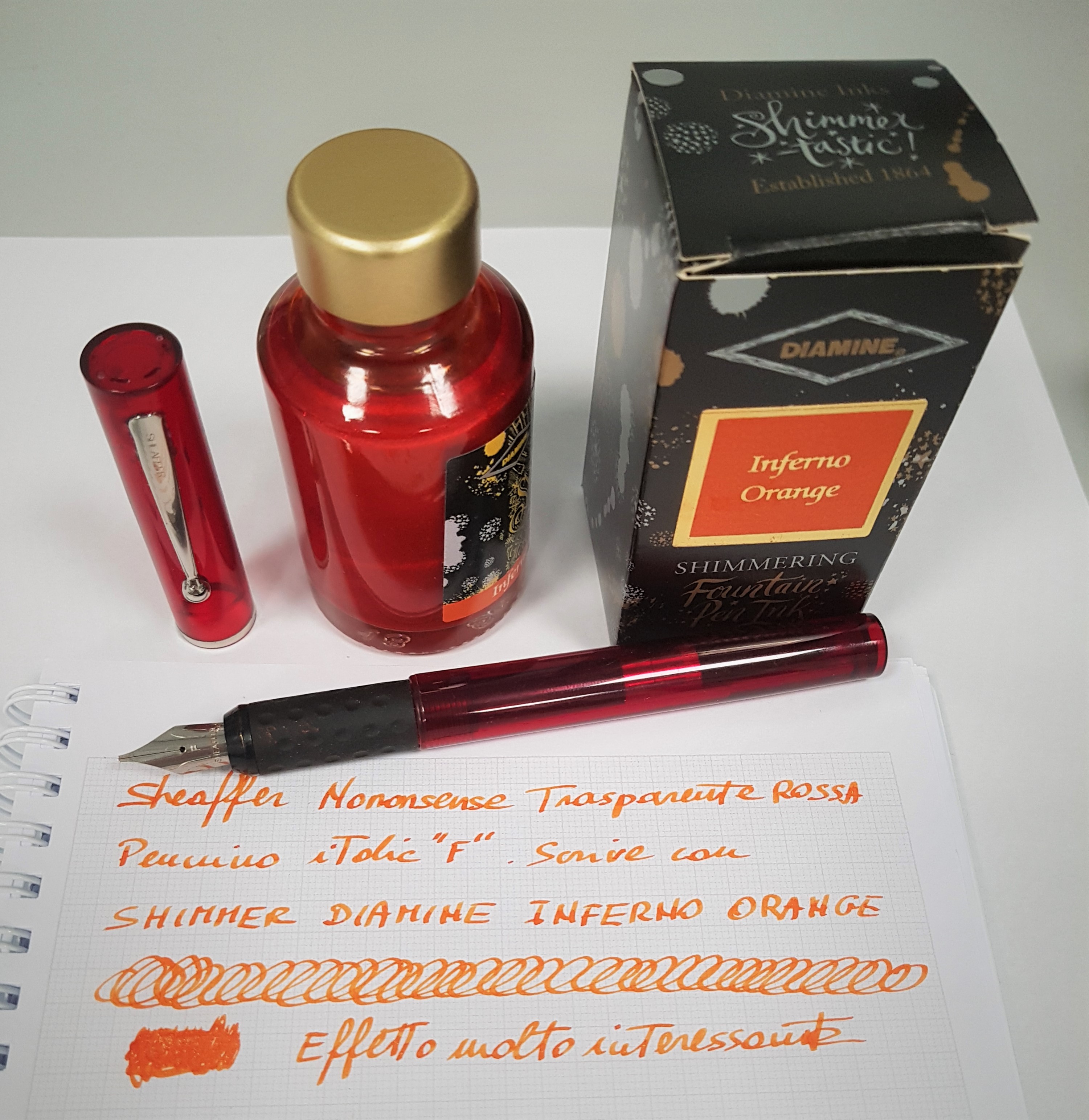 L'ho inchiostrata con un Diamine Shimmer, Inferno Orange. Devo dire che l'effetto glitter/shimmer è molto carino, ideale per bigliettini, cartoncini per auguri o cose simili. Consigliato! Speriamo non intasi l'alimentatore.
