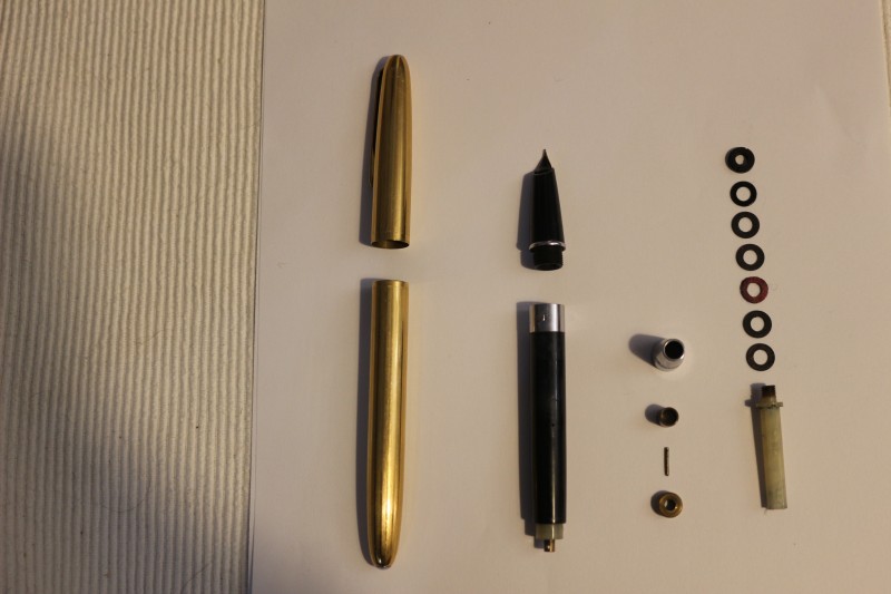 Appena arrivata (dalla Germania) l'ho smontata quasi completamente e ho messo in ammollo e pulito le guarnizioni, che paiono essere state usate pochissimo. Rispetto alla versione normale, qui la parte posteriore che alza e abbassa il pistone è fatta in modo diverso. Per fortuna il pistone è in buono stato, cosa piuttosto rara. L'ho riempita con inchiostro Pelikan 4001, il mio standard, e l'ho provata.