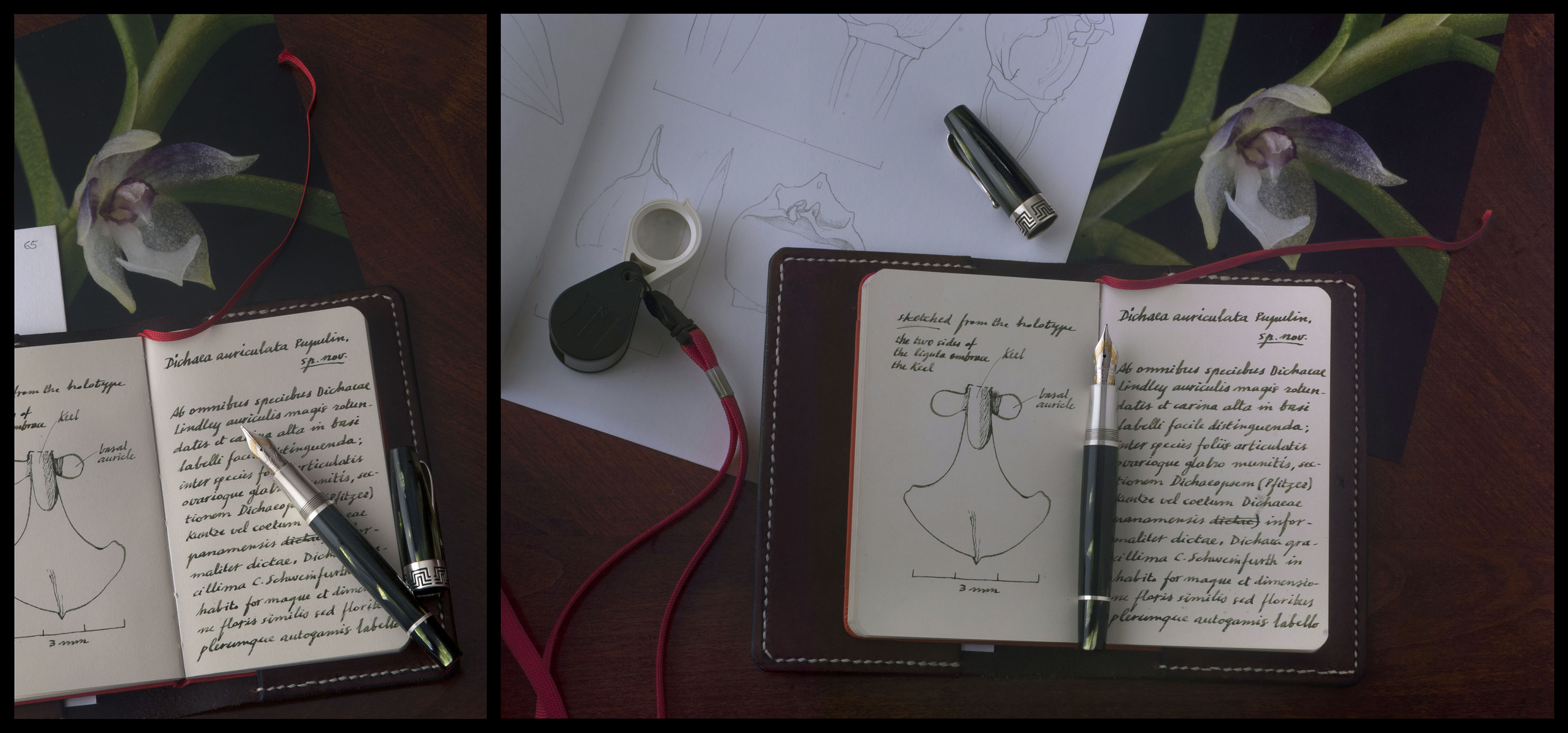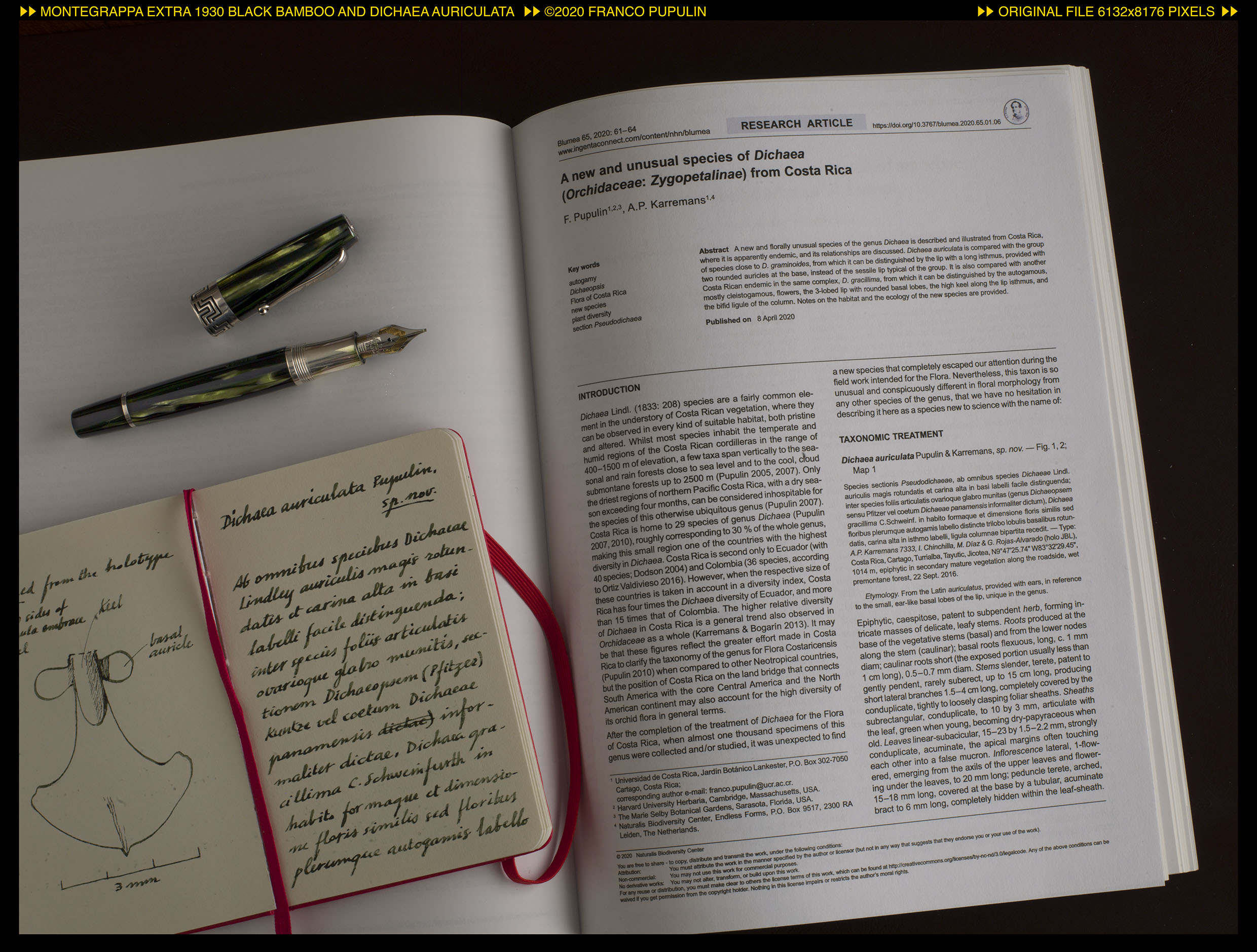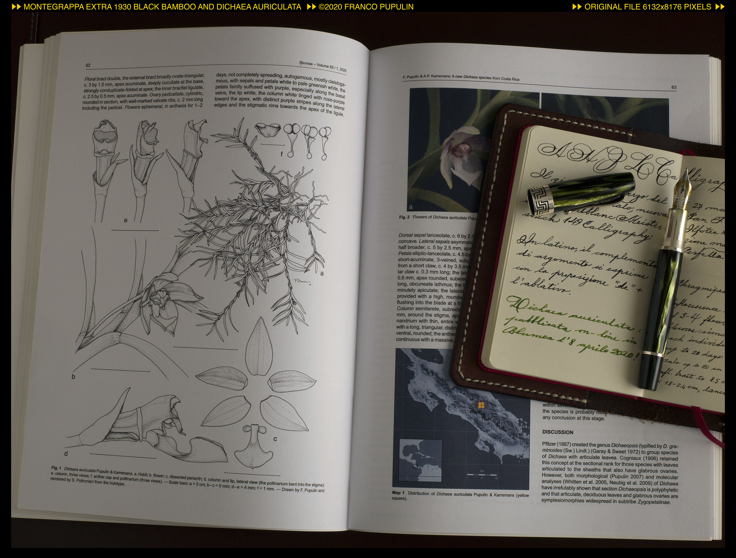 Quasi esattamente tre anni fa, sulle pagine di questo stesso forum, avevo scritto di come si possa usare una penna stilgrafica, tra le altre tante cose, anche per descrivere una nuova specie di orchidea non solo a parole, ma anche tracciandone su un foglio i caratteri unici e distintivi (quell’argomento puó leggersi qui: https://forum.fountainpen.it/viewtopic.php?t=14215). Un paio di fotografie mostravano il mio quaderno di appunti e la mia Montegrappa Extra 1930 in celluloide Nero Bambù (la pefetta penna del botanico, con quella sua aria di germoglio vegetale) alle prese con il primo sbozzo di descrizione di una nuova specie di orchidea della Costa Rica: la Dichaea auriculata, questo era il nome che si poteva leggere annotato sul quaderno.