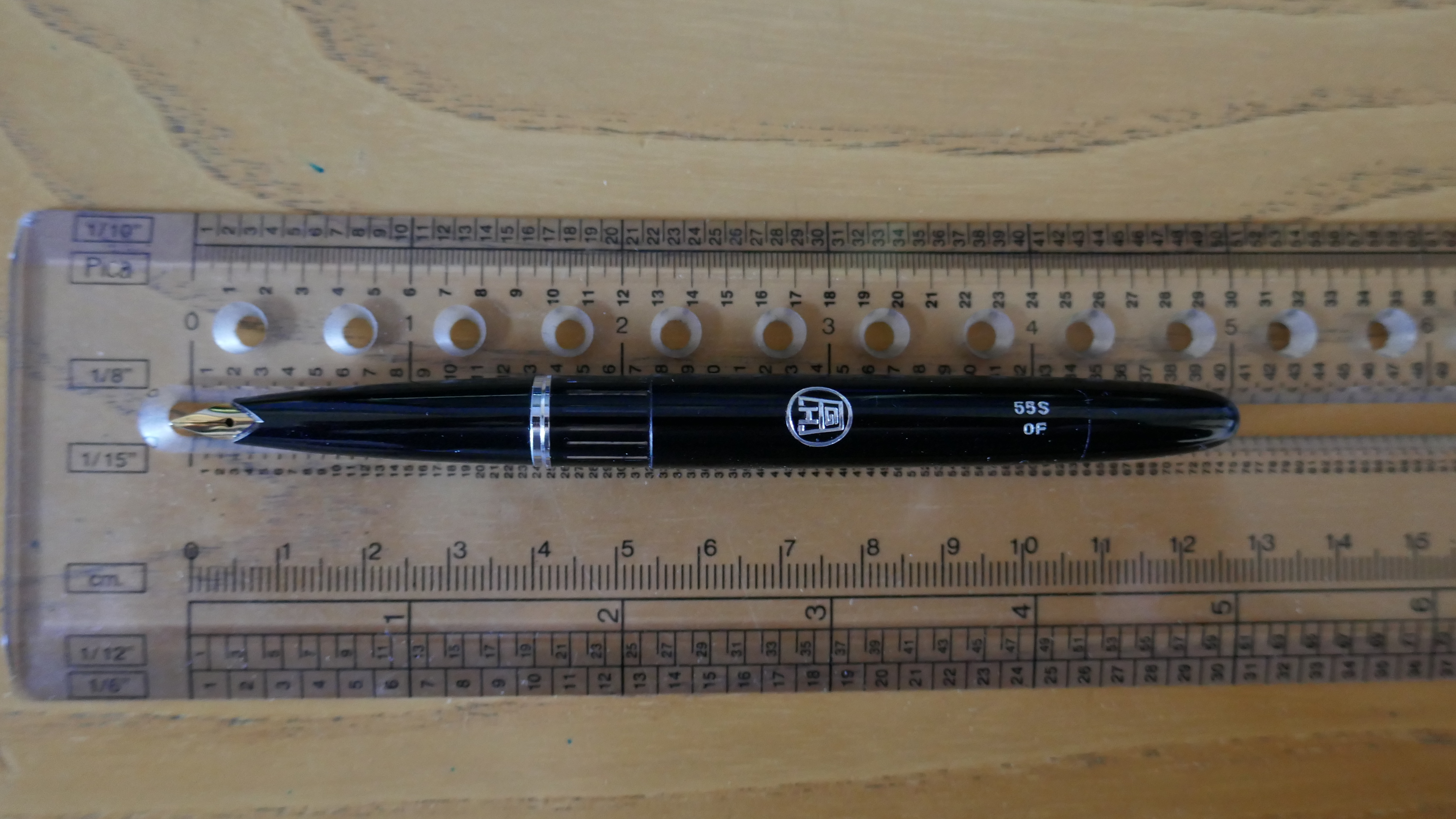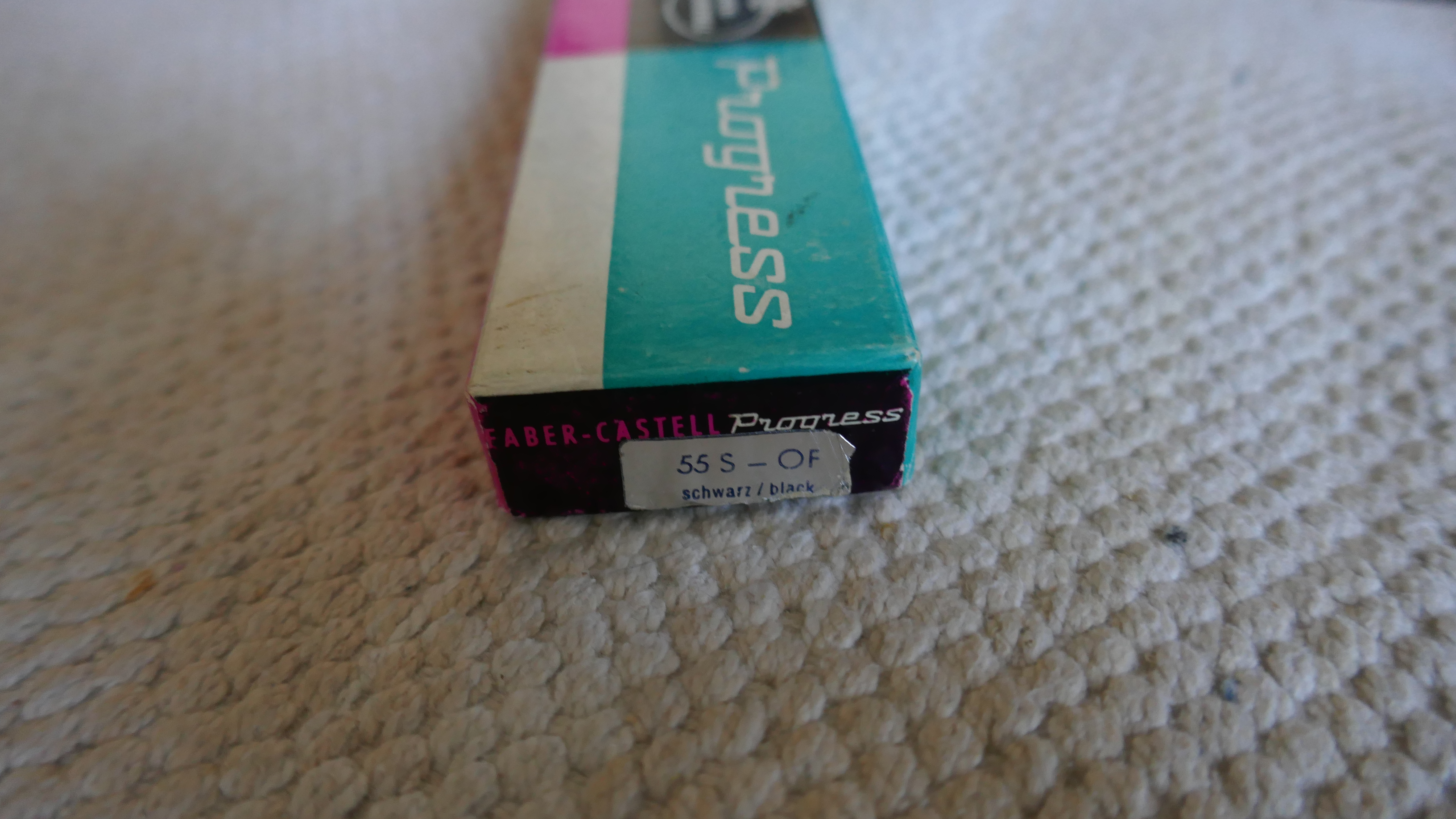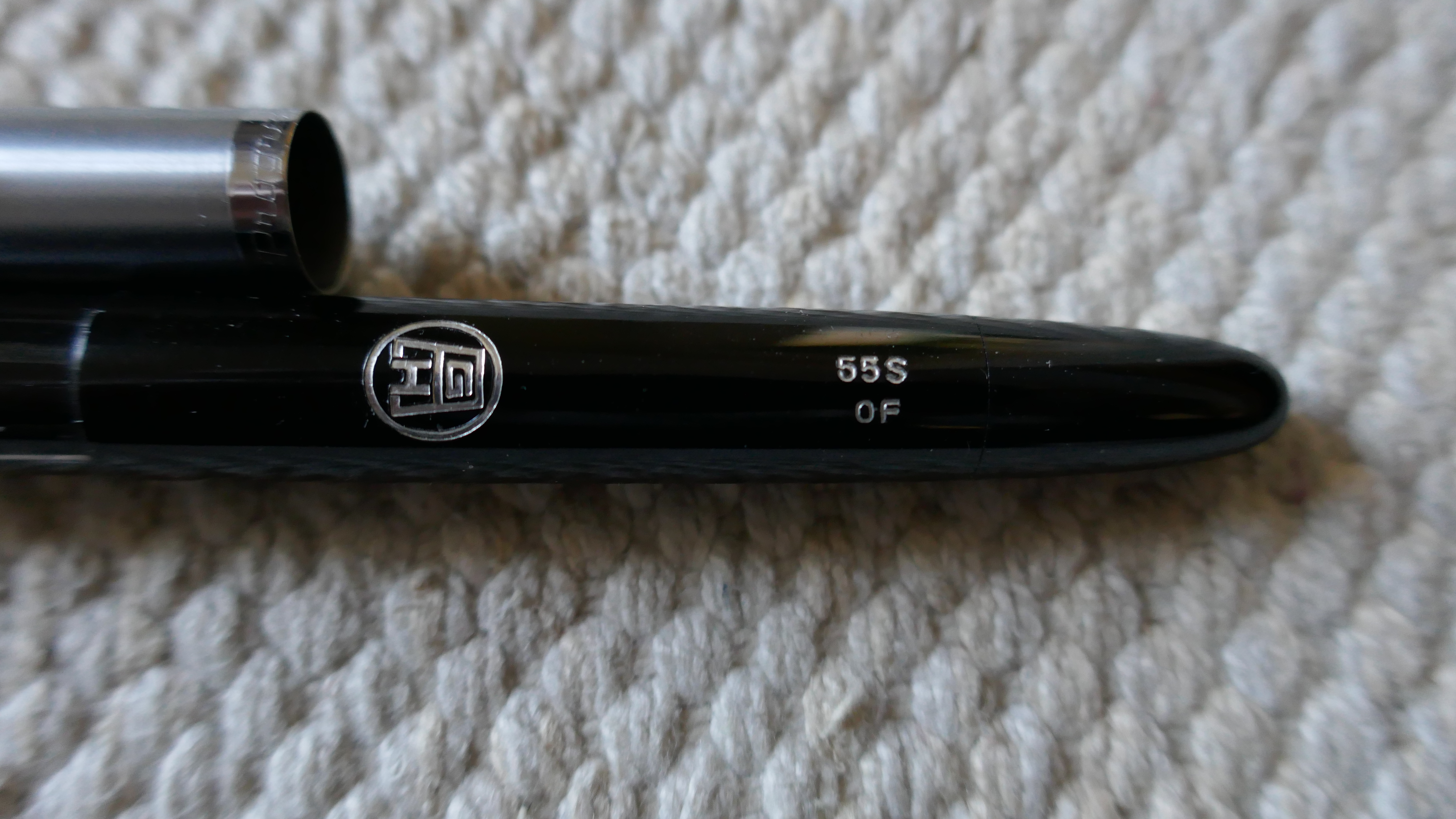 Salve, possiedo una penna come questa ma di colore verde, la sigla è: 55 G - F. Penso che significhi: modello 55, colore "grun" (verde in tedesco) pennino F. Similmente per la tua: modello 55, colore schwarz (nero) pennino Obliquo Fine. L'altro dovrebbe essere un marchio pubblicitario.