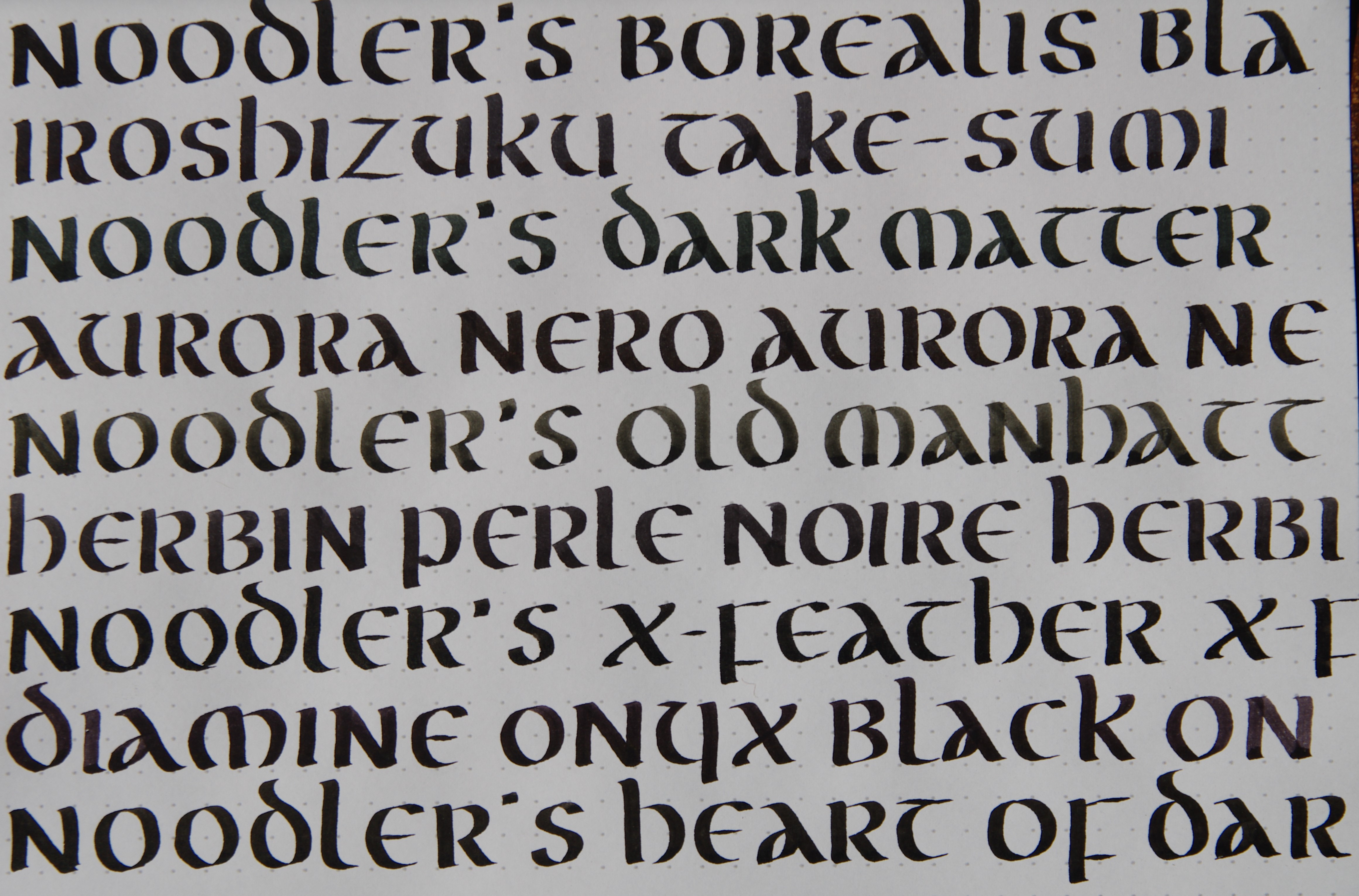 - Noodler's Borealis Black. Bello nero, forse di tono lievemente freddo. Scorrevole. Tributo americano all'Aurora ne noantri?