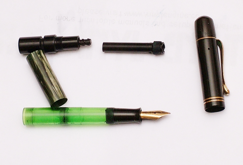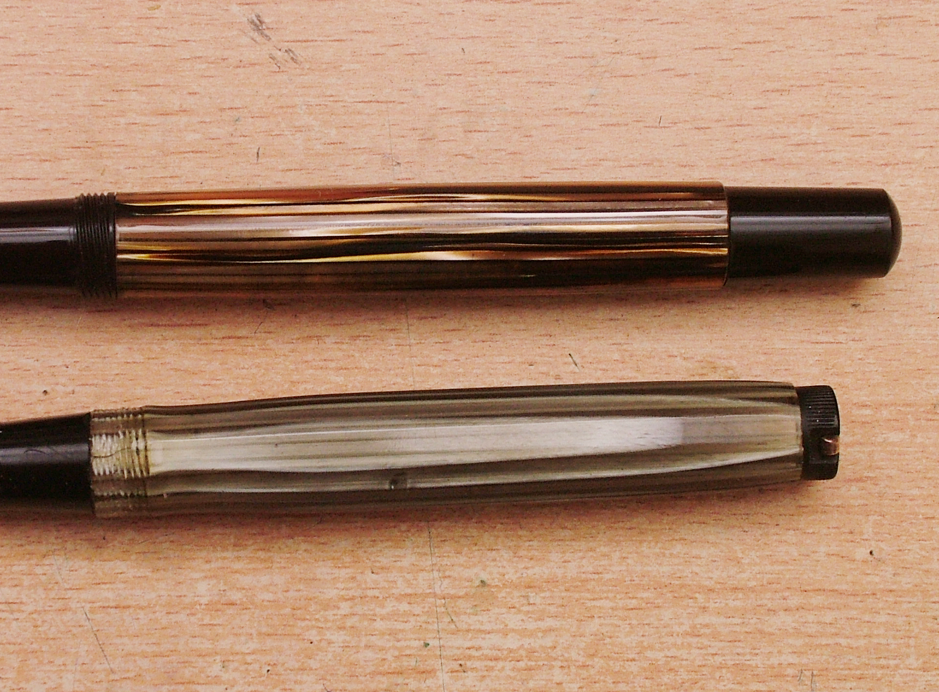 La Pelikan ricopre il fusto circolare in resina trasparente con una sfoglia di mezzo millimetro di celluloide ed anche meno dando il semplice effetto rigato.