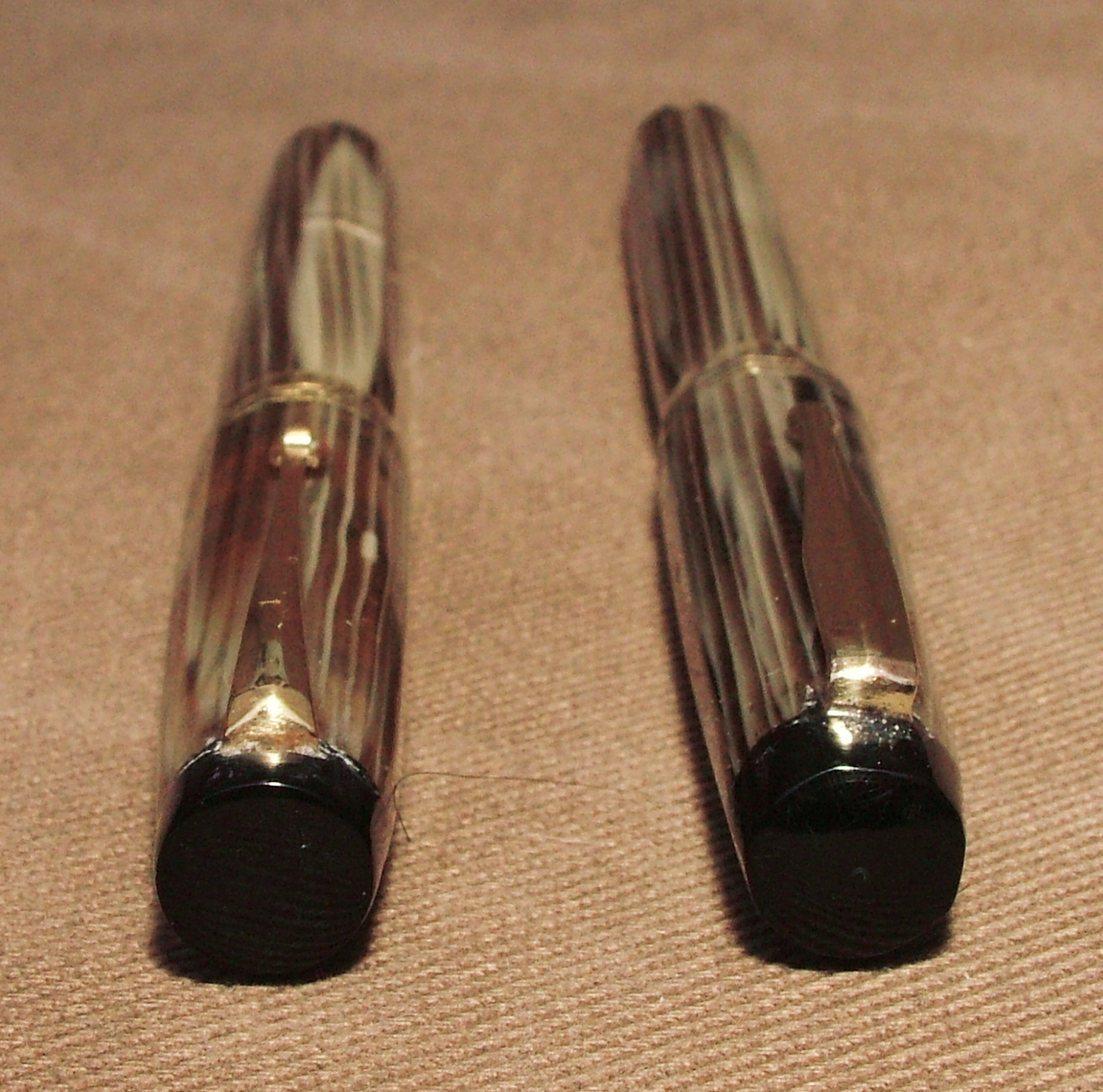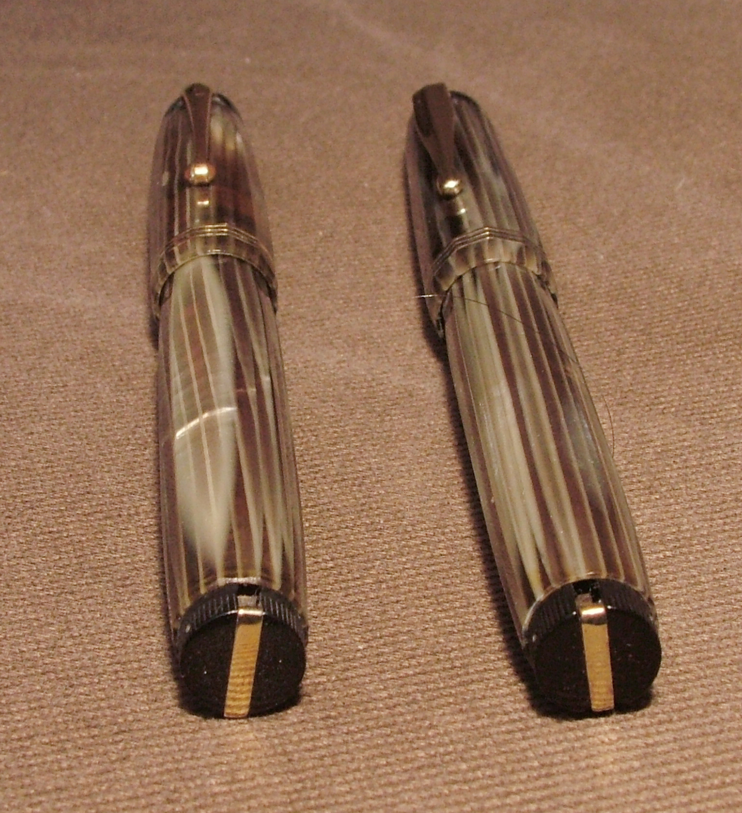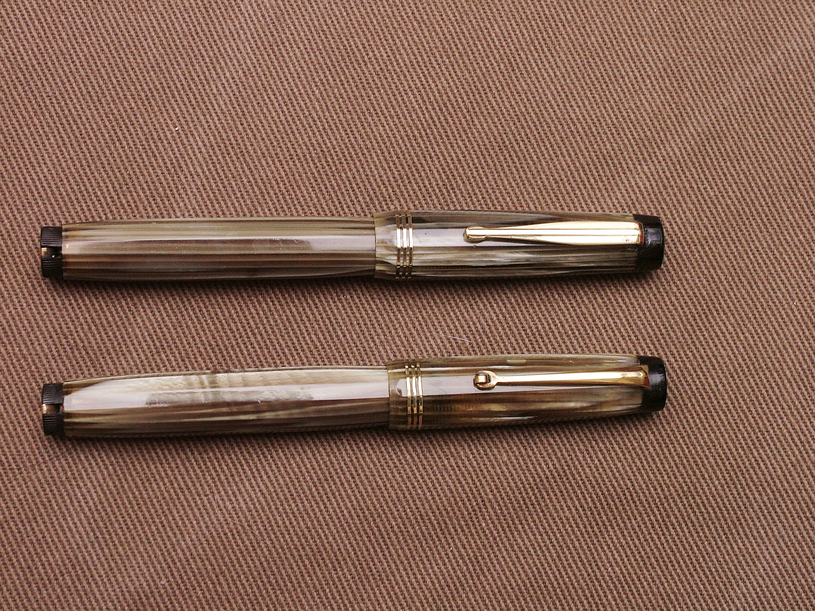Ora, nella sua penna, tutte le "lamine" sono all'incirca uguali nel loro spessore, il che mi farebbe pensare che una celluloide "laminata" sia stata in qualche modo arrotolata e poi tornita. E' una cosa simile all'uso che Pelikan ha fatto della sua resina "tartaruga" per la replica "Tortoiseshell" della M101N. Le lamelle sono bellamente iridescenti, ma tutte dello stesso spessore, e anche in questo caso potrebbe trattarsi di una celluloide "arrotolata". Lei sa se questo si possa fare?