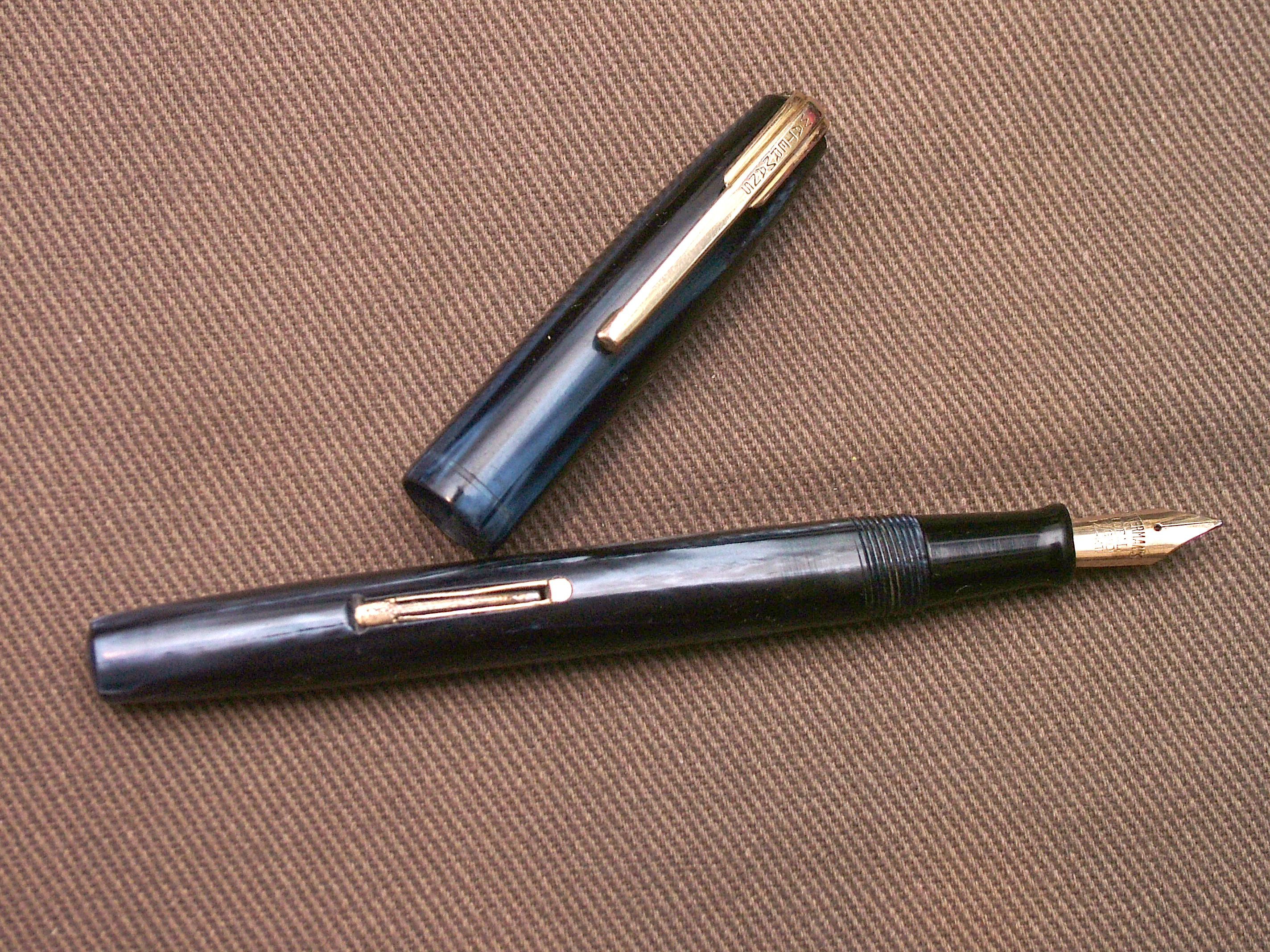 Una bella penna, che nella clip risente ancora chiaramente dello stile decò. Credo che la tua possa datarsi prima del 1948 quando per quel che ne so cominciarono ad essere prodotti, anche quelli in Inghilterra, modelli con due ed anche tre bandine sul cappuccio. Esiste poi la versione MN, molto simile ma con la vite sul cappuccio più arrotondata. Bellissima la colorazione tiger eyes, mielata, ma anche quella della tua è molto bella. Purtroppo non ho le mie sottomano - che riportano sul corpo il riferimento al modello - e dunque quanto a" l'odore " per ora non posso pronunciarmi. Complimenti e buona giornata