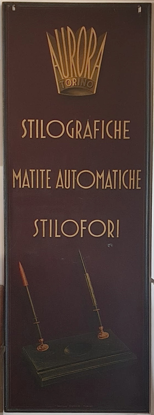 Insegna primi anni ‘20, dipinta a mano su lamina in ferro. Cornice idem. Firmata "INSEGNE CUCCO-TORINO". Misure cm 210 x 75. Presente sino al 1948 tra le due vetrine di una cartoleria di via Dell'Ospedale Vecchio a Udine, trasferitasi sino alla chiusura, nel 1993, in via Bonaldo Stringher, sempre nel capoluogo friulano.