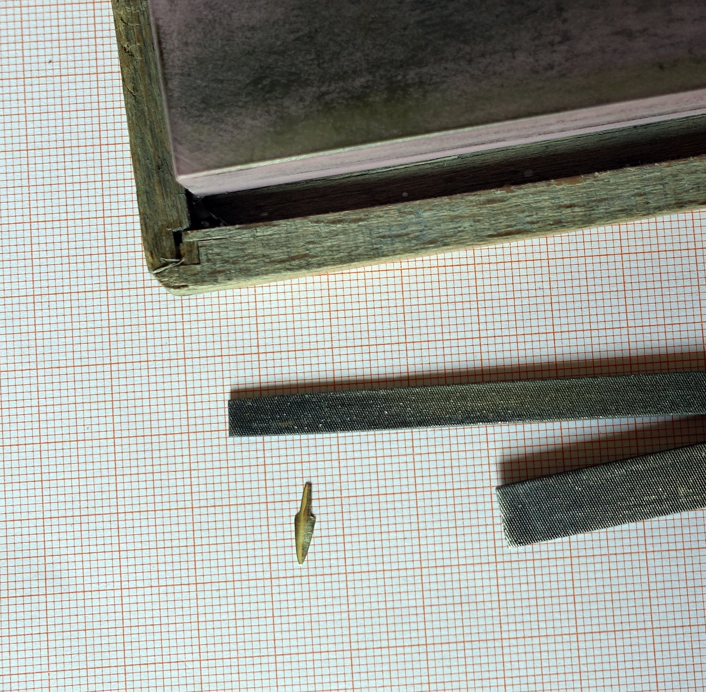 Lo spessore troppo sottile ha fatto in modo che per poter pareggiare i piani ho esagerato con la levigatura e lo spessore iniziale do 0,05 a furia di spianarlo durante la sagomatura della freccia è diventato 0,03, praticamente un nulla, si può vedere dalle foto la frittata, la coda della freccia si è parzialmente rotta e sugli angoli il materiale è ai minimi termini, in ogni caso sono convinto che con uno spessore maggiore del lamierino si possa fare un lavoro migliore.