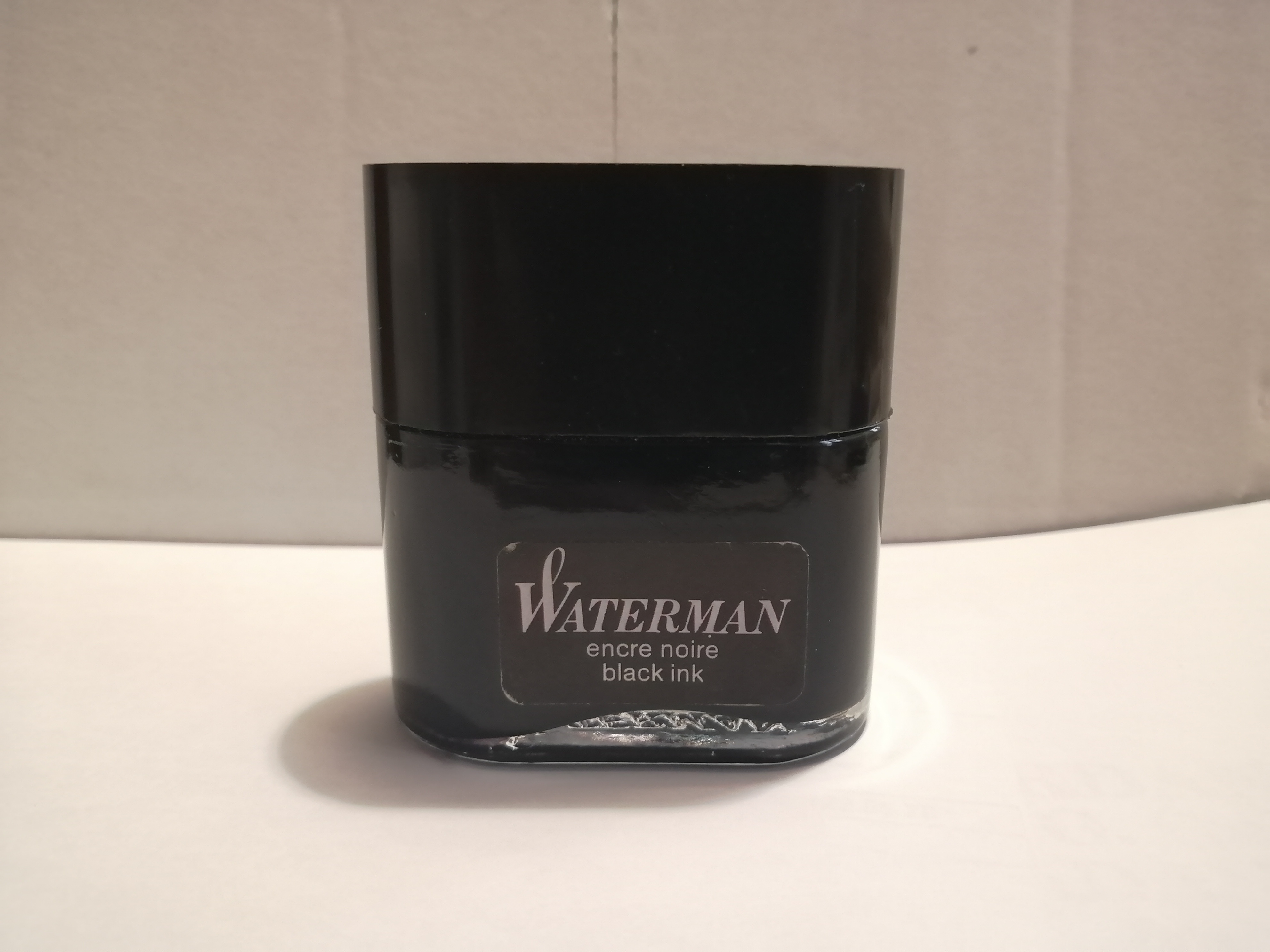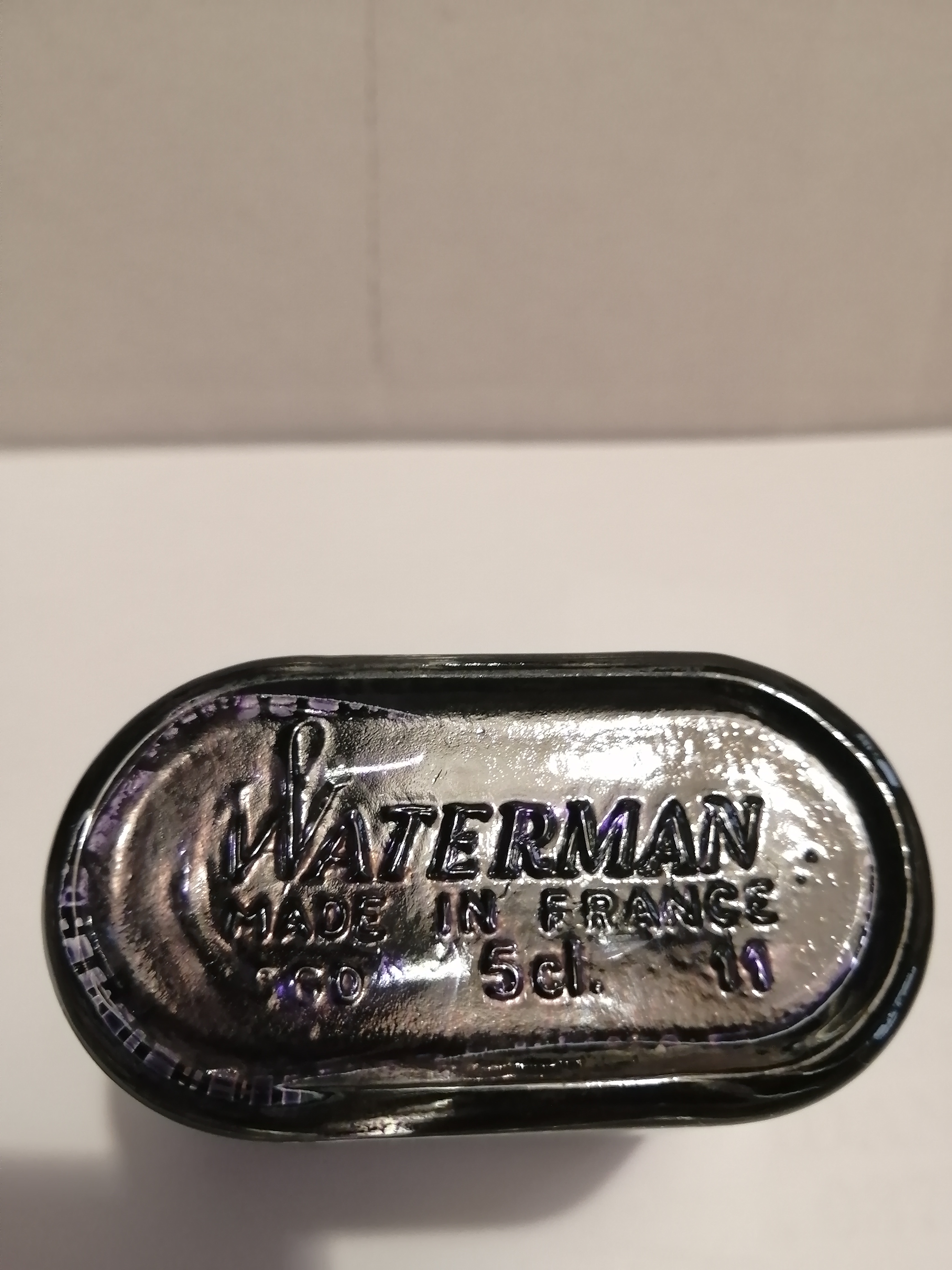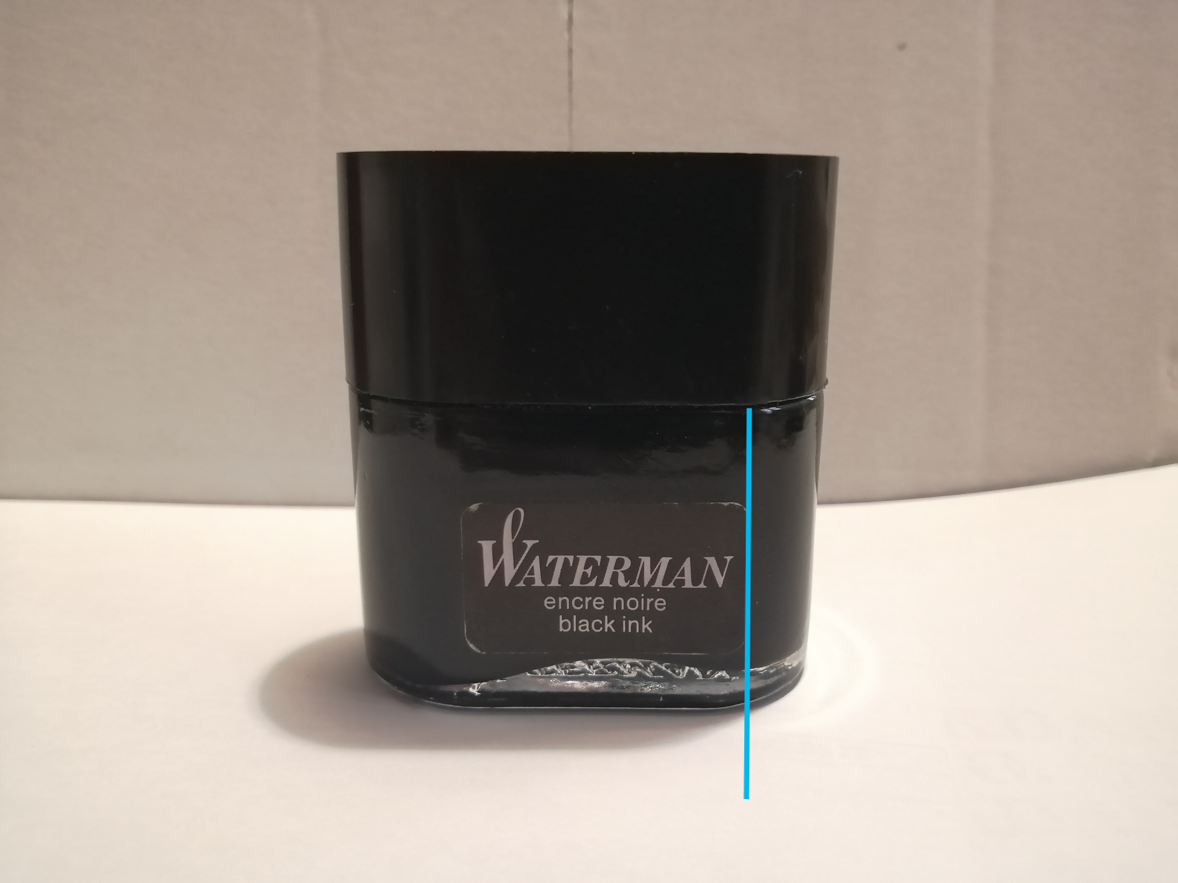 In effetti non ne avevo mai visto uno così prima! Non so se il livello dell'inchiostro sia quello corretto. Mettendo la boccetta in orizzontale il livello dell'inchiostro arriva al pari dell'etichetta (foto). Il colore dell'inchiostro in controluce ha marcate sfumature blu.