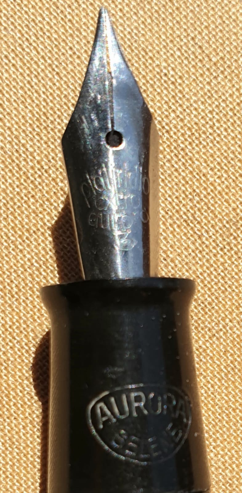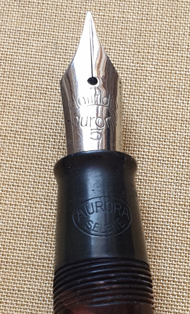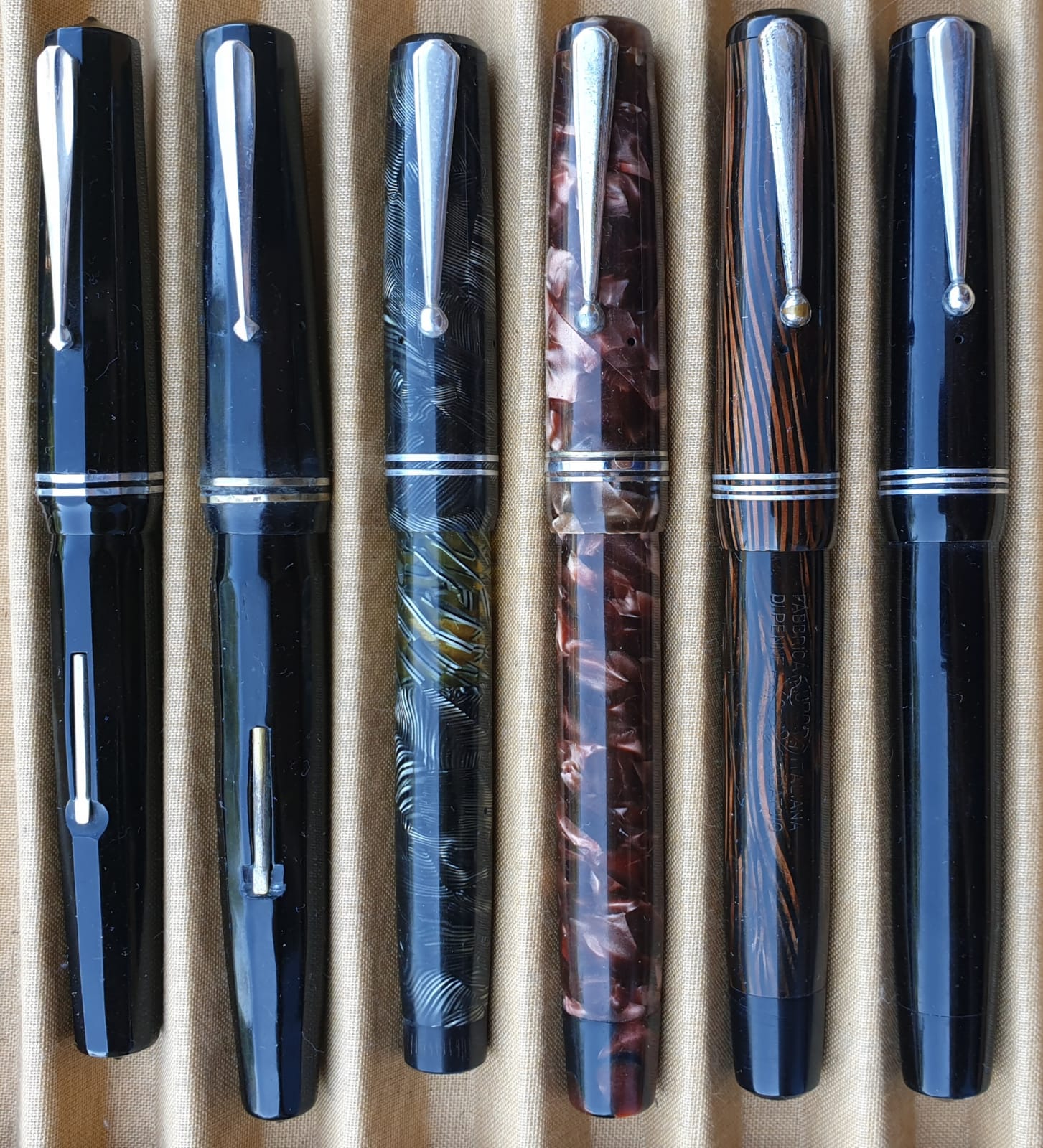 Cinque belle Selene e, prima a sinistra una Amica (particolare di condotto e pennino a parte), leggermente più piccola della seconda a marca Selene, ugualmente faccettata e rastremata. Notare, in queste, il caricamento a levetta. La quarta da sinistra, prima serie con veretta centrale più alta. Le altre (due verette la minore, tre le altre) seconda serie. Pennino in platiridio. Il periodo storico questua "oro alla patria"...