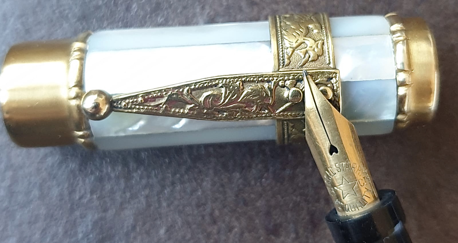 Il pennino è senz'altro Gold Starry, non è una prova definitiva perché venivano sostituiti spesso, ma non c'è nessuna controevidenza e la Gold Starry produceva senz'altro rientranti. Anche la clip di comodo con quel disegno si trova spesso su stilografiche francesi. Direi che l'ipotesi di Massimo ha buone basi.