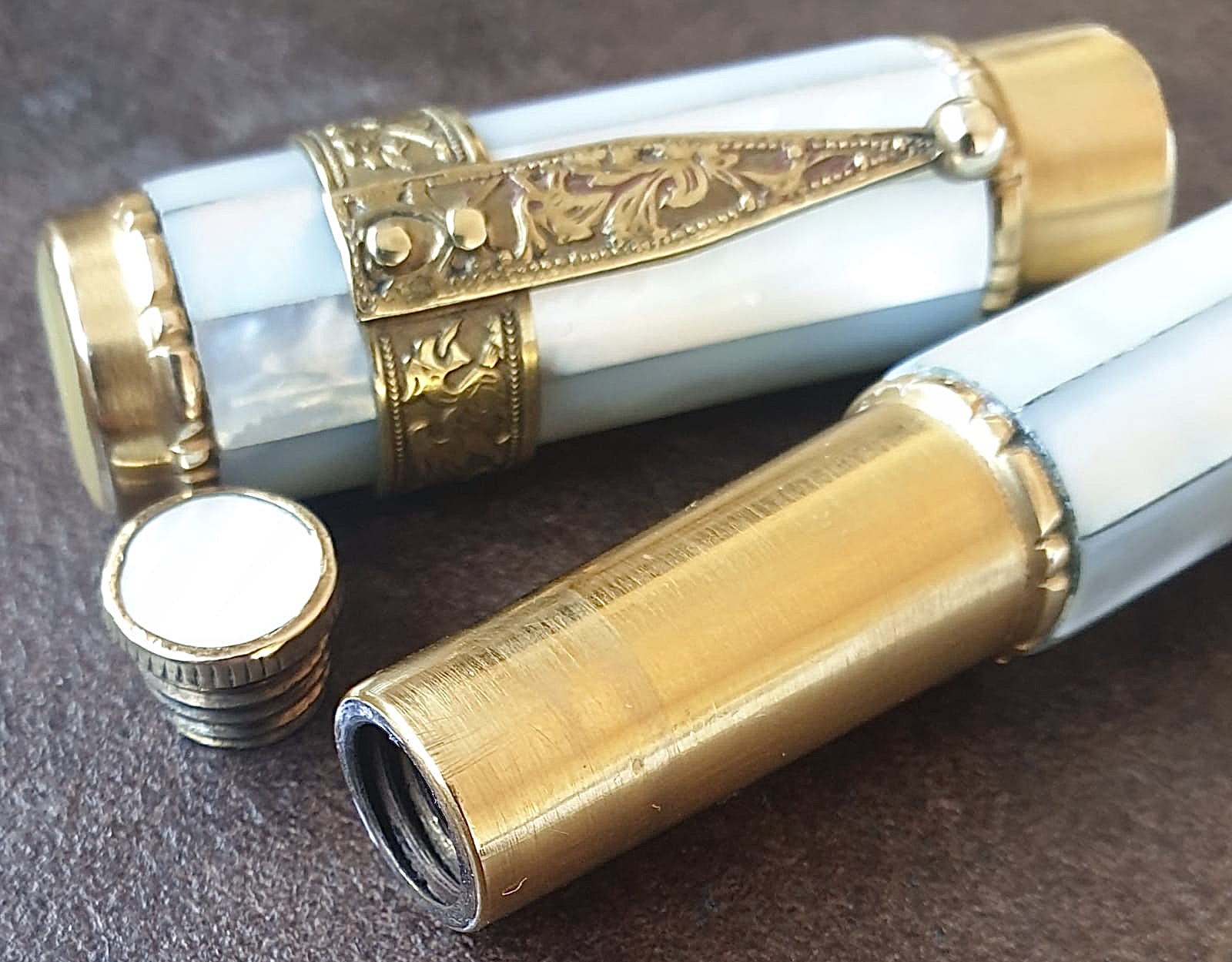 Stilografica anonima, probabilmente unica, in ebanite ricoperta di madreperla. Caricamento anteriore a contagocce. Vano posteriore di cm 3, con ipotesi varie: porta veleno, porta pastiglie (medicinali o d'inchiostro). Quando la trovai conteneva tracce di tabacco da fiuto. Produttore sconosciuto.