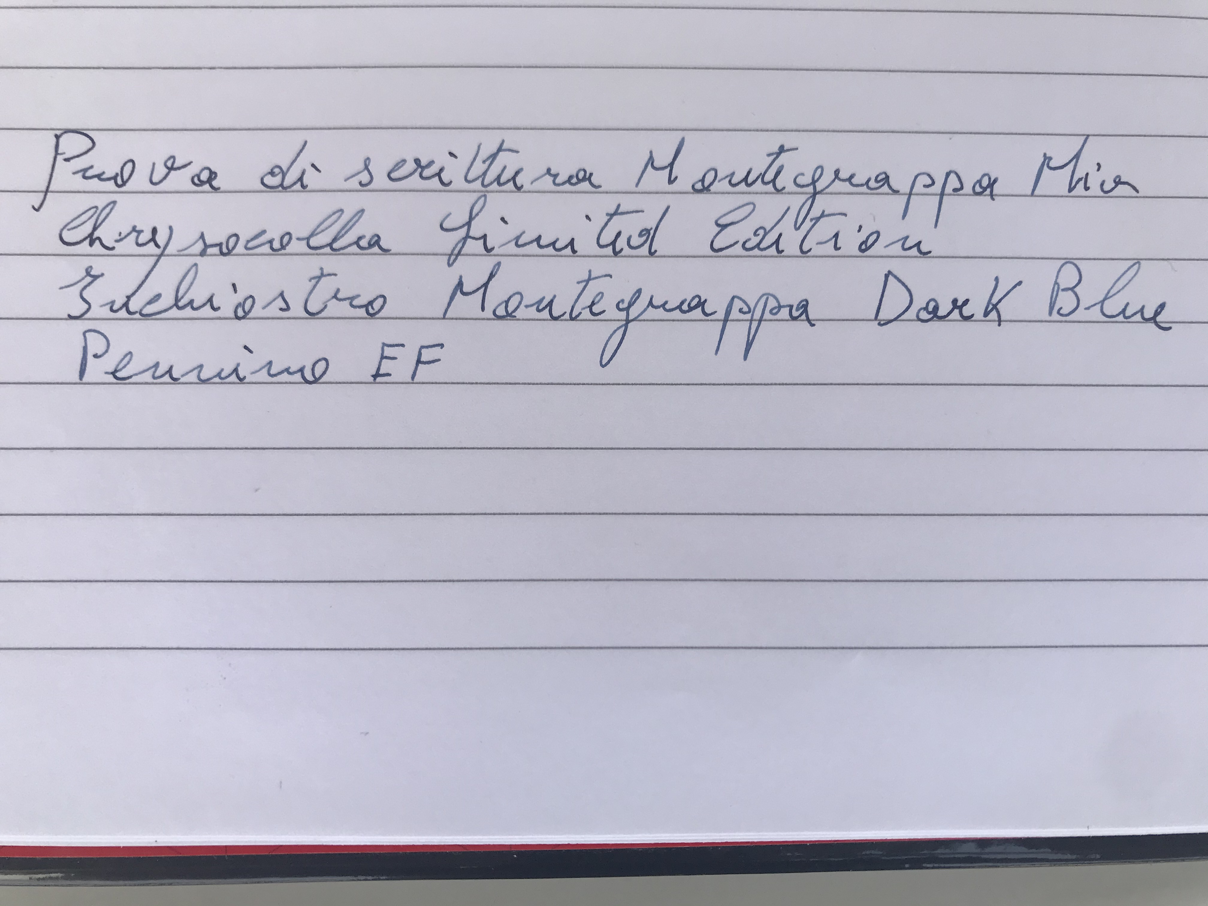 Passiamo alla prova di scrittura, sotto ho inserito poche righe nella mia pessima grafia, l’inchiostro è un Montegrappa Blu/nero acquistato insieme alla penna che in realtà di nero ha molto poco perché resta abbastanza chiaro, avevo pensato al Turchese della Monte Grappa ingannato dai colori della penna per come apparivano sul sito ma per fortuna ho desistito. Il Blu almeno resta un colore neutro.