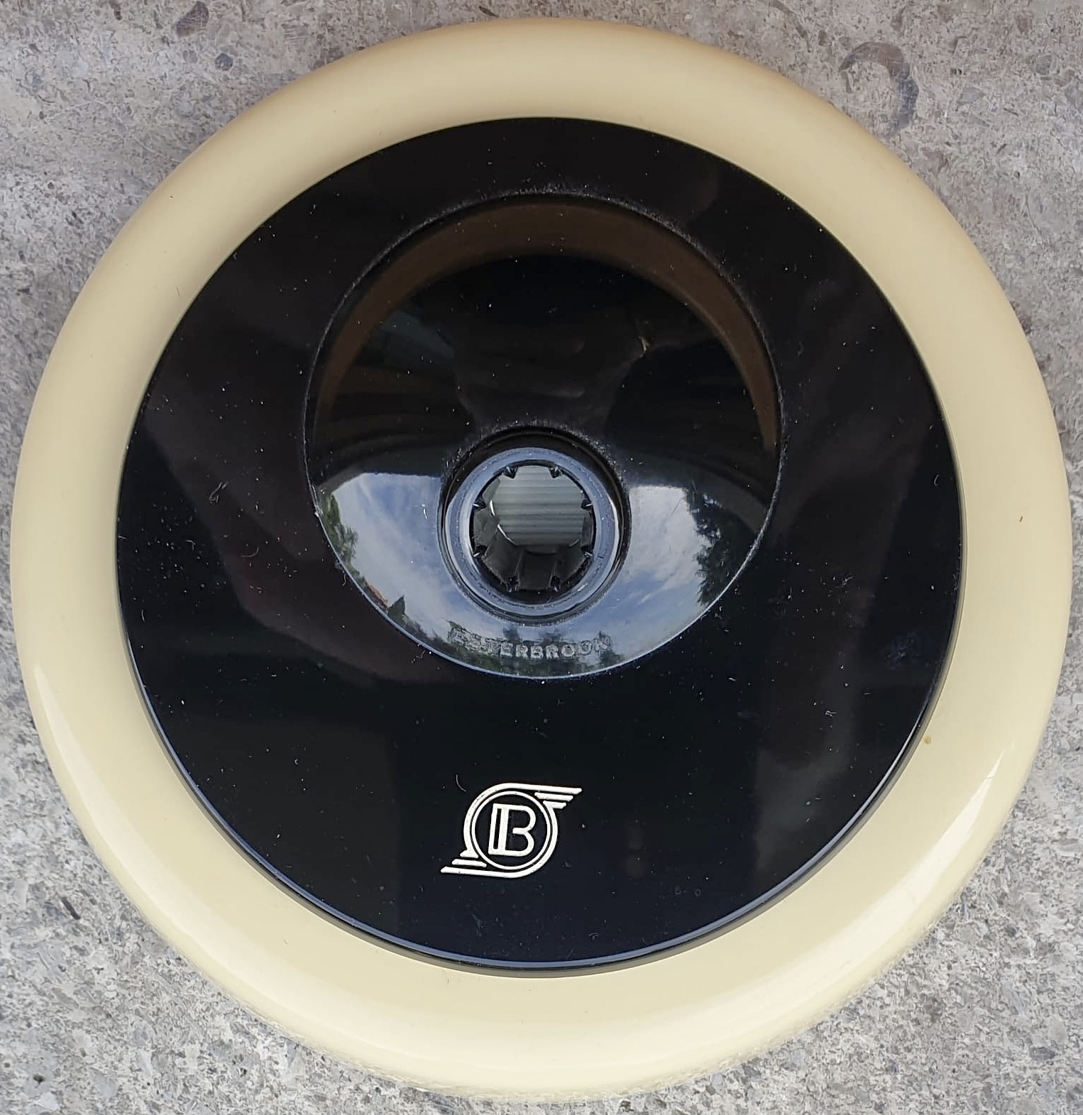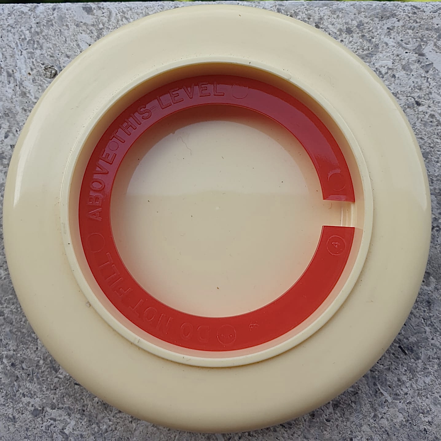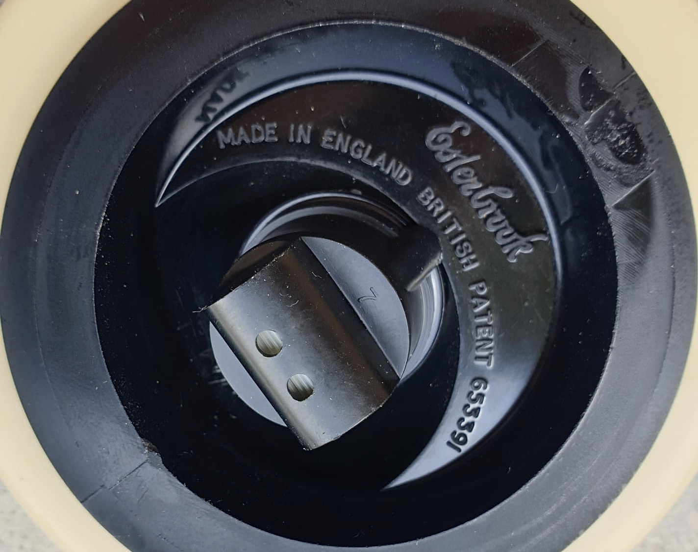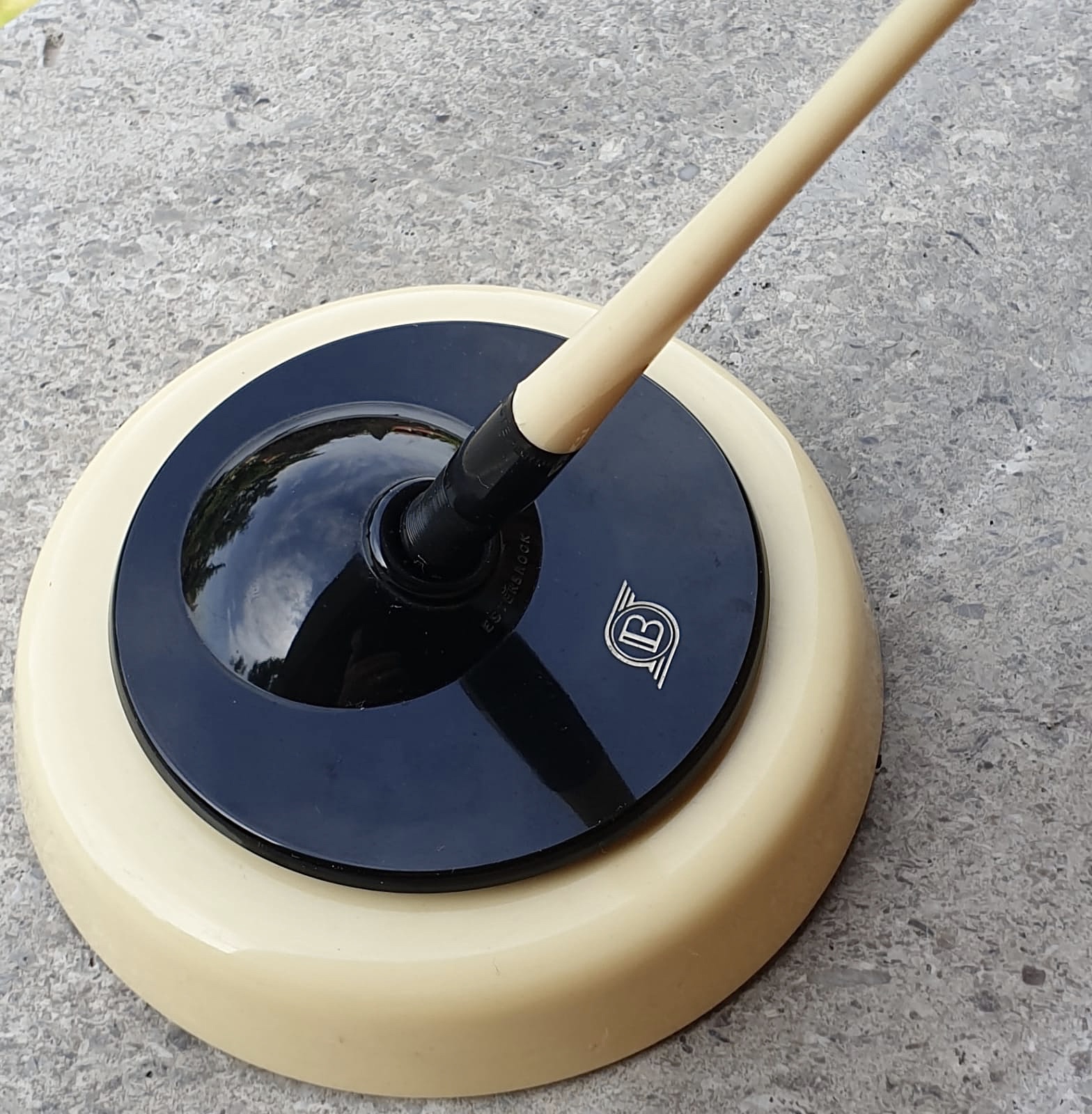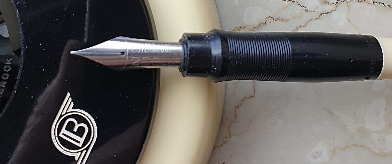 Esterbrook Dip-Less Desk Set, Nº 447, Birmingham, UK, 1950. Curioso oggetto da tavolo, un po' stiloforo ed un po' calamaio; un po' penna stilografica ed un po' da inzuppo. Mi spiego: nel piatto base va versato inchiostro non oltre il cerchio rosso. Il coperchio nero, messo in sede, intinge la parte sporgente che contiene compressa assorbente a nido d'ape (tipo Parker 61) che si carica per capillarità bagnando il pennino, una volta questo messo in sede. Esemplare con impresso un logo che non ho ancora identificato, ma che mi piacerebbe sapere se qualcuno di voi ha idea di cosa rappresenti.