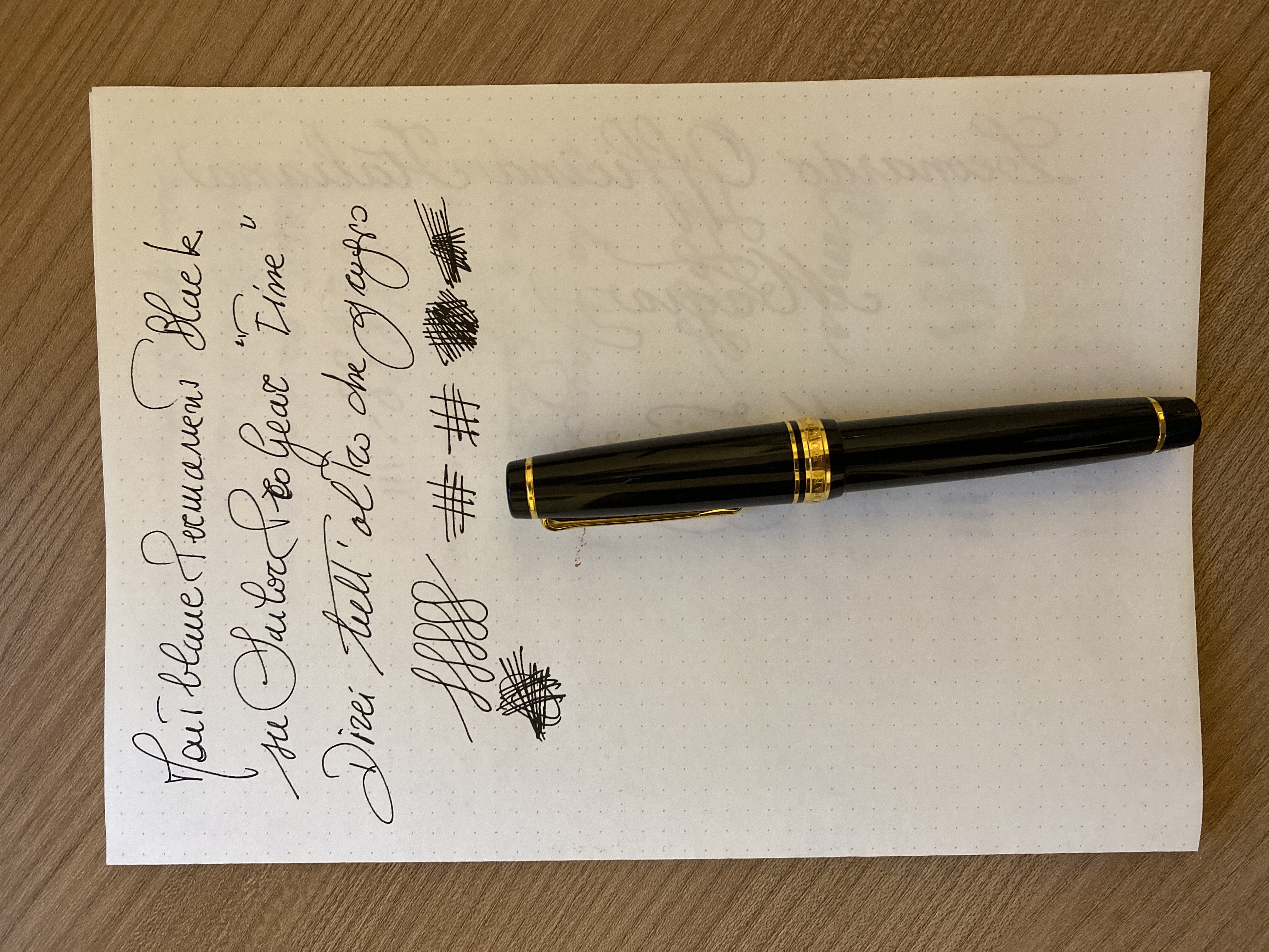 Dei miei inchiostri neri il Permanent Black di Montblanc é il più nero, sicuramente più nero dell'Aurora. Ha una sua piacevole "densitá", che non conosco in altri inchiostri. Su carte di qualità é decisamente lento ad asciugare.