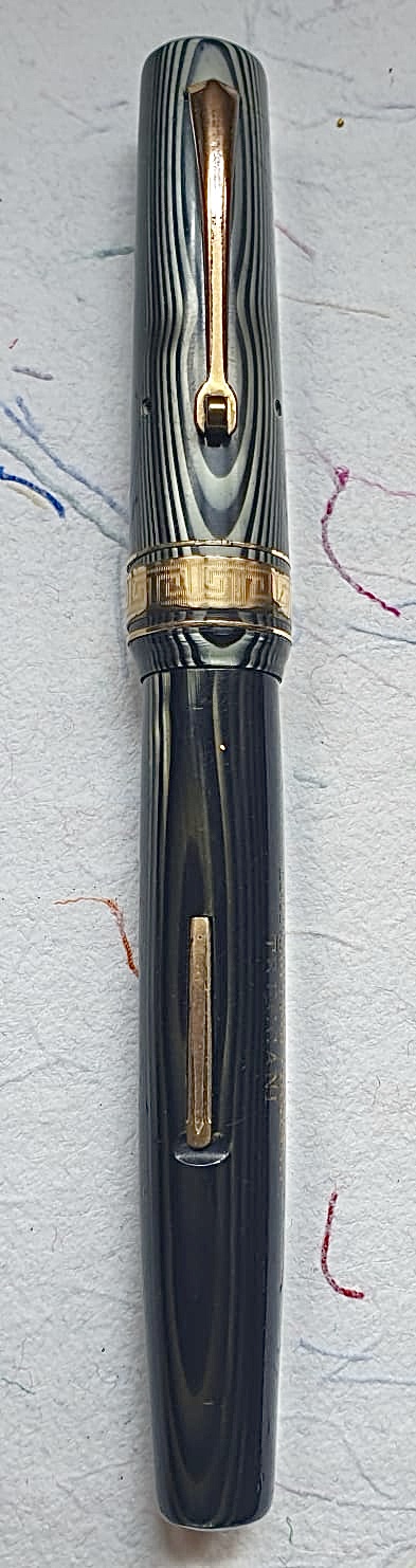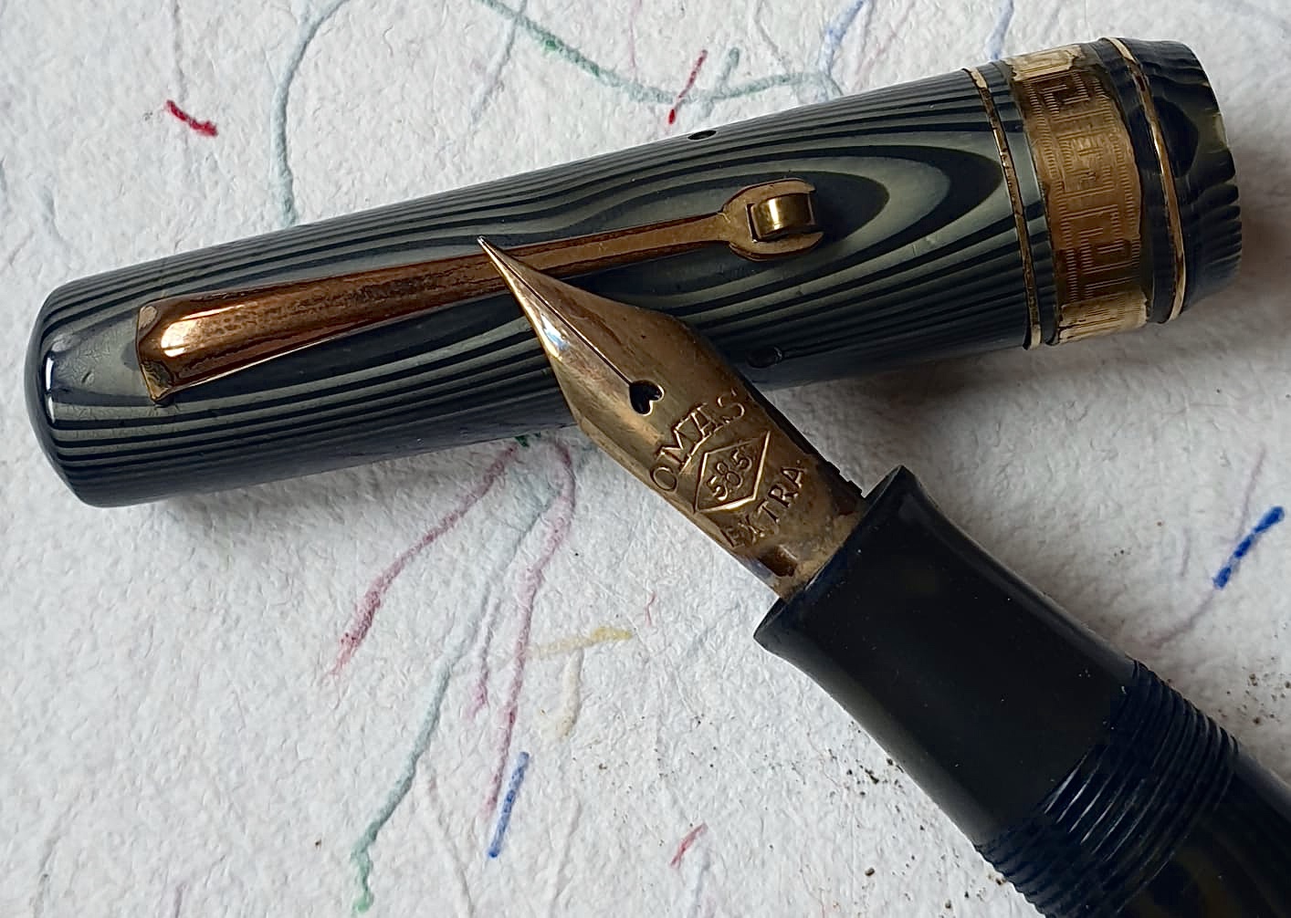 Ho scoperto di averne una molto simile a questa che hai pubblicato, nel senso stesso materiale, colore e finiture, clip a ruzzolina, vera del cappuccio con le greche (le due sottili mancano) ma NON pubblicitaria; solo "Omas Extra" (e, per giunta, poichè trovata in un mercatino 2 anni fa, combinata molto peggio della tua...
