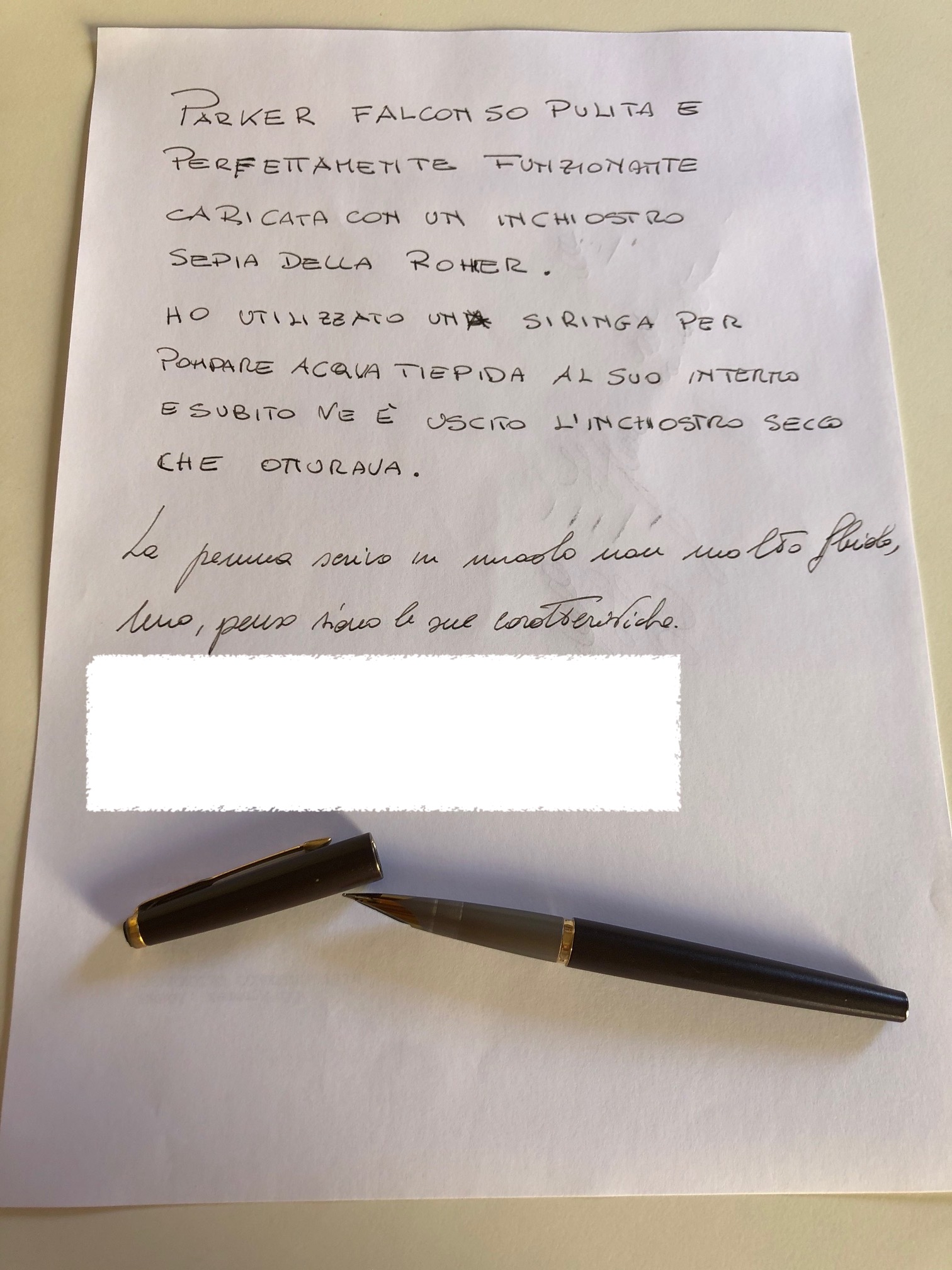 E tutto è bene quel che finisce bene... Con l'utilizzo di una siringa ho pompato un pò d'acqua ed è uscito l'inchiostro secco che occludeva il pennino....... Vi allego una prova di scrittura... Grazie mille a tutti per i consigli preziosi...