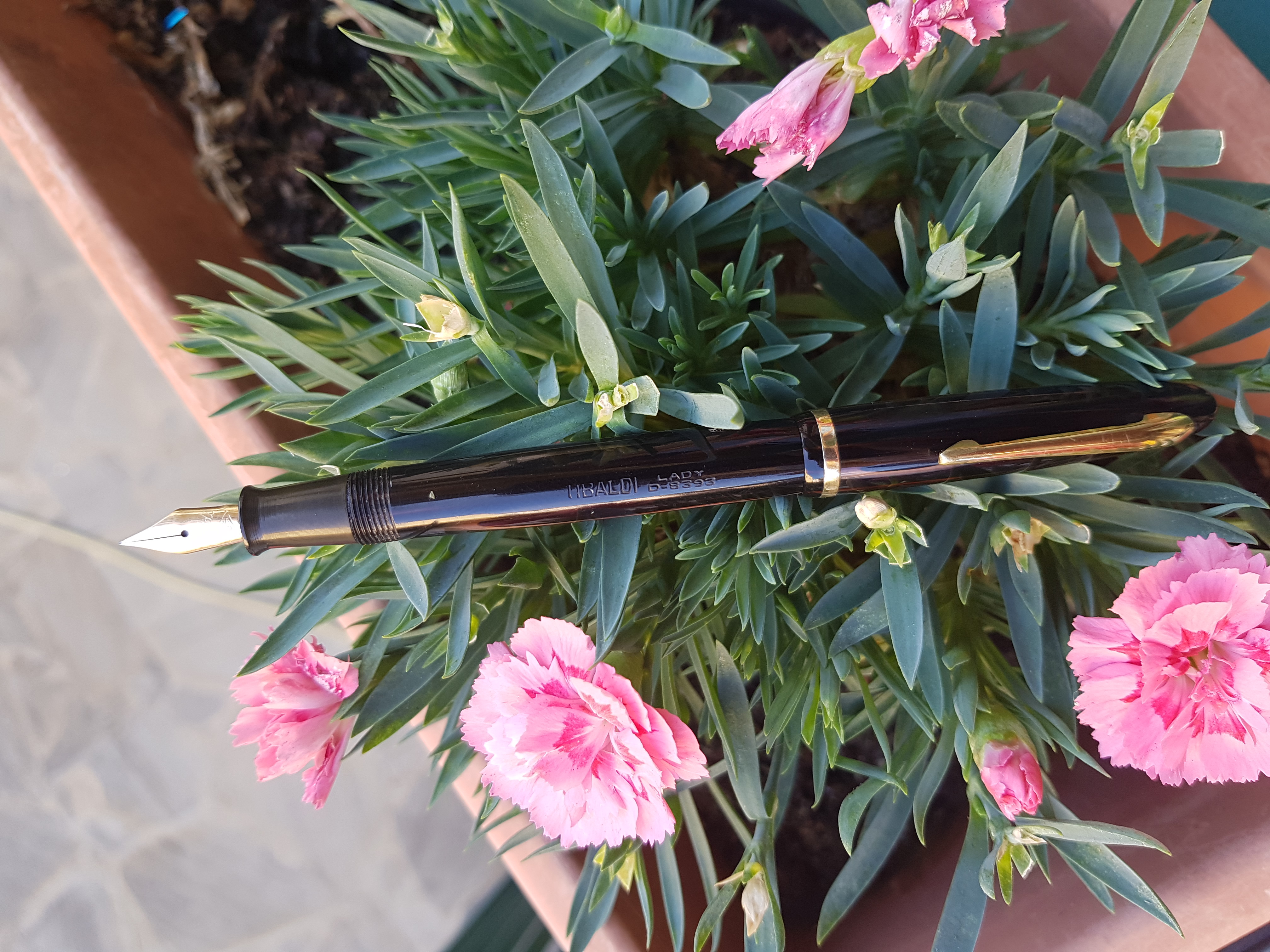 La penna è in celluloide Arco Marrone, non so se qualcuno ha avuto modo di accorgersene, ma è un materiale che mi piace un sacco, quando lo vedo mi si illumina l’animo.