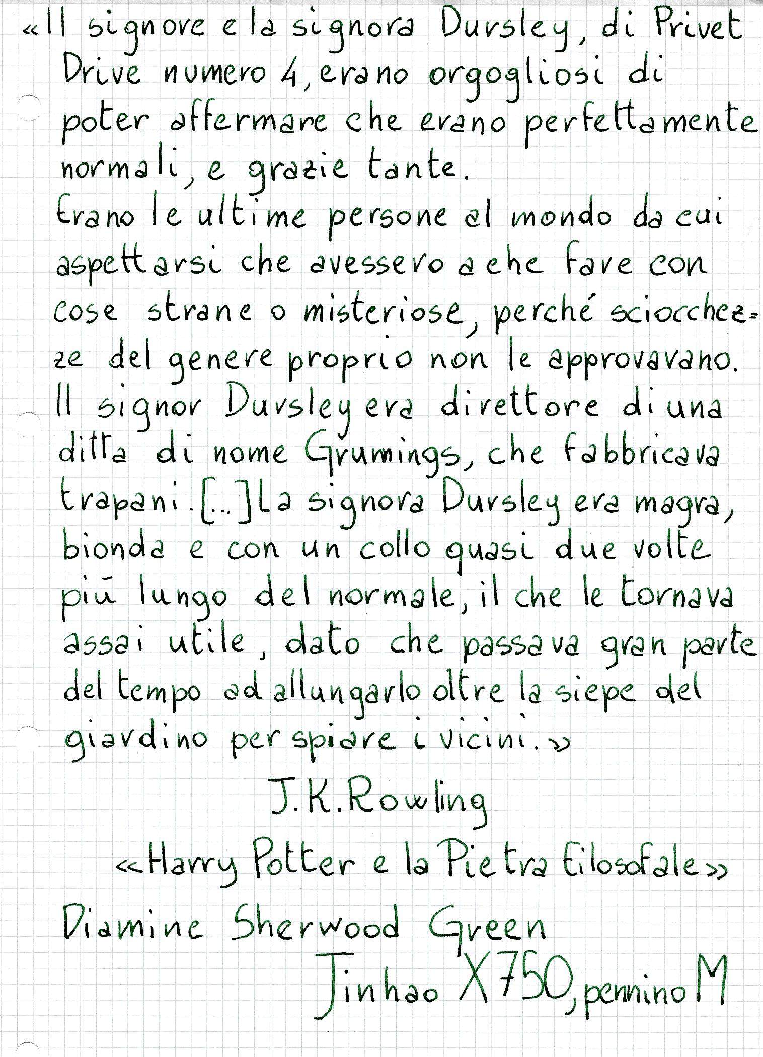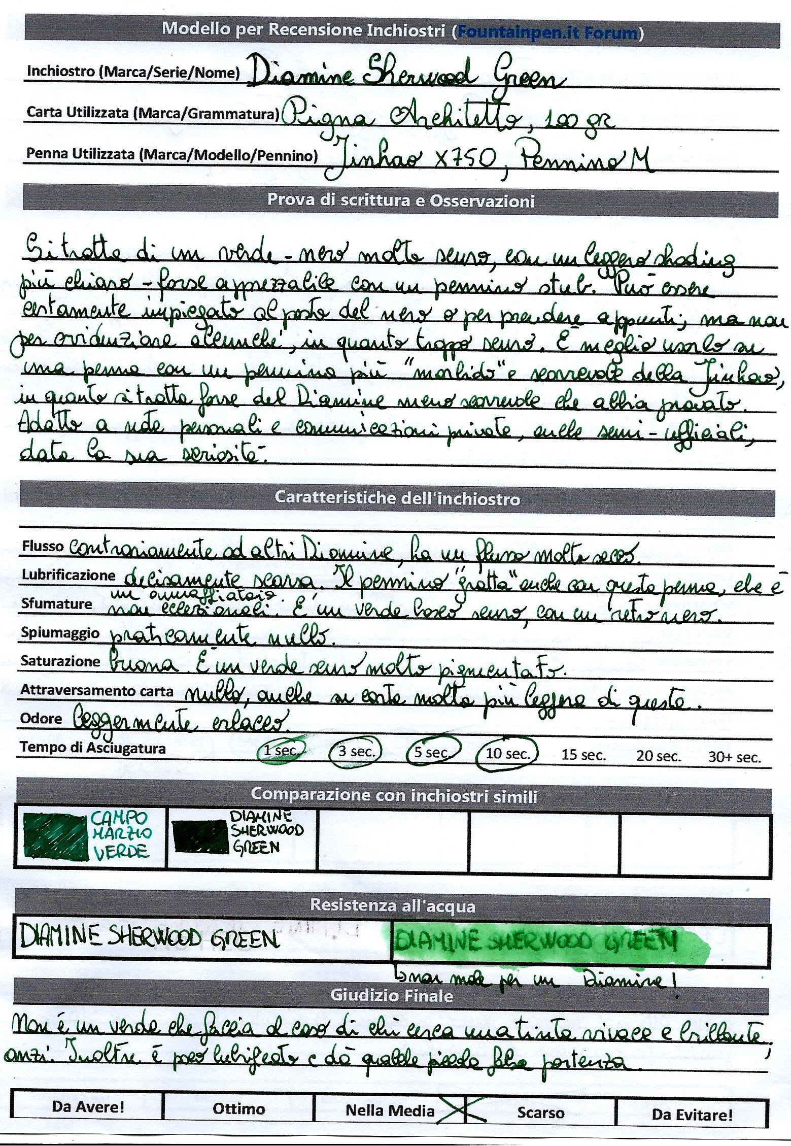 Per quanto molti sul forum abbiano recensito più che positivamente il Diamine Sherwood Green, a me ha dato dei problemi di scorrevolezza, delle piccole "rogne" quando l'ho caricato sulla Jinhao - che pure è una specie di annaffiatoio - e lo consiglio quindi solo su penne dal flusso abbondante e in più con un pennino meno rigido dei "chiodini" cinesi.