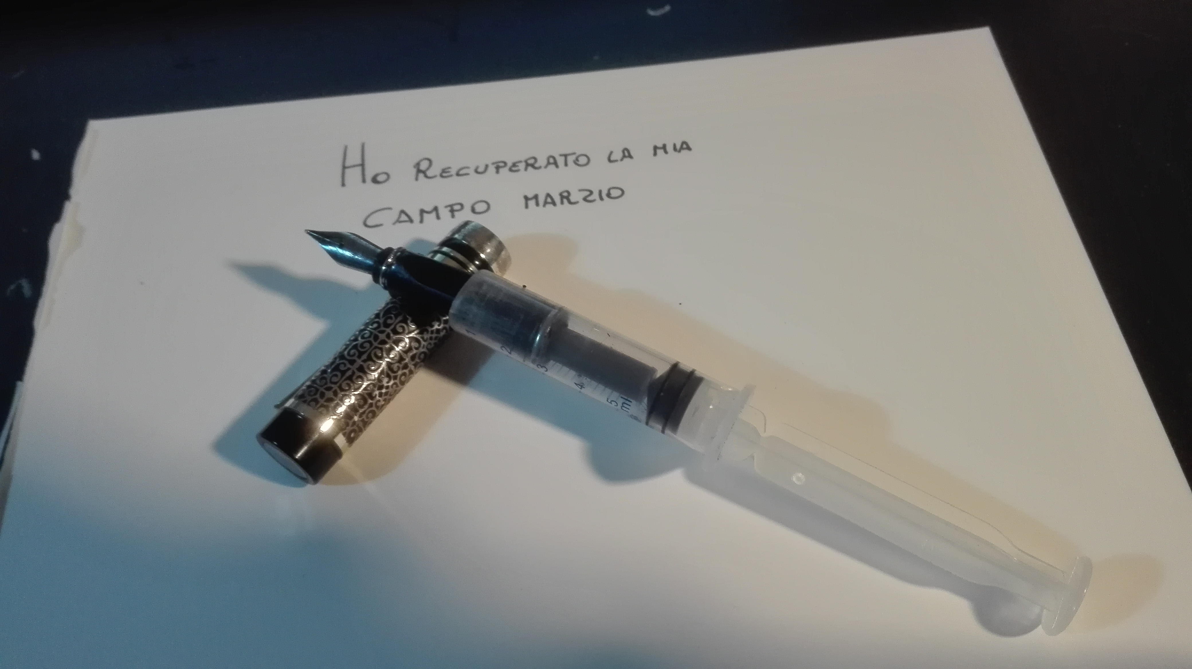 L'ho fatto pure io incorporando il fusto della siringa dentro il corpo della penna, l'estremità della siringa di plastica attaccata al pennino. Bell'idea. Poi ci sono pistoni per le siringhe che sono di metallo, paiono quelli montati sulle Noodler's, sembrano adatti allo scopo.