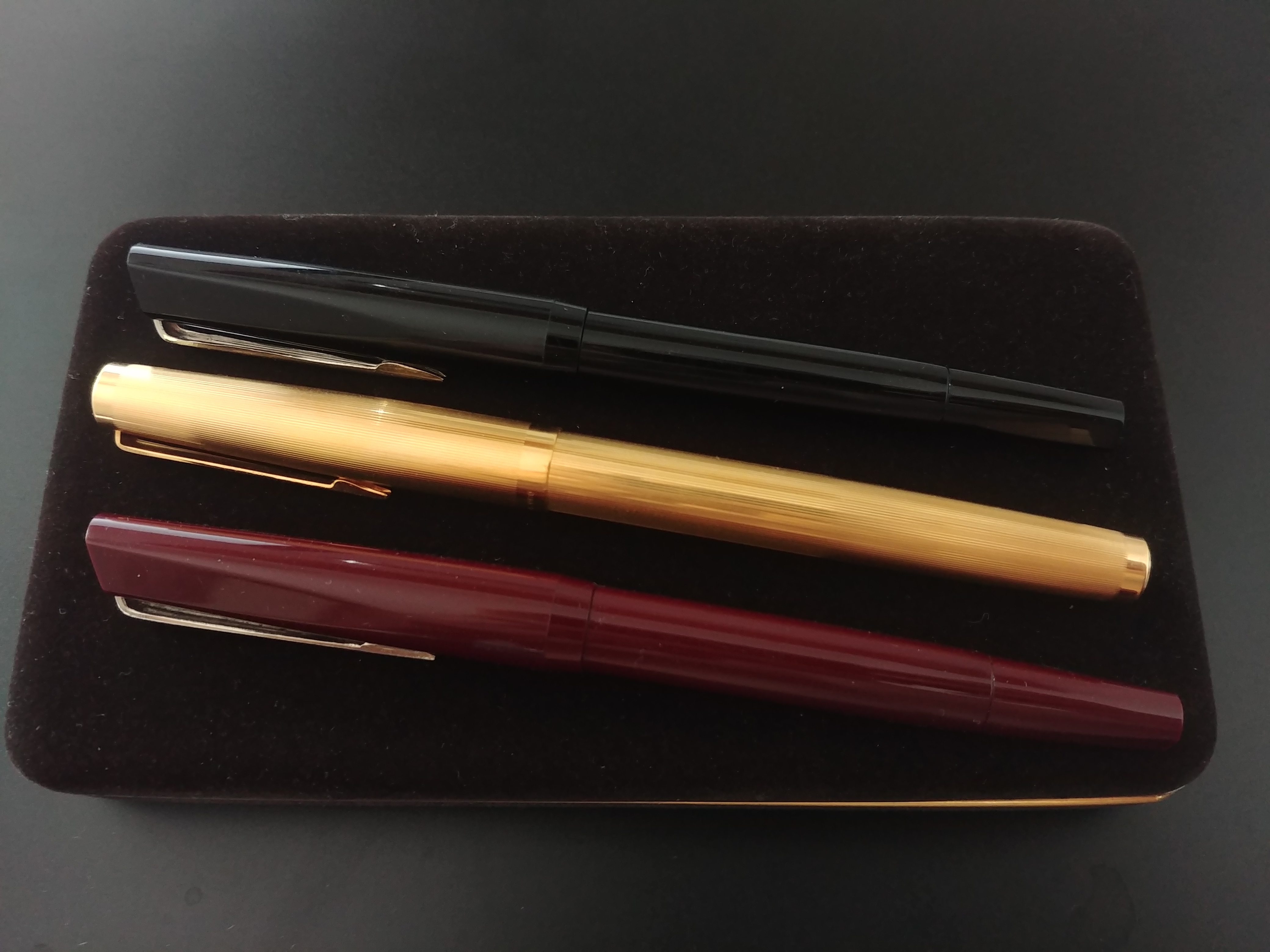 Grazie! Sono tre Montegrappa, due Cortina ed una che non riesco ad identificare, le uniche scritte indicano che è placcata in oro, ma non dicono nulla sul modello!