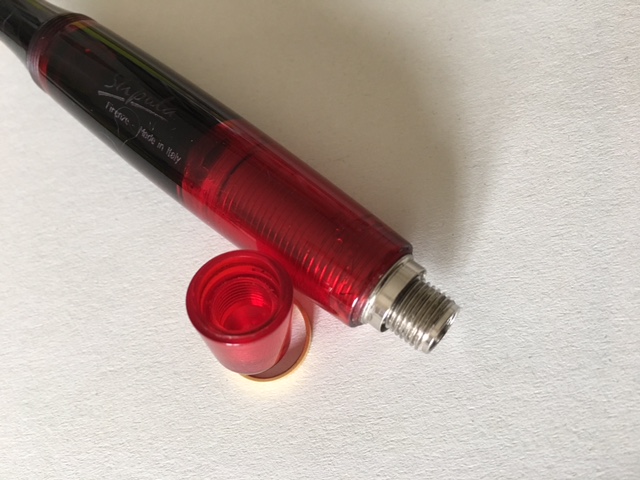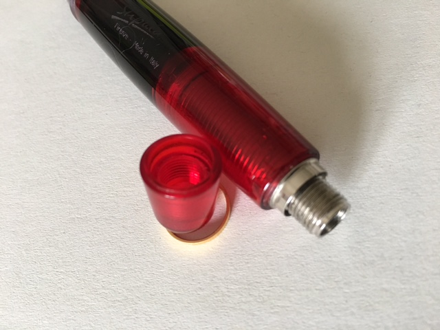 Ho un problema con il fondello che copre il pistone della mia Stipula Etruria. Il problema e' rappresentato dalle foto: azionando il meccanismo del pistone, il fondello mi si e' ...svitato... non lo ho forzato, e sono consapevole che il pistone della Stipula funziona al contrario (girando in senso orario, il pistone scende). Non c'e' nessuna parte rotta. solo, ora per azionare il pistone devo agire direttamente sulla parte metallica, con grande difficoltà'. Io credo che la parte di celluloide (?) sia solidale con la parte metallica. Eppure il fondello di celluloide e' costruito per avvitarsi sulla parte metallica.