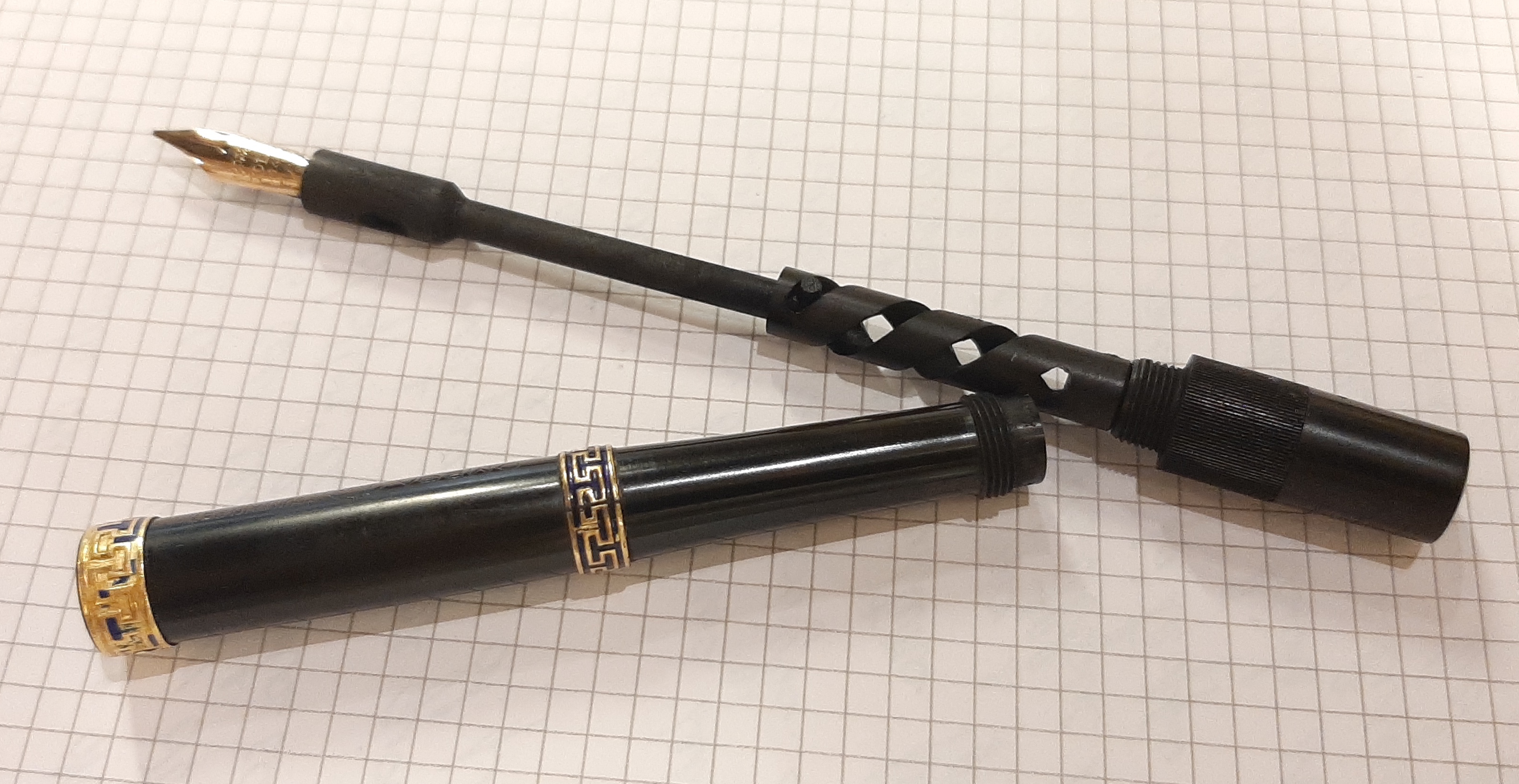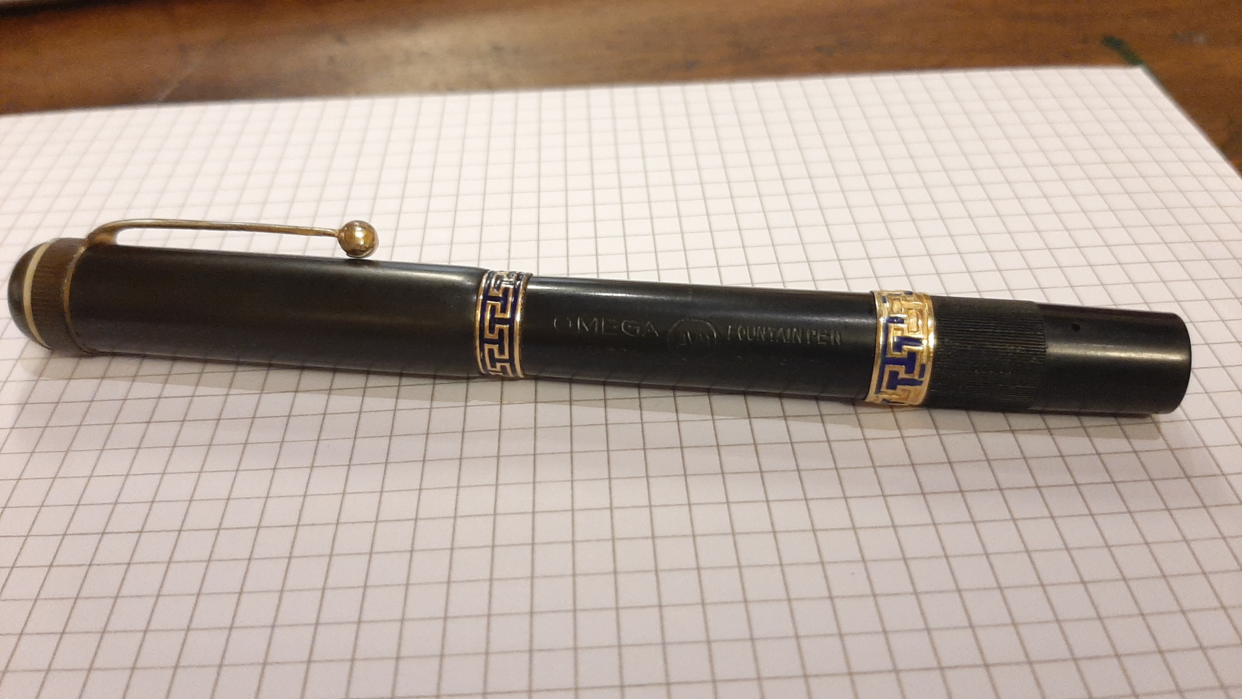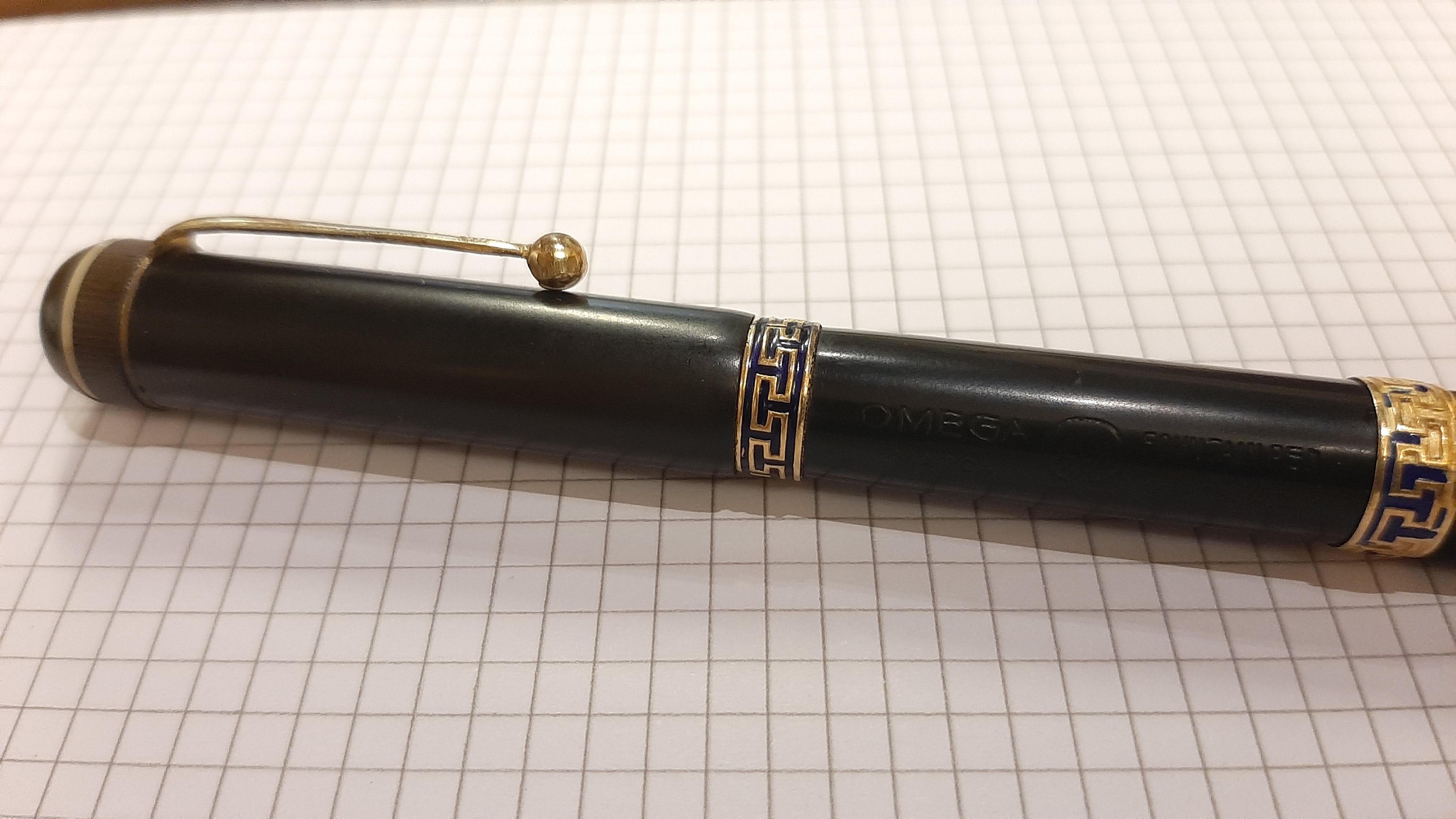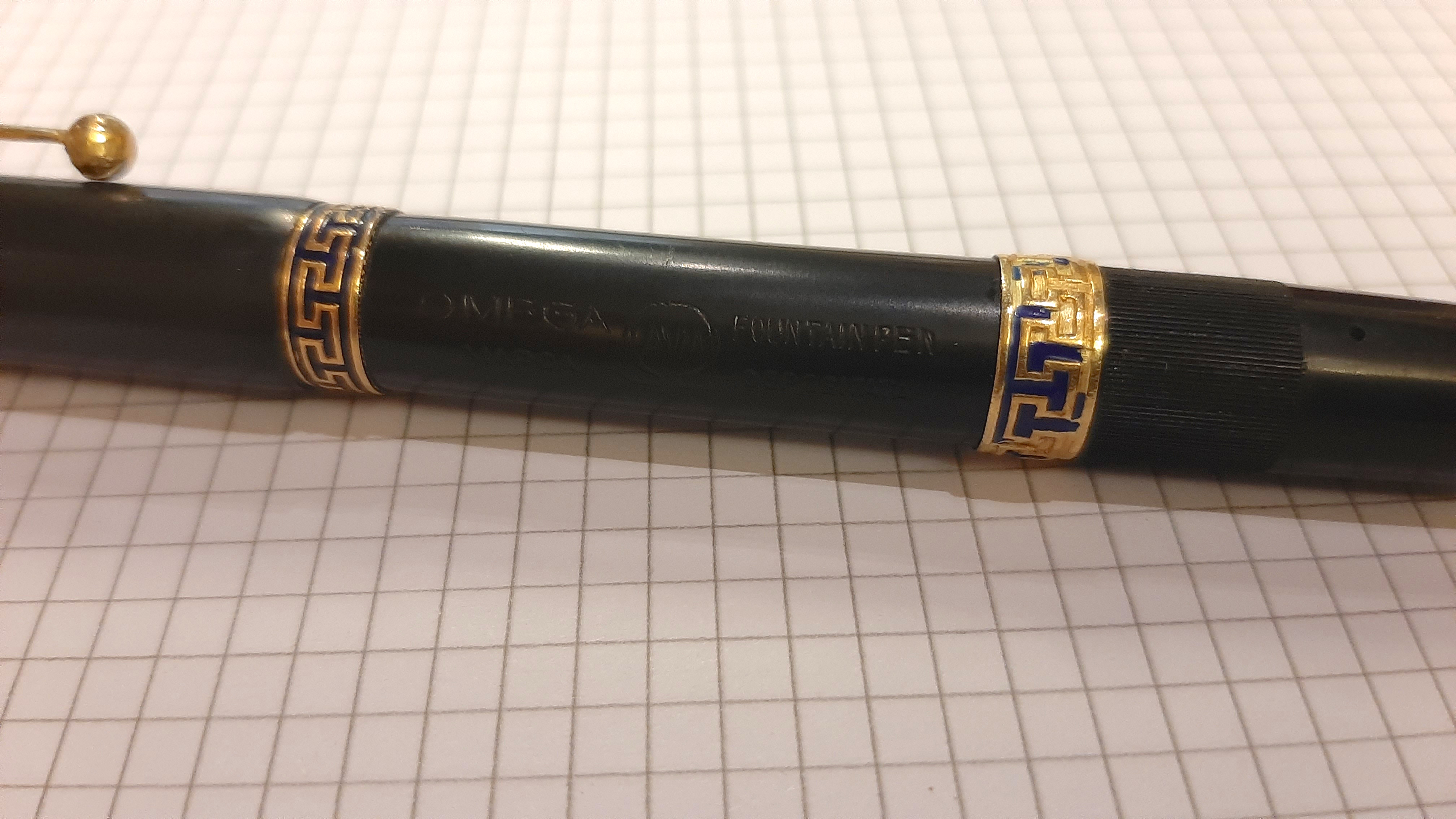 Una bella penna in ebanite con caricamento safety filler, peccato che il pennino non sia originale Omega e che gli smalti della seconda veretta siano andati. Il pennino è un Warranted Ideal New York 14 Kt mediamente flessibile e scrive molto bene. Sto valutando se cambiare la guarnizione in sughero, una notte carica d' acqua porterà consiglio...