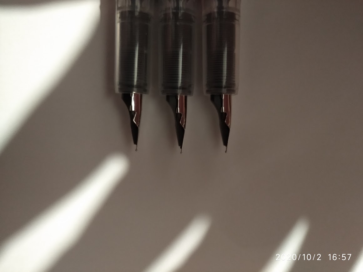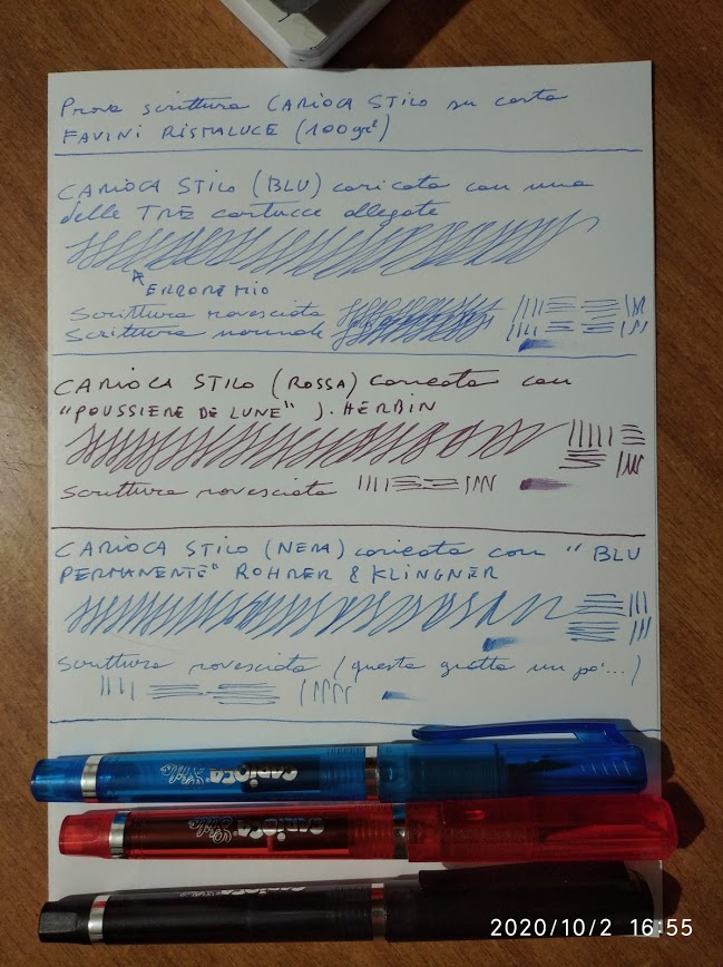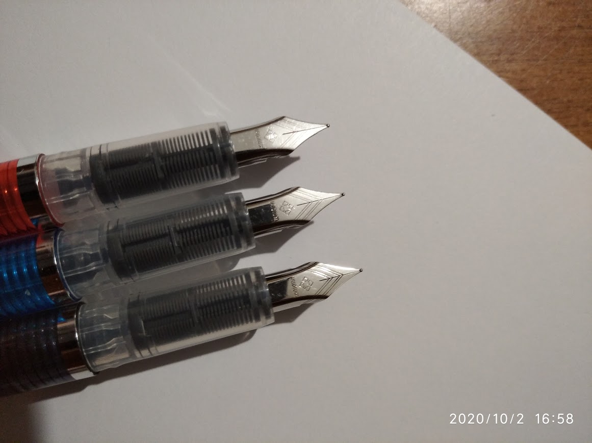 Le penne scrivono praticamente allo stesso modo, salvo che la rossa ha un flusso leggermente maggiore (ma può dipendere dall'inchiostro). I pennini volano sulla carta, senza alcun grattamento in qualsiasi senso ruotare il pennino (solo nelle scritture rovesciate un paio grattano a determinate inclinazioni).
