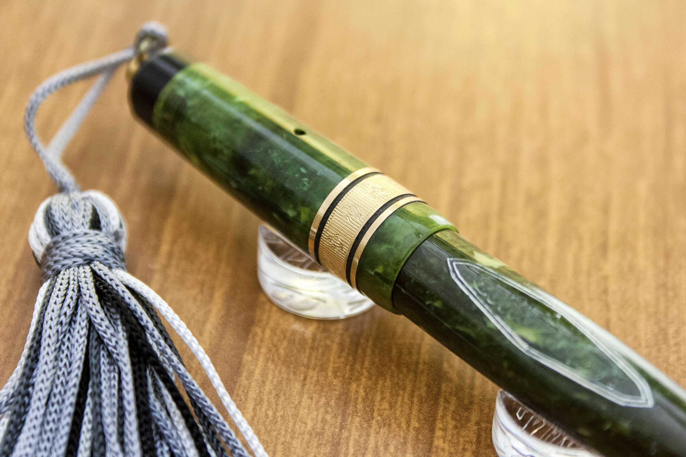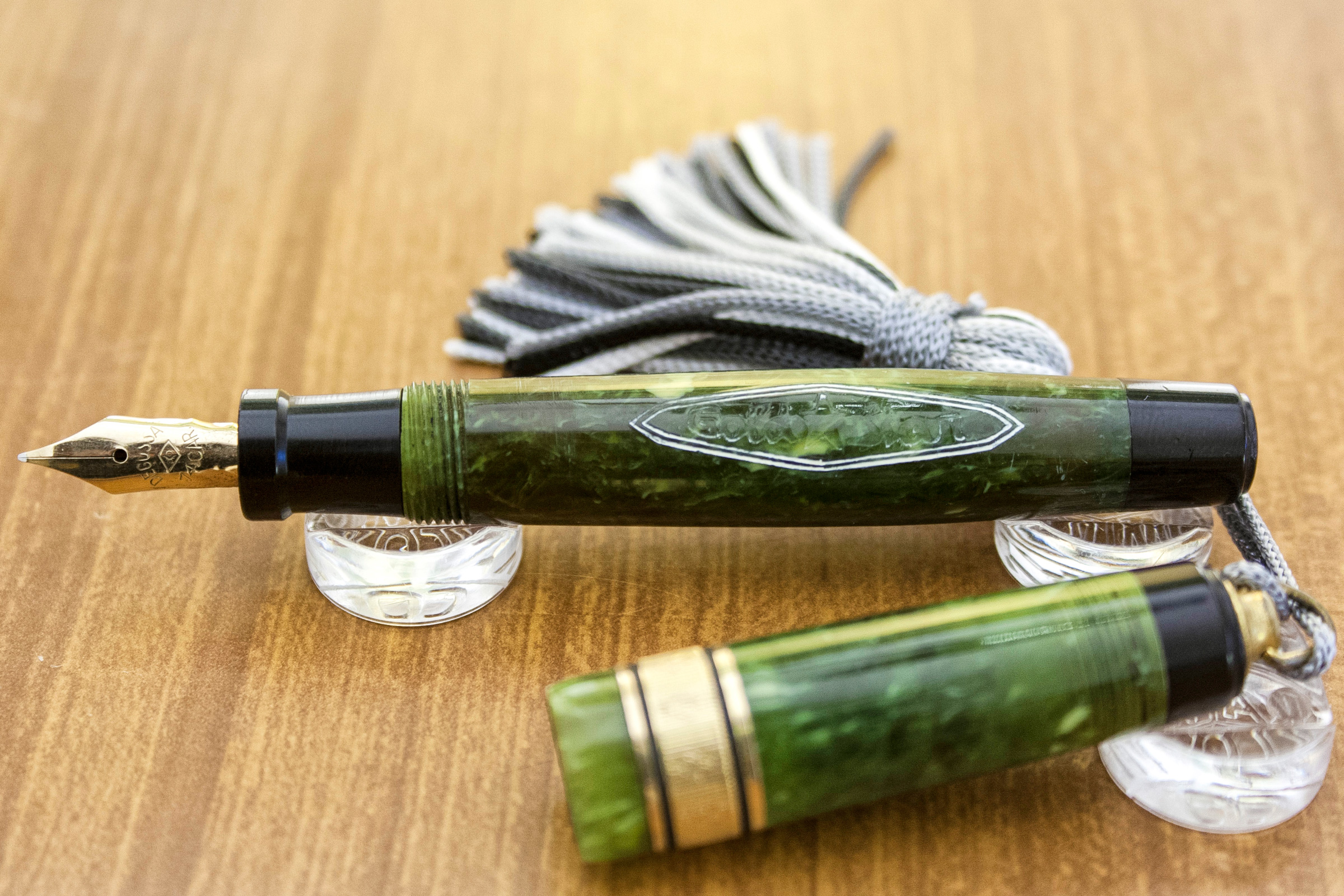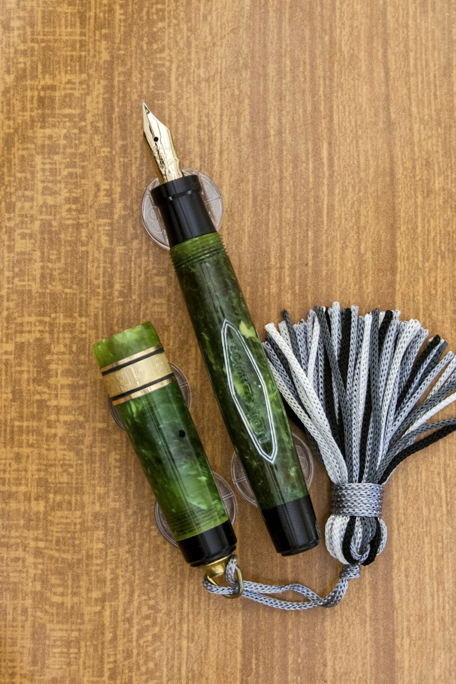 Una piccola e deliziosa stilografica degli anni trenta, prodotta per l'azienda fiorentina Banco Metalli Preziosi Fiani & Ciampi. Caricamento a pulsante di fondo, celluloide screziata verde (leggermente virata).