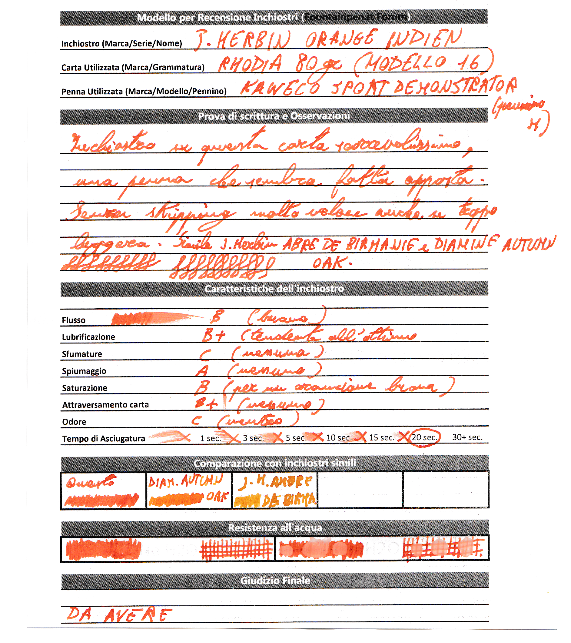 Io ho comprato questo inchiostro una settimana fa ed ero contentissima. Un bell'arancione, brillante ma utilizzabile tutti giorni. Purtroppo ho avuto una brutta sorpresa a fine carica di Pelikan M800 dopo 4 giorni. Col passare dei giorni l'arancione diventava sempre più scuro, fino a scrivere marrone al quarto giorno, marrone esattamente come il Pelikan Brilliant Brown.