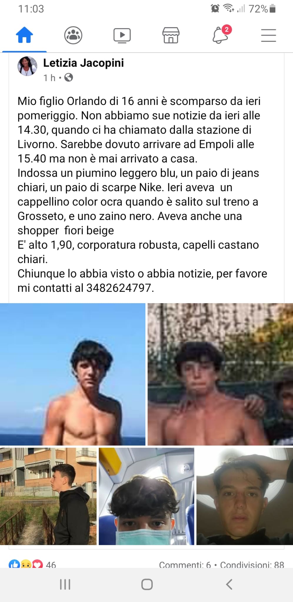 Il figlio di Letizia Jacopini è scomparso, da ieri pomeriggio non si hanno notizie, l'ultimo avvistamento è stato a Firenze nel pomeriggio al sottopasso della stazione Santa Maria Novella .