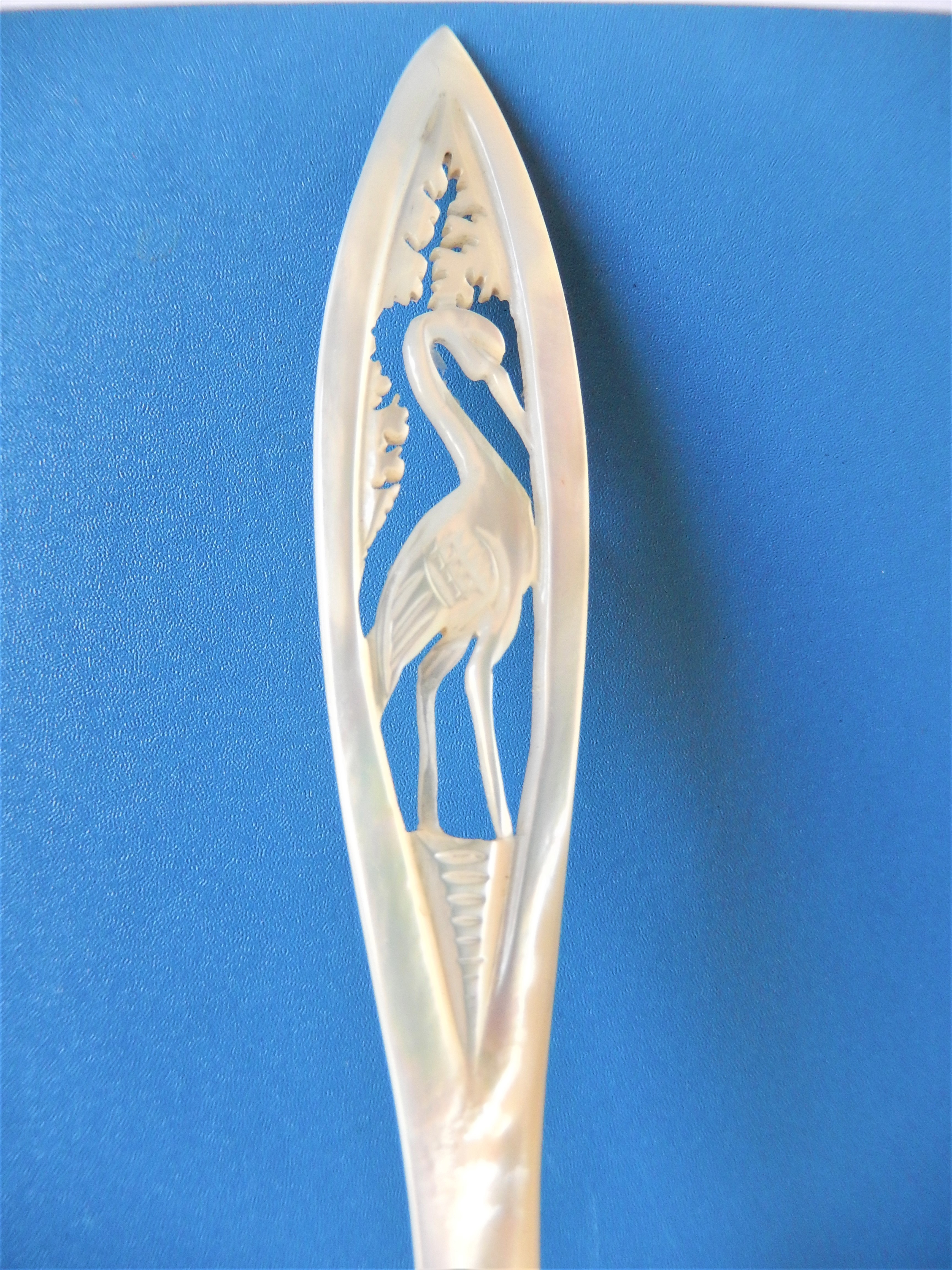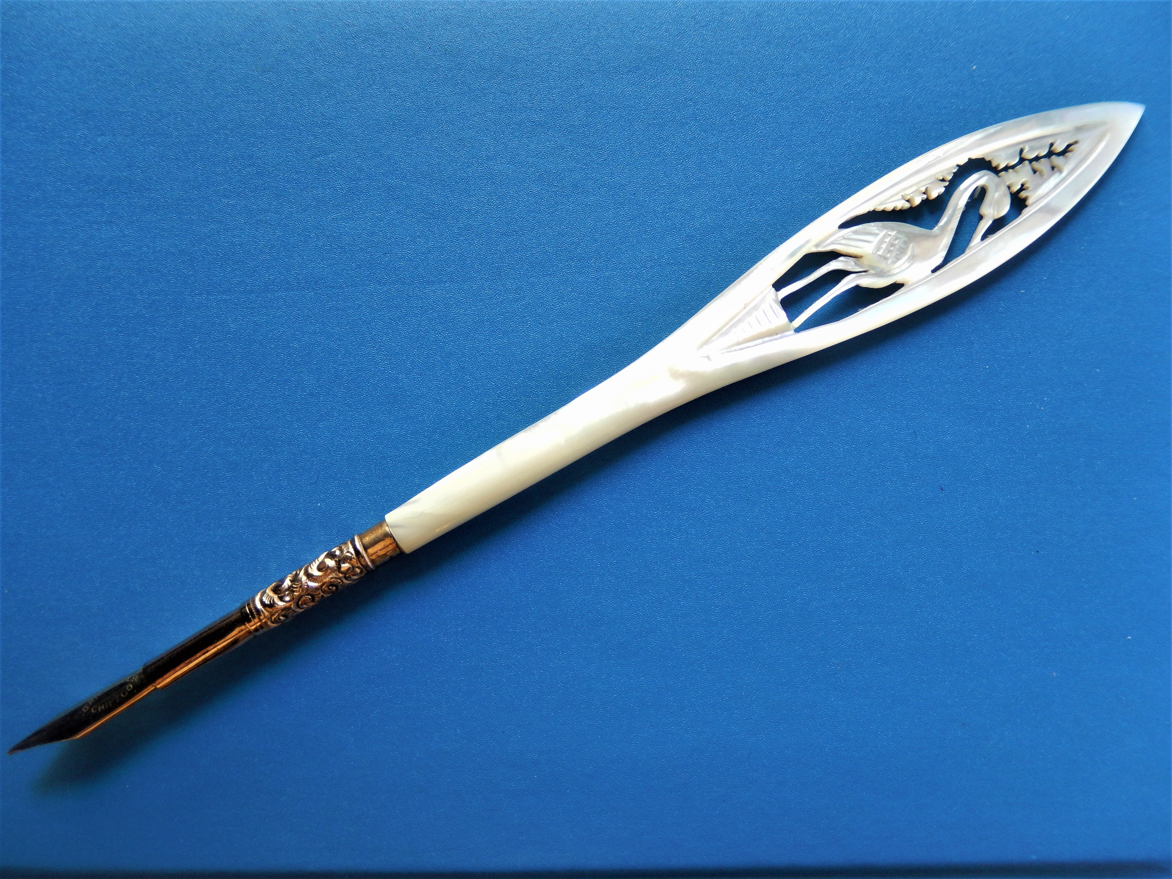 A quegli anni di fine ottocento appartiene questa splendida dip pen in oro e madreperla, lunga 16 cm, con intagliata l'immagine di una gru, animale da sempre al centro di mitologie e antiche leggende narrate già da Omero e Plutarco.