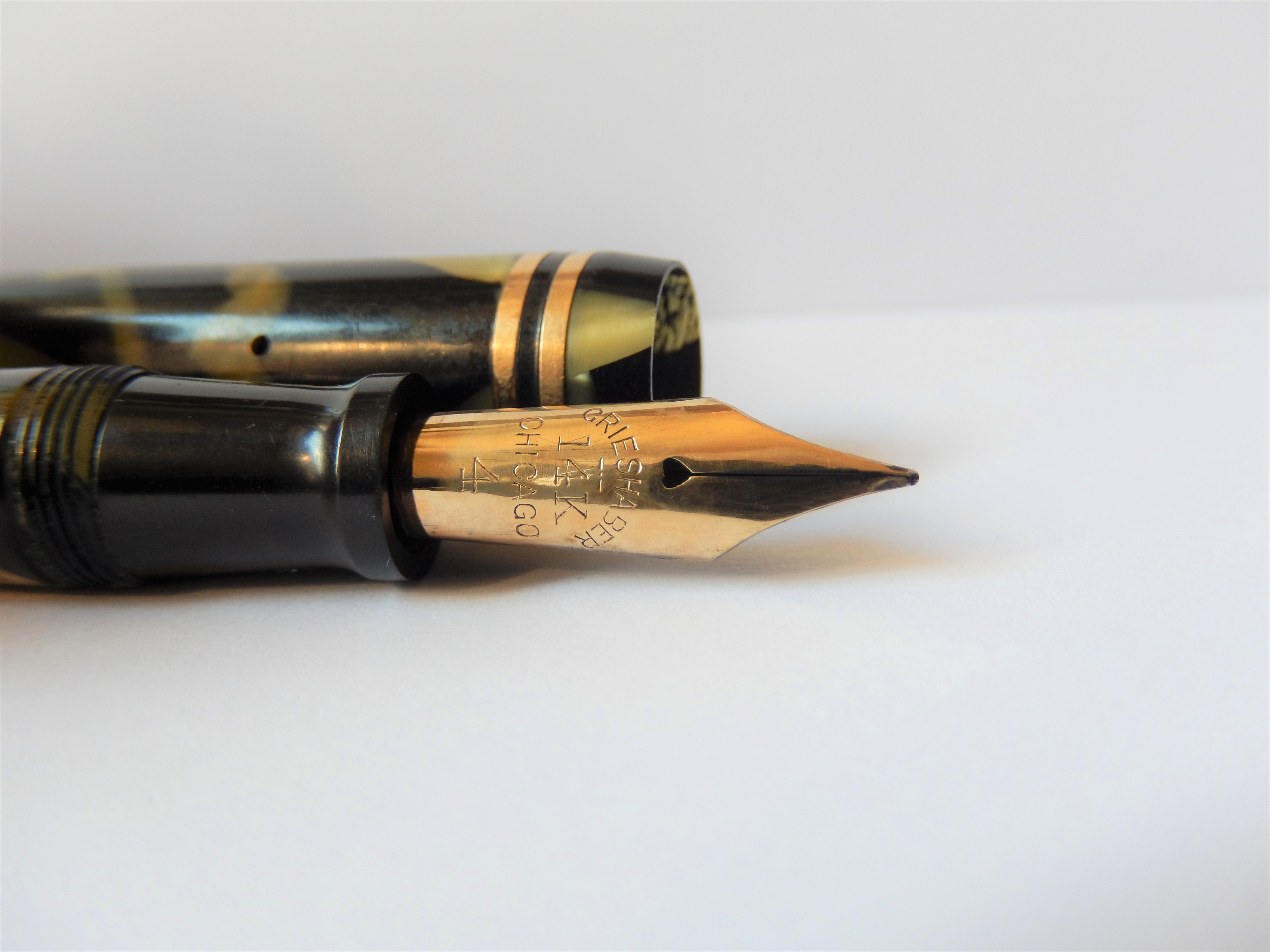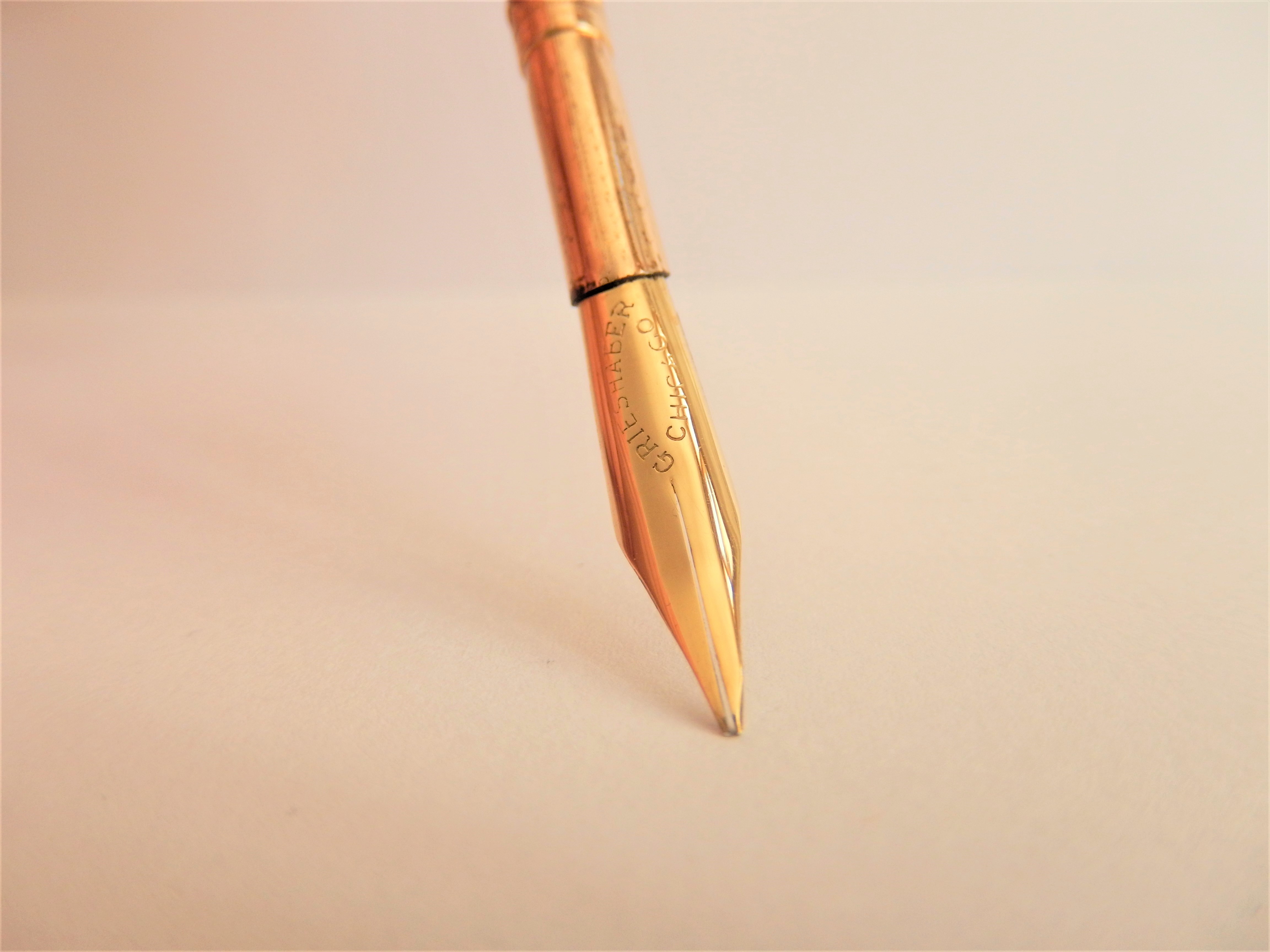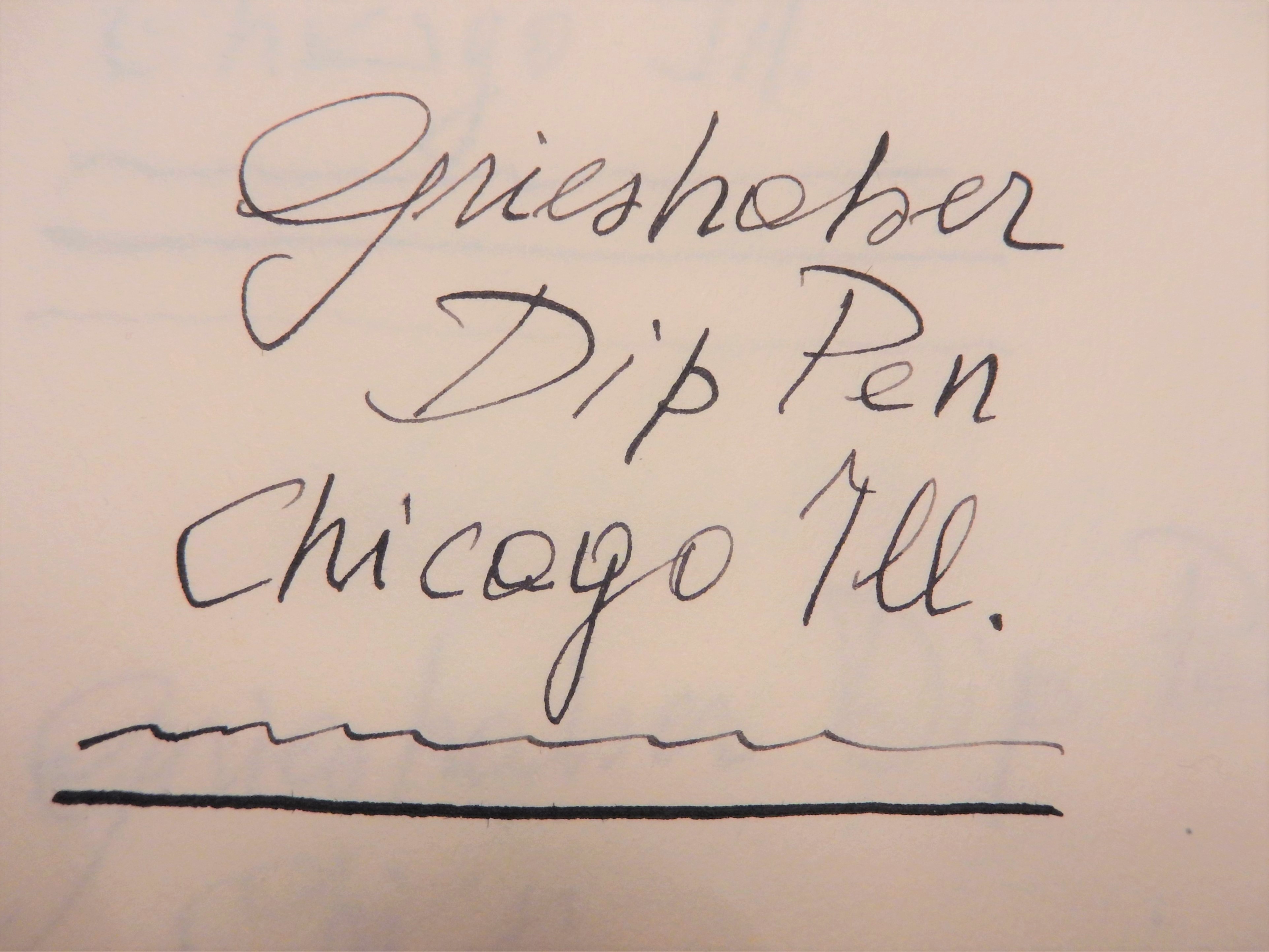 Sul corpo, ben equilibrato, ancora ben leggibile " Grieshaber Pens / Chicago Ill." Pennino con sfiatatoio a cuoricino, con impresso " Grieshaber/ 14 K /Chicago/ 4, con abbondante presenza di iridio, grande scorrevolezza e piacevolissima flessibilità. Per concludere e a conferma della qualità Grieshaber vale la pena di ricordare che nella sua autobiografia del 1937 W.A. Scheaffer racconta che a lungo molti pennini Scheaffer's furono commissionati proprio alla Grieshaber. [attachment=0] .Un saluto a tutti, Luigi
