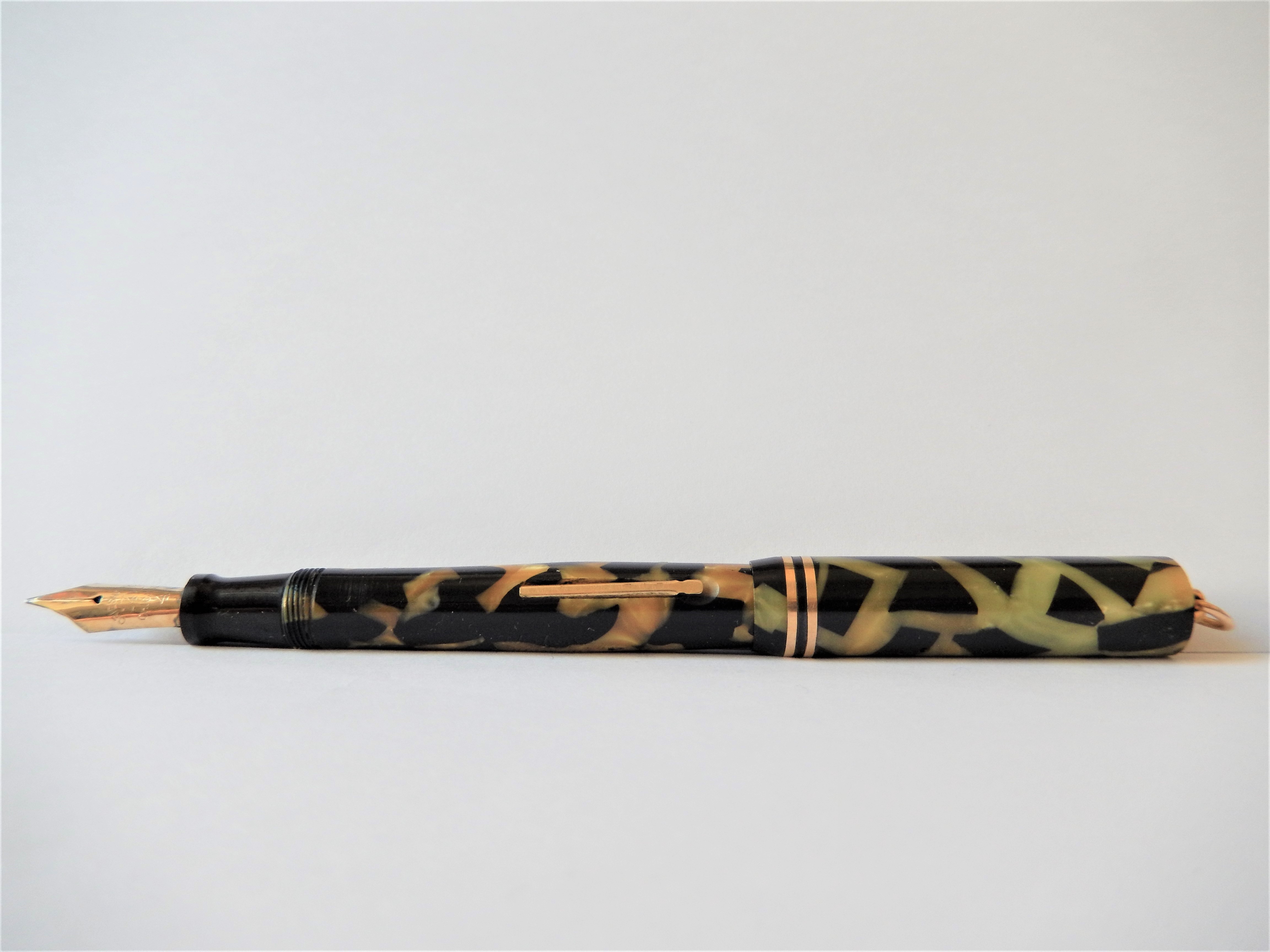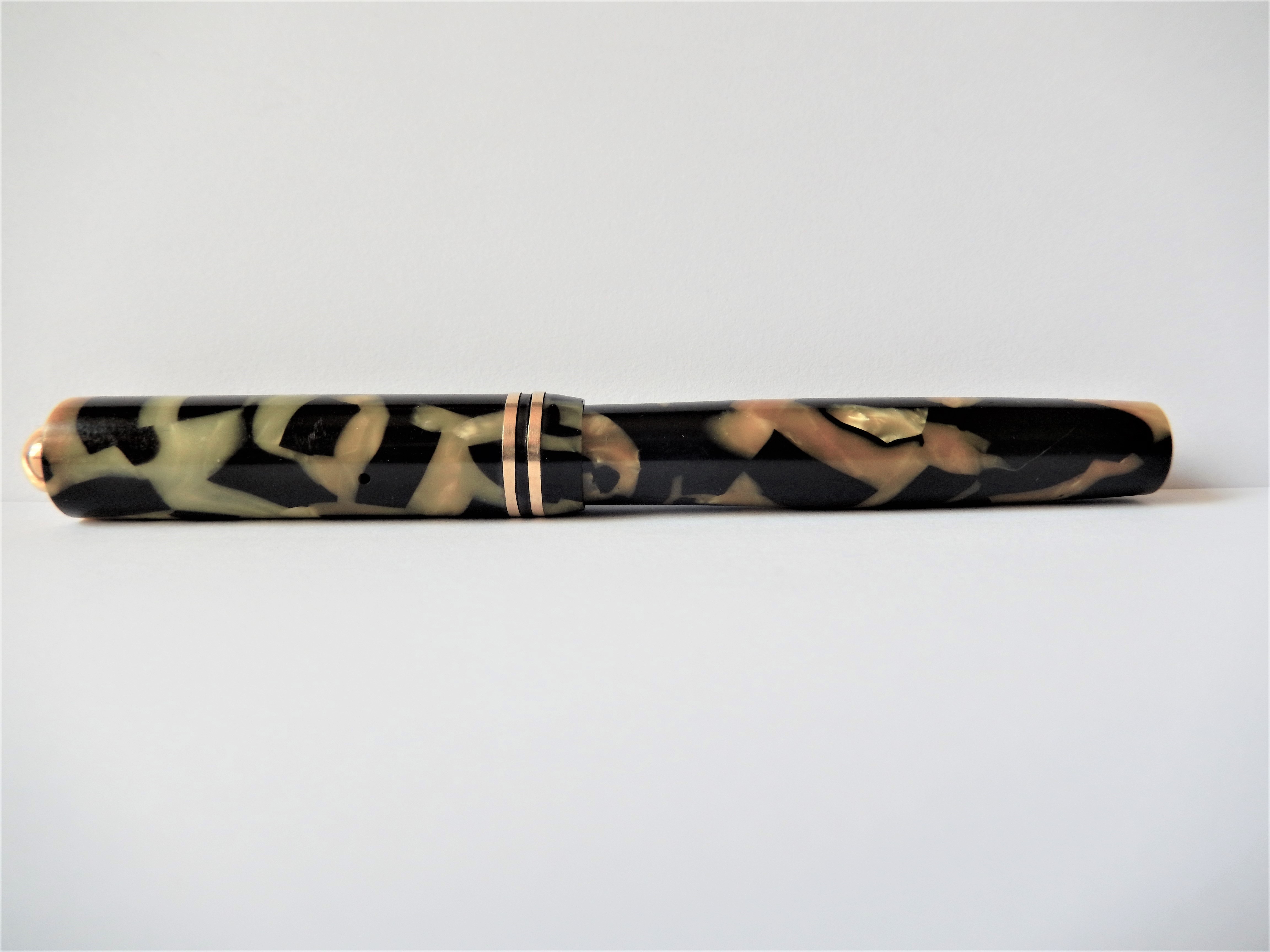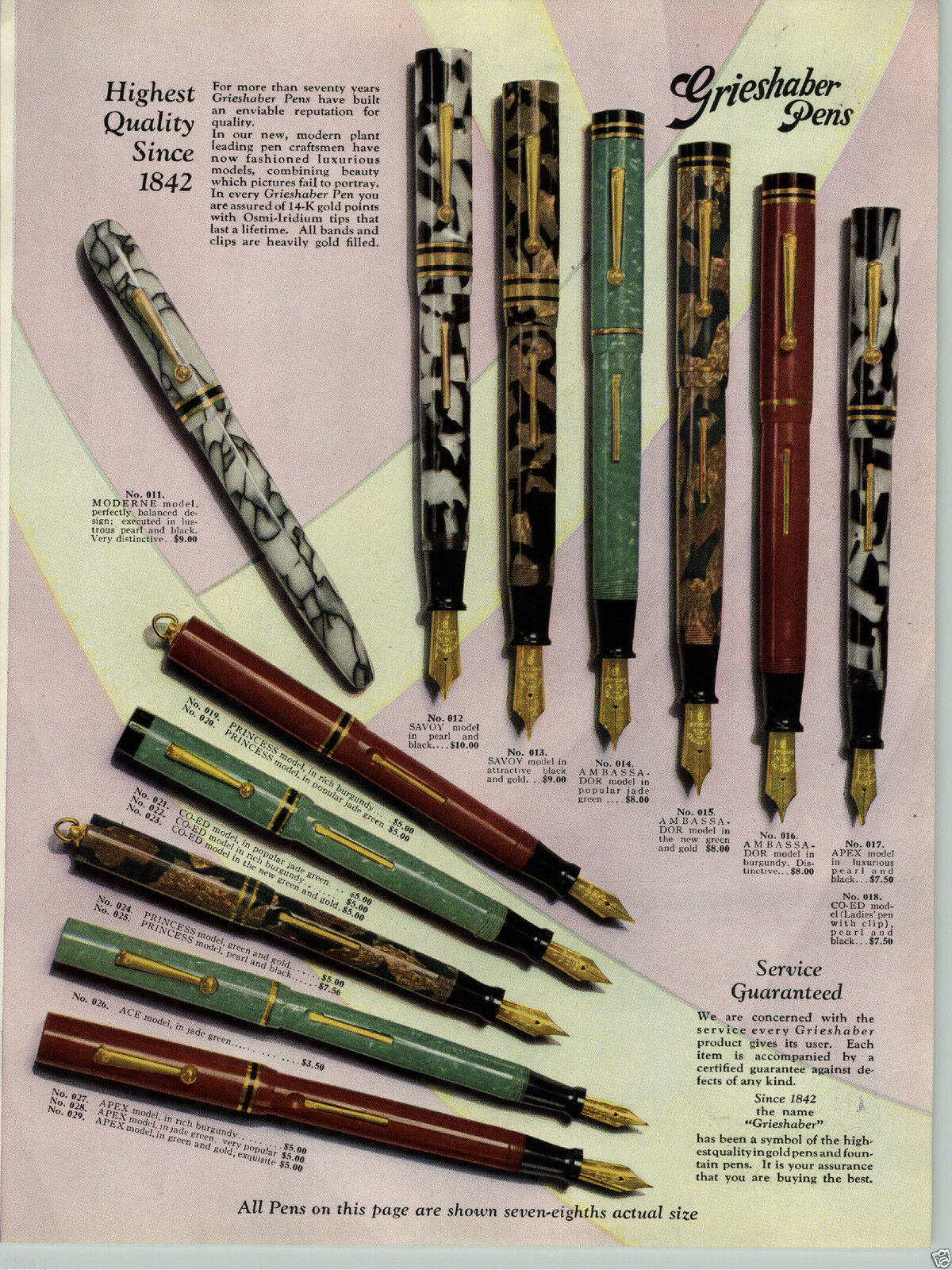 dove però al posto dell'anellino per bloccare o sbloccare la " gobba" si ruota una rondella posta all'estremità del corpo. I sistema di caricamento a leva fu invece utilizzato dalla Grieshaber ai primi degli anni venti ed a questa tipologia appartiene il modello PRINCESS. La penna in visione è lunga chiusa 11,3 cm, di colore black and pearl e veniva venduta a 7,50 dollari, come risulta da questa pubblicità ( a disposizione del wiki) che il venditore, solitamente affidabile, attribuisce al 1931. Da notare che gli altri colori venivano venduti a 5 dollari. Cappuccio lungo 5,3 cm, con due bande dorate e anellino sovrastante che ho trovato con l'originario lunghissimo laccio doppio di circa 50 cm.