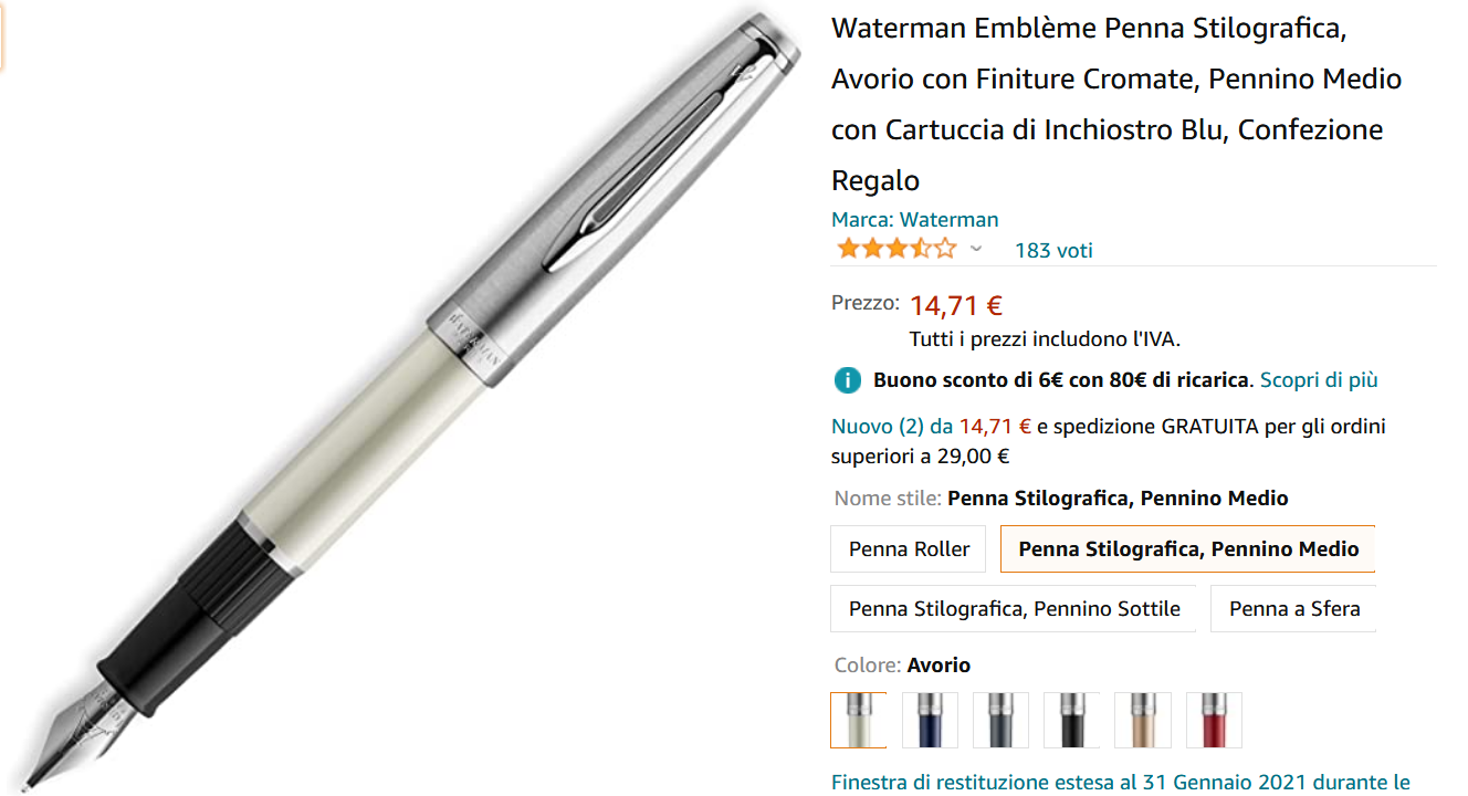 Screenshot_2020-10-23 Waterman Emblème Penna Stilografica, Avorio con Finiture Cromate, Pennino Medio con Cartuccia di Inch[...].png