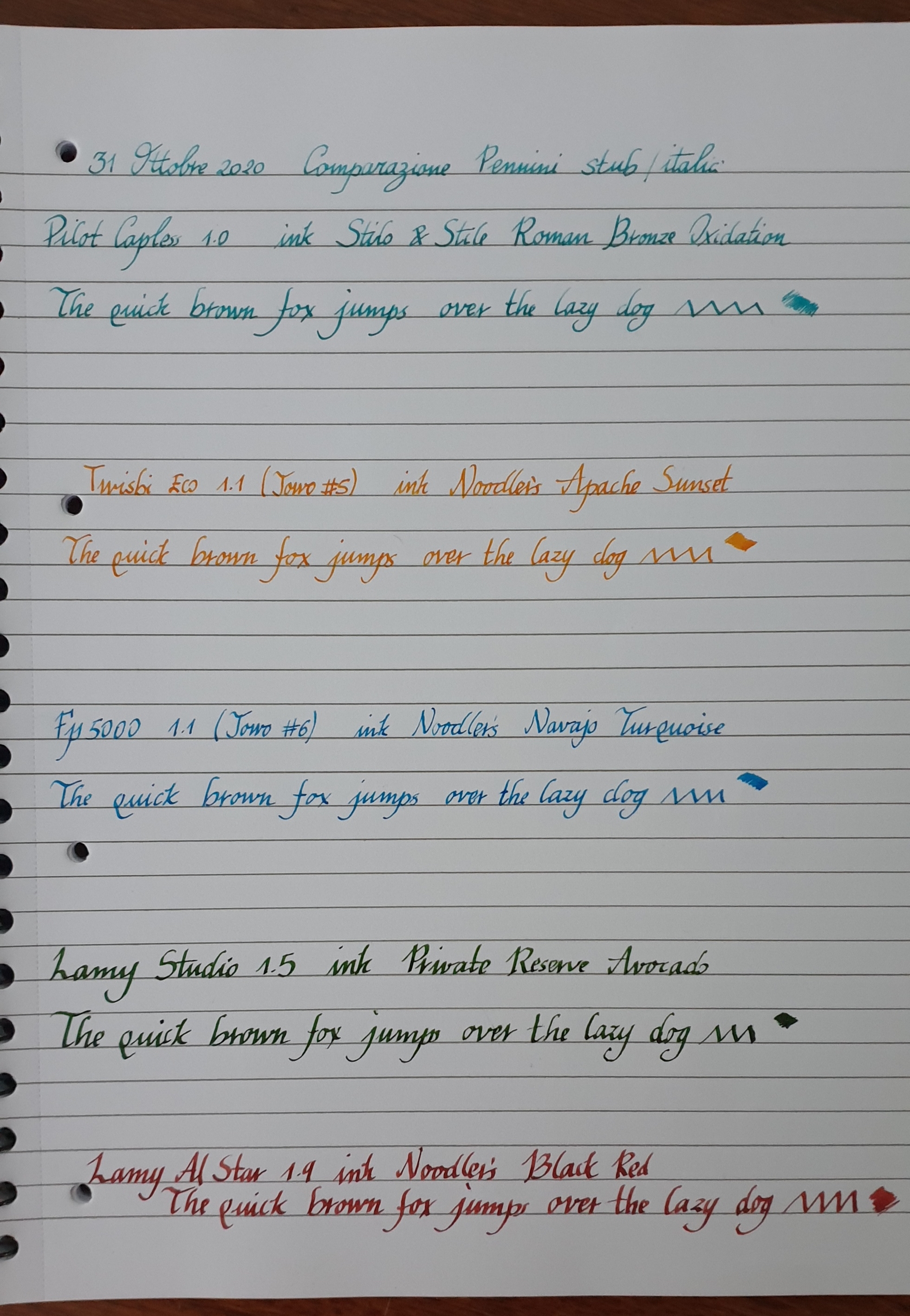 Non una comparativa, poiché ho solo questo, ma una paginetta scritta con lo stub Lamy 1.9 È davvero particolare scrivere con questi stub, con gli inchiostri giusti si creano effetti piacevoli. Certo, ci vuole la carta giusta con gli stub grandicelli, e non è una scrittura "da corsa". Ora, devo solo imparare a scrivere meglio 😁