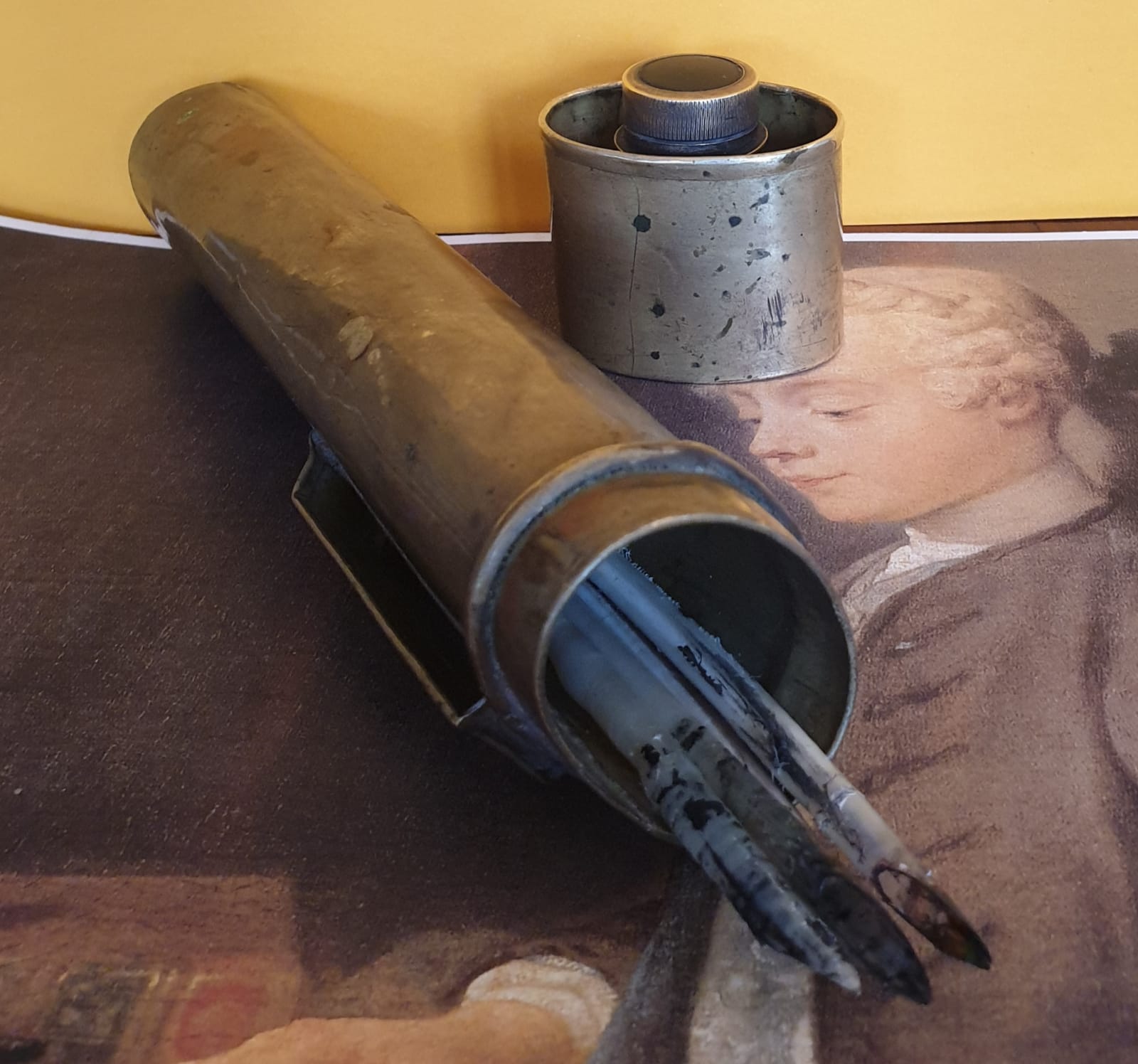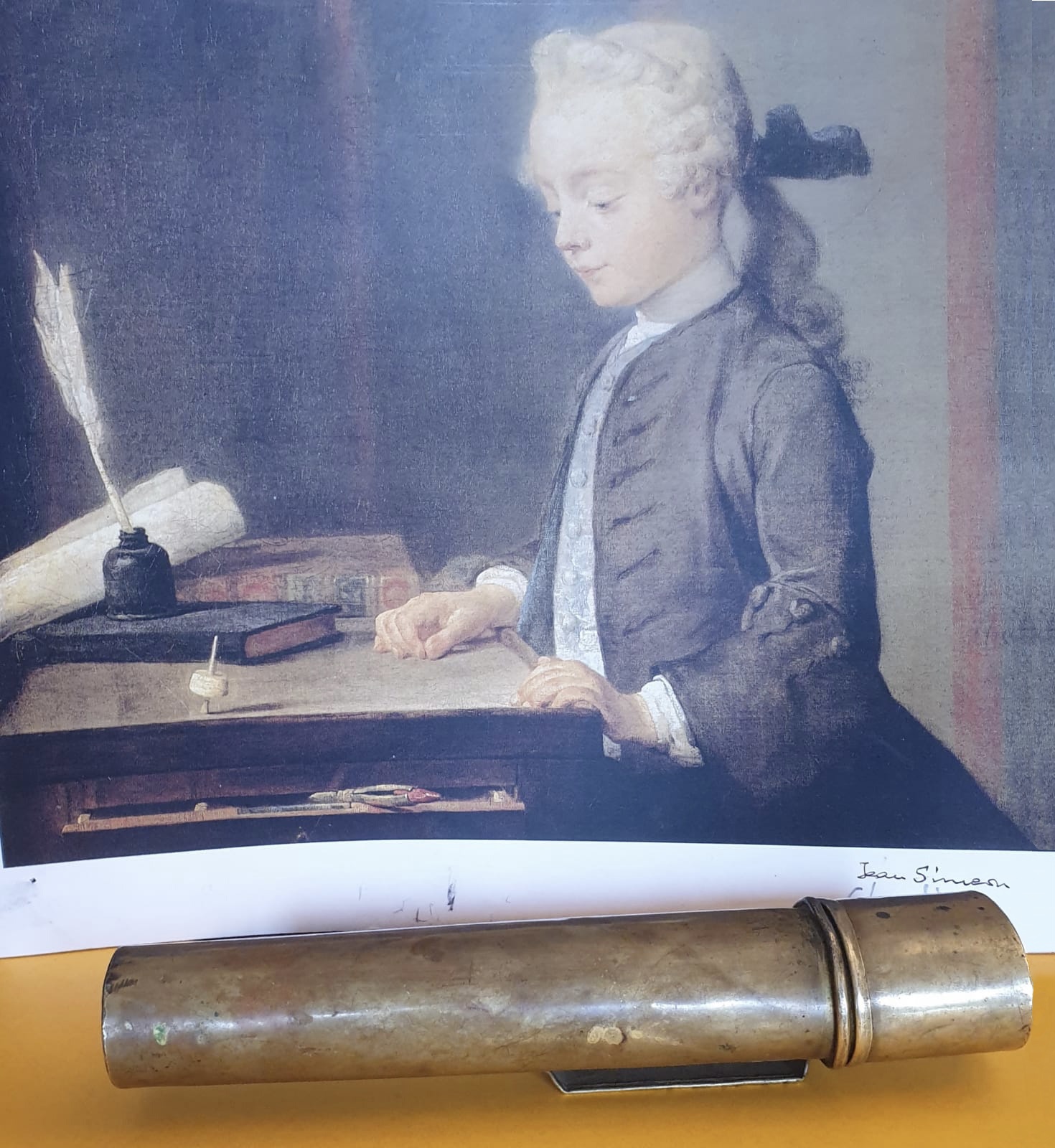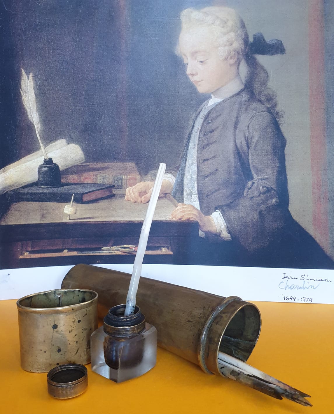 Set scrittorio da cintura, probabilmente unico. Con riproduzione di opera di Jean Simeon Chardin, XVIII° secolo.